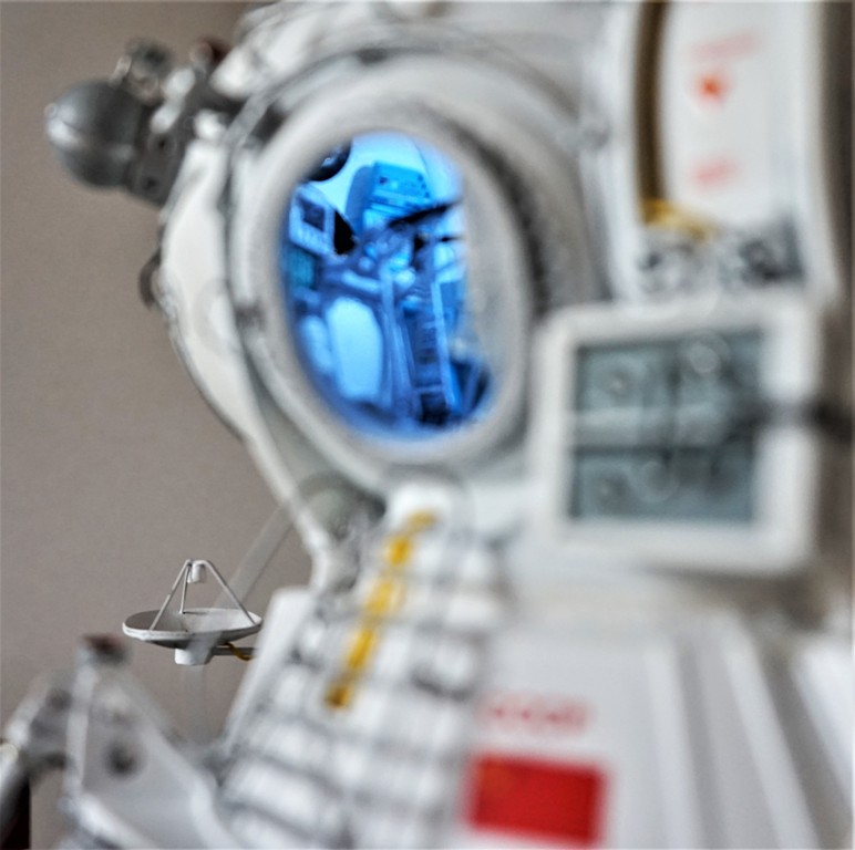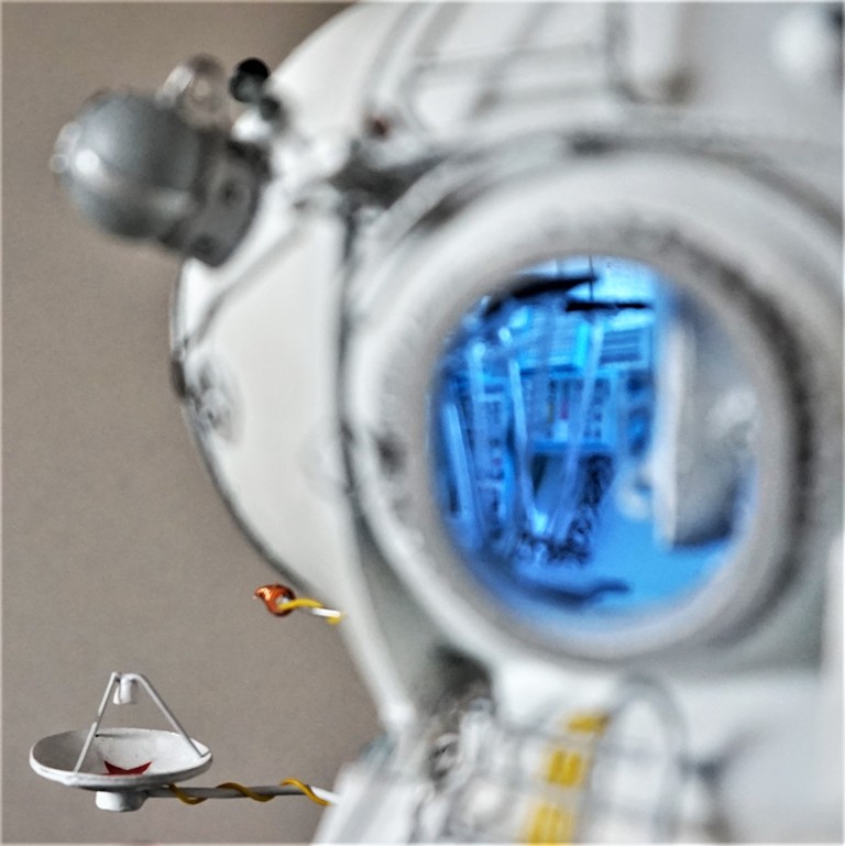 Корабль в собранном виде (остронаправленные антенны сложены, лестница сложена, выходной люк из кабины космонавта закрыт и только в смотровом иллюминаторе светится огонек)