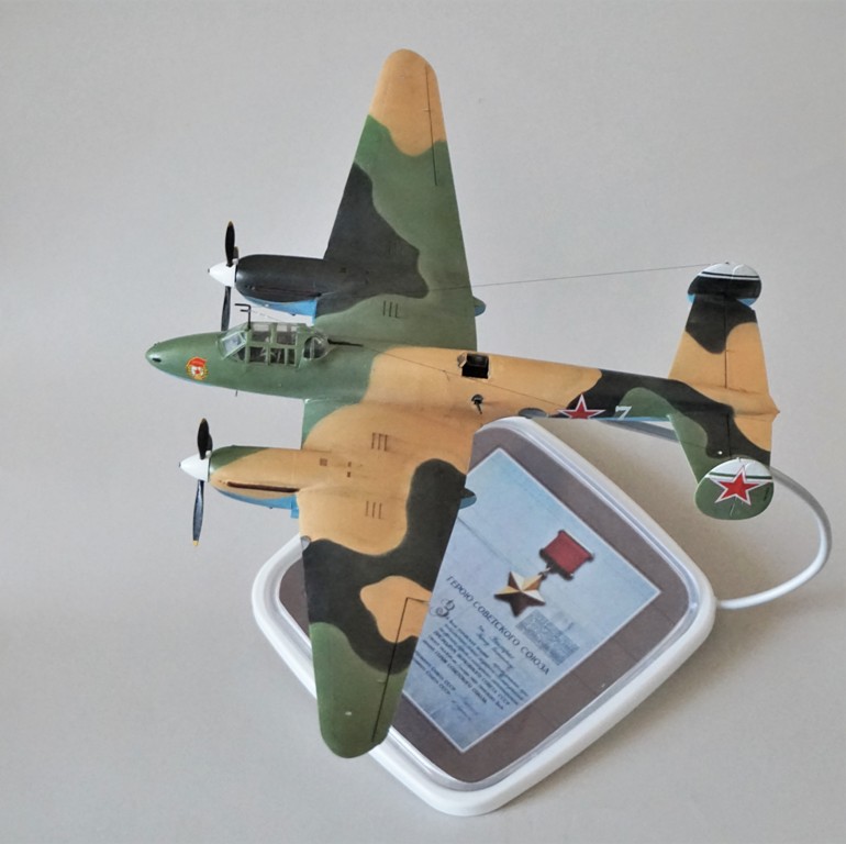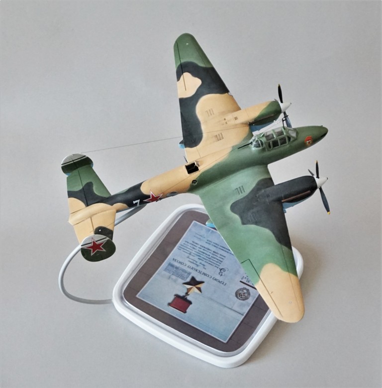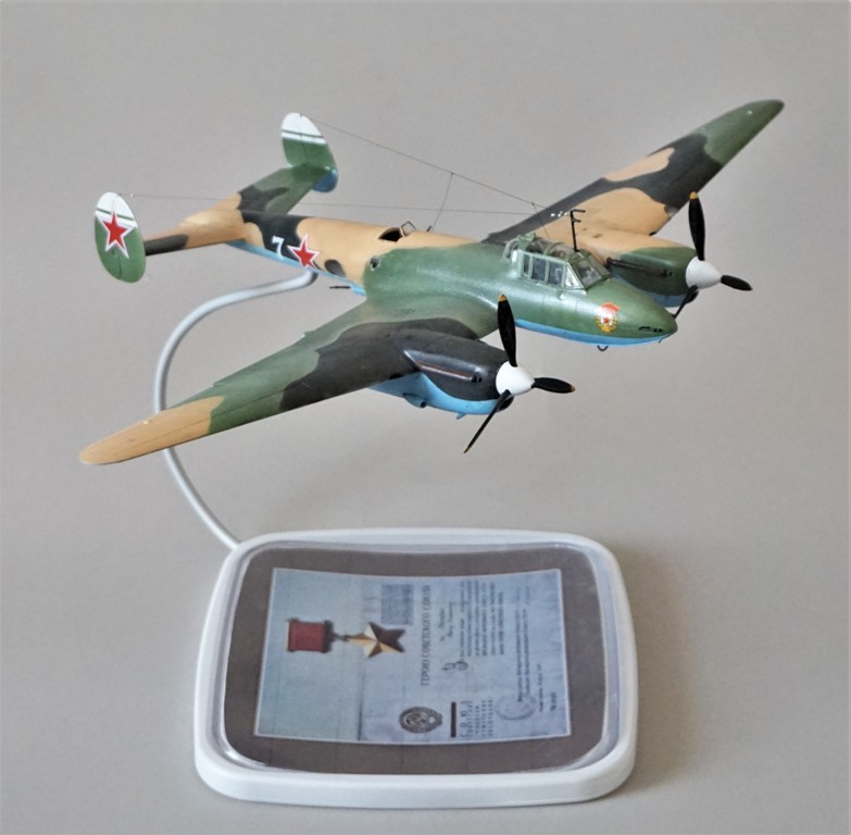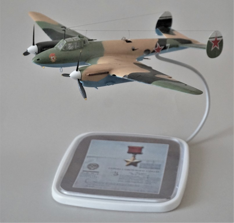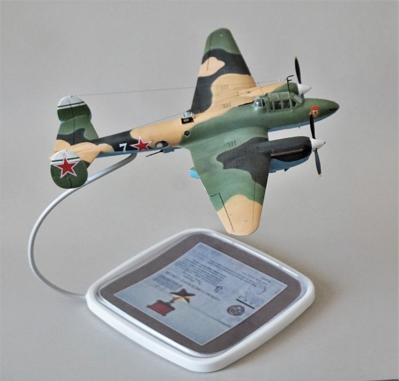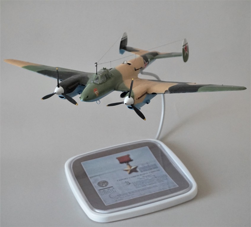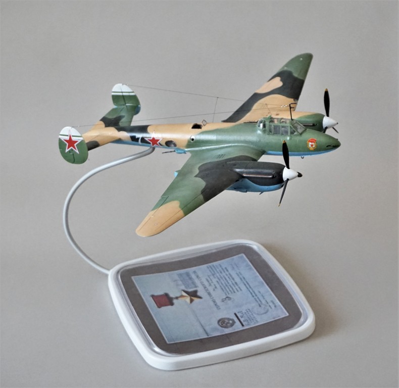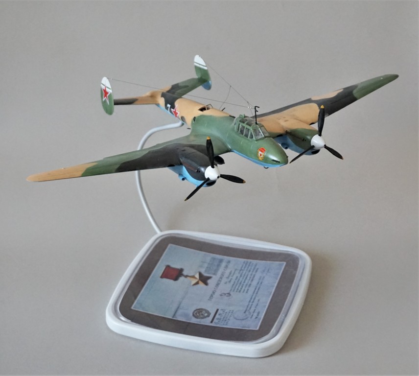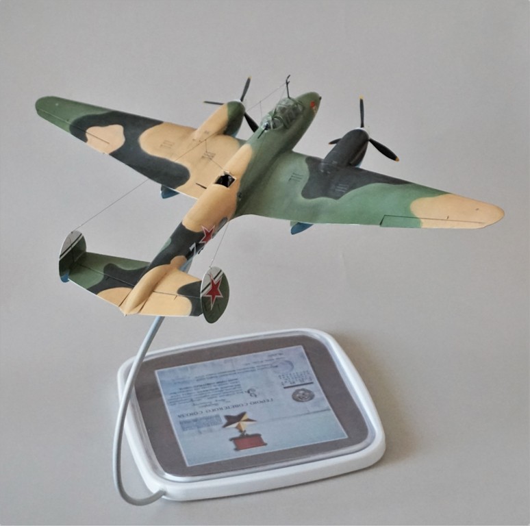 Данная модель бомбардировщика Пе-2 собрана для включения в экспозицию музея У-Удэнского отделения ВСЖД. Сборка "изкоробочная", добавлена только подставка с фотографией наградной грамоты Героя Советского Союза Б.С. Быстрых.