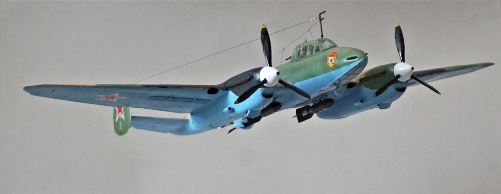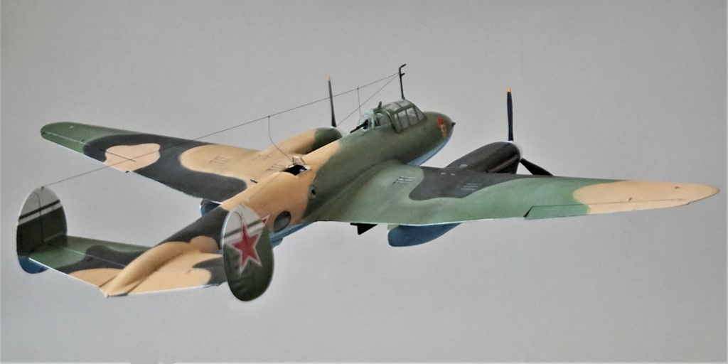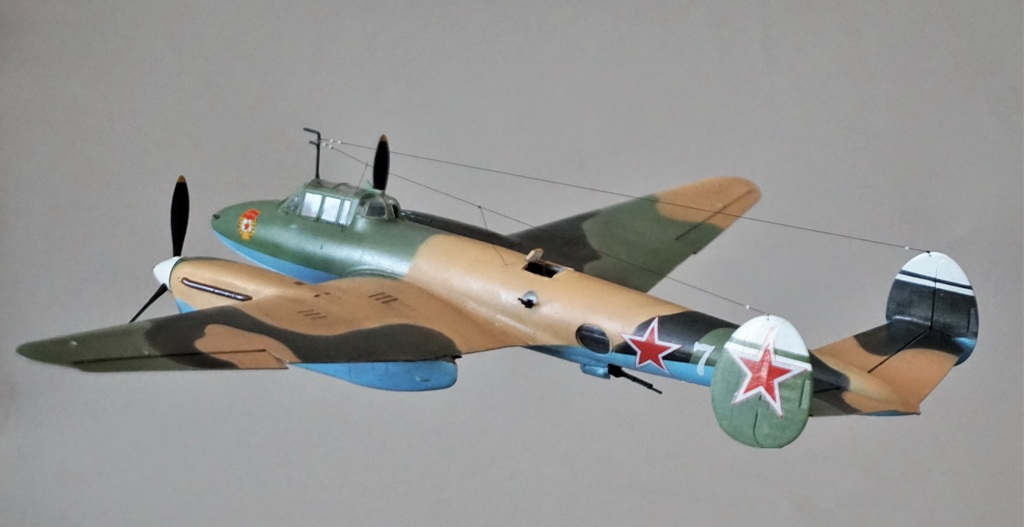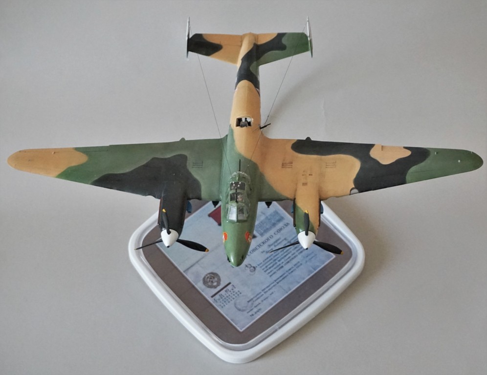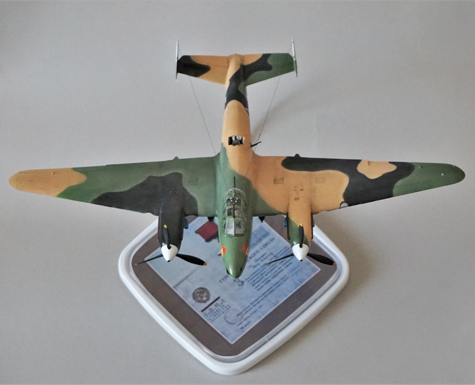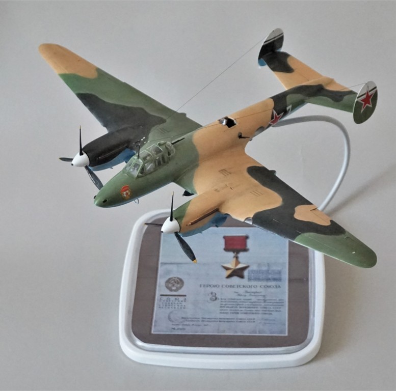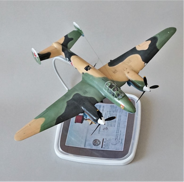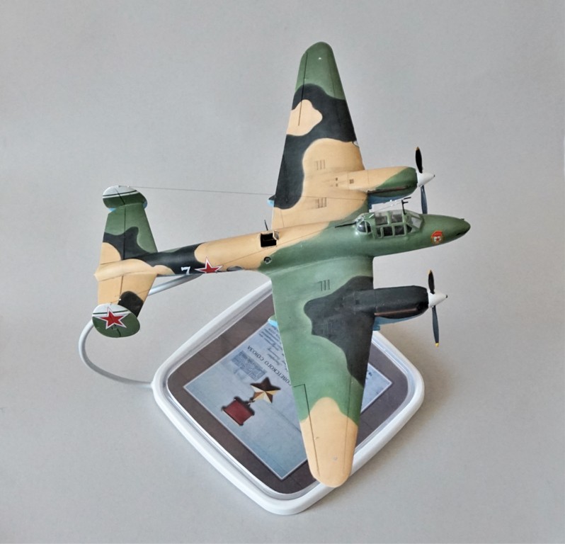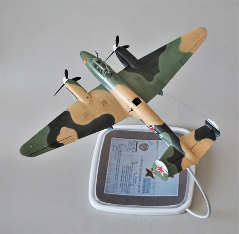 Данная модель бомбардировщика Пе-2 собрана для включения в экспозицию музея У-Удэнского отделения ВСЖД. Сборка "изкоробочная", добавлена только подставка с фотографией наградной грамоты Героя Советского Союза Б.С. Быстрых.