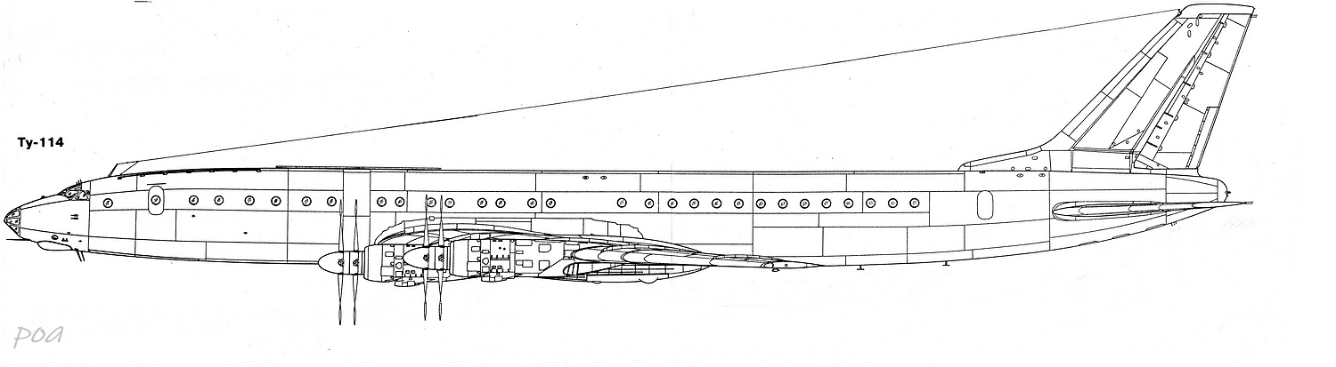 Нормальных чертежей Ту-114 я не встречал (это не значит, что они не существуют). Более 20 лет назад я начертил Ту-126 по заказу редакции АиВ. Они прислали мне копии заводских калек Ту-114. Поэтому общую геометрию Ту-126 (Ту-114)можно брать за основу (АиВ №2 1999г.). Ну а расшивку и детали скорее всего придется корректировать. Двадцать лет назад доступ к информации был гораздо скромнее.