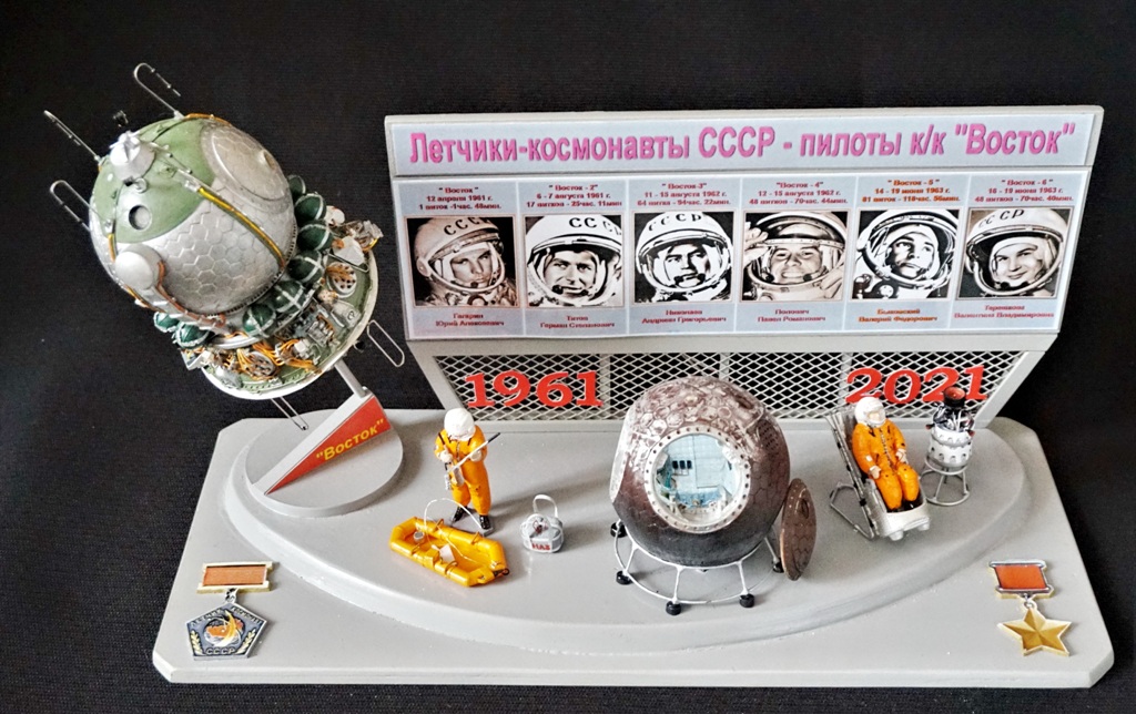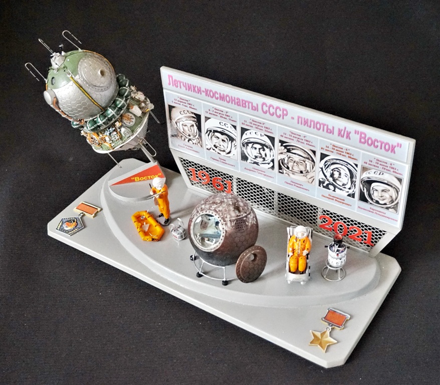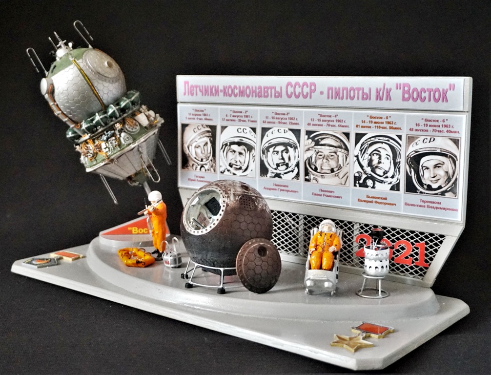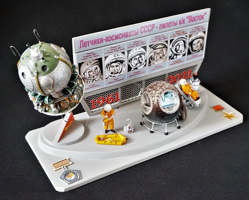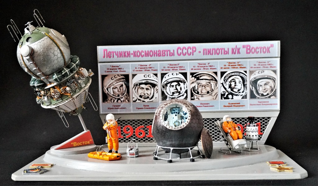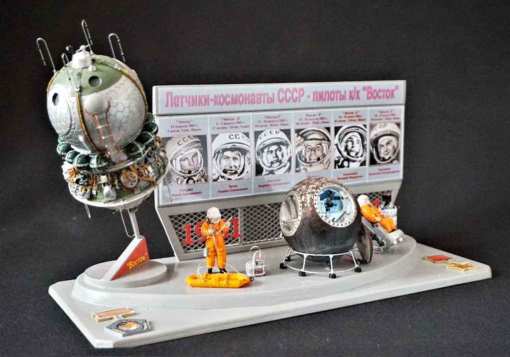 В работе использованы смоляной набор "Восток-1" с интерьером СА ,конверсированный корпус СА из набора "Восток" от Red Iron modеls в М1/35,конверсированные в космонавтов фигурки из разных наборов в М1/35, различный самодел из листового пластика и литников, фотографии.