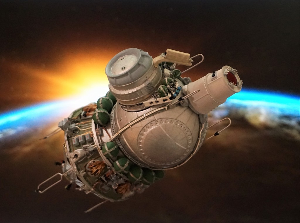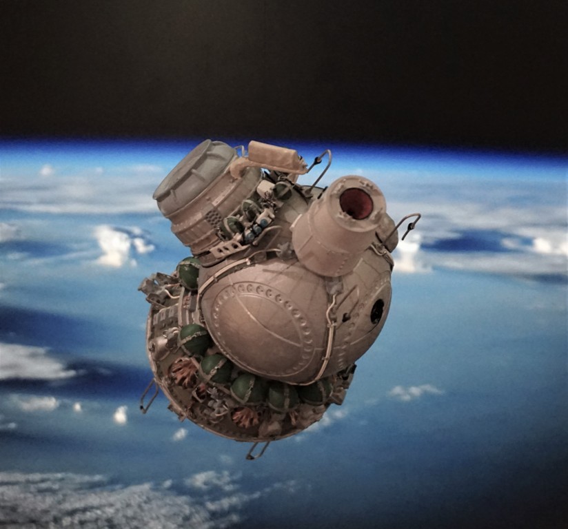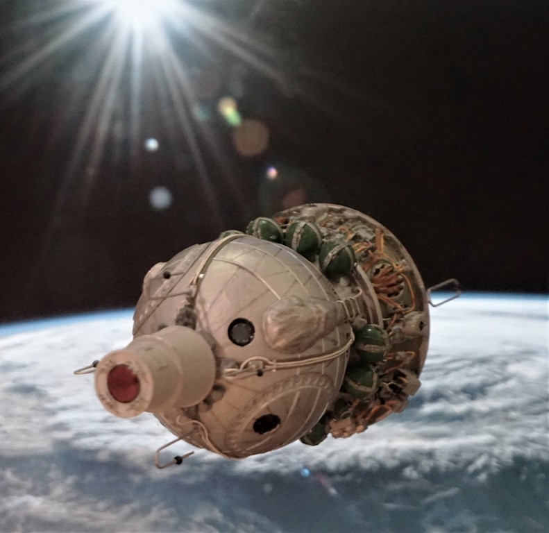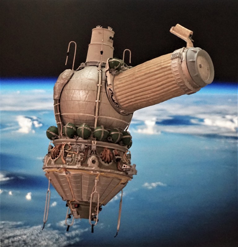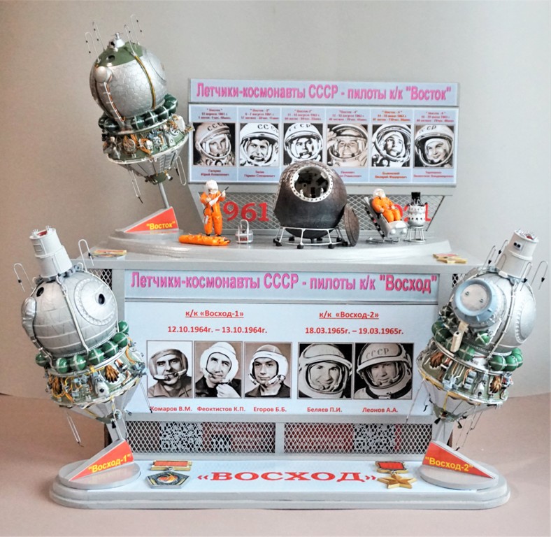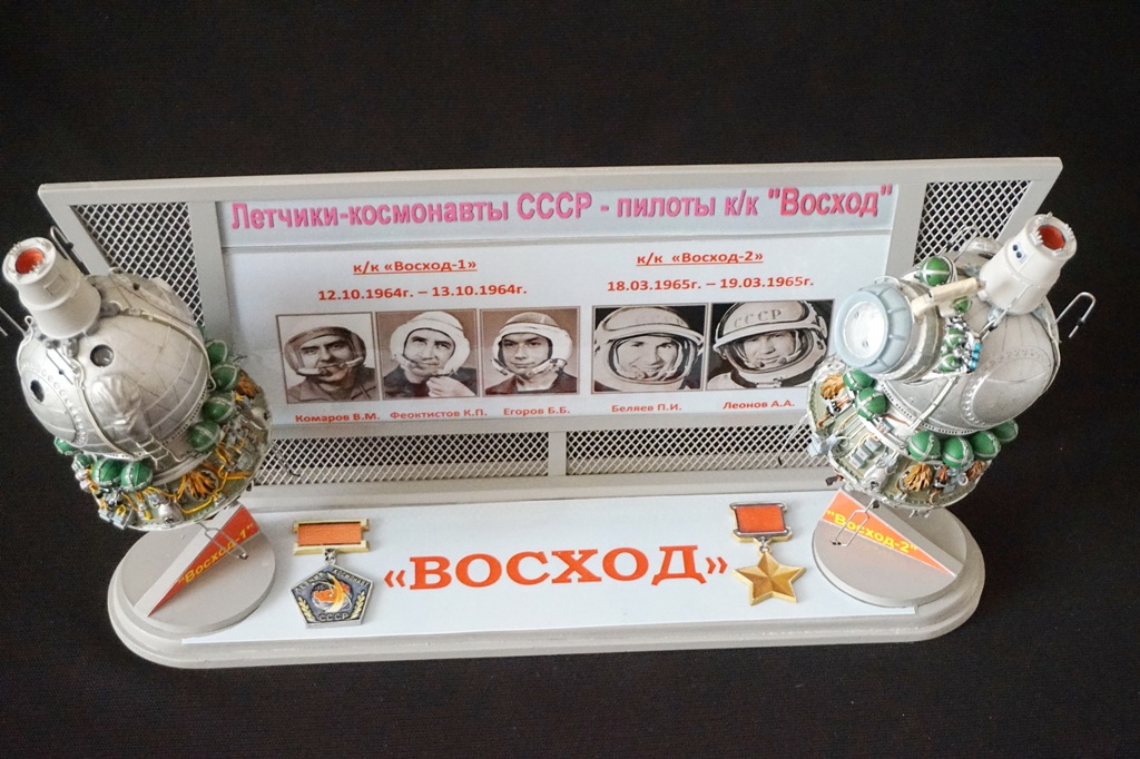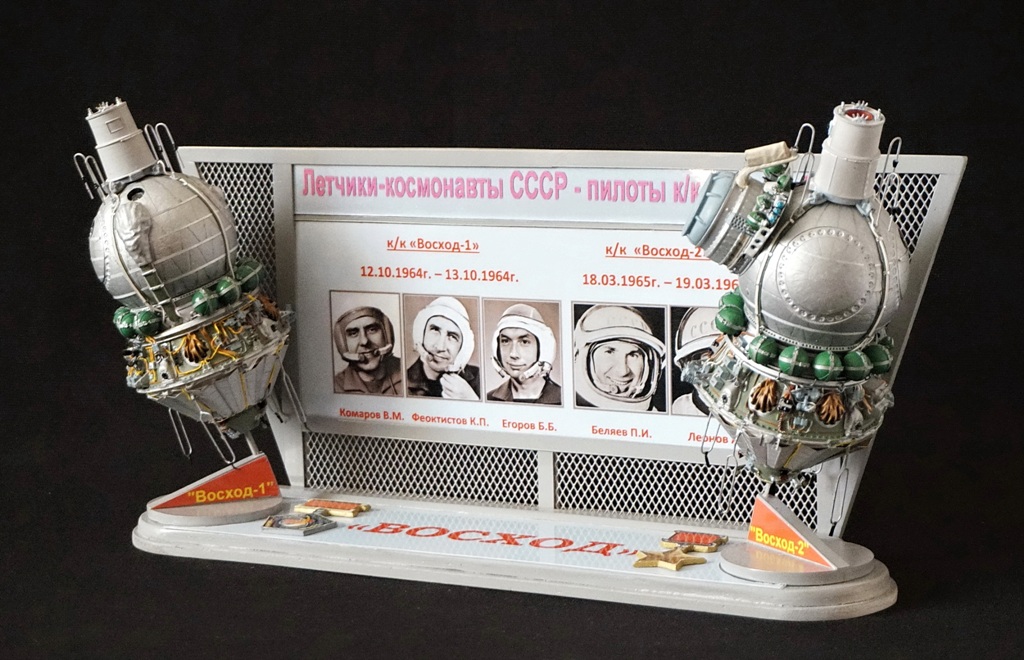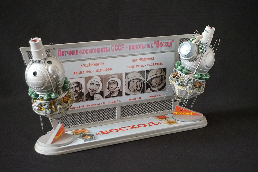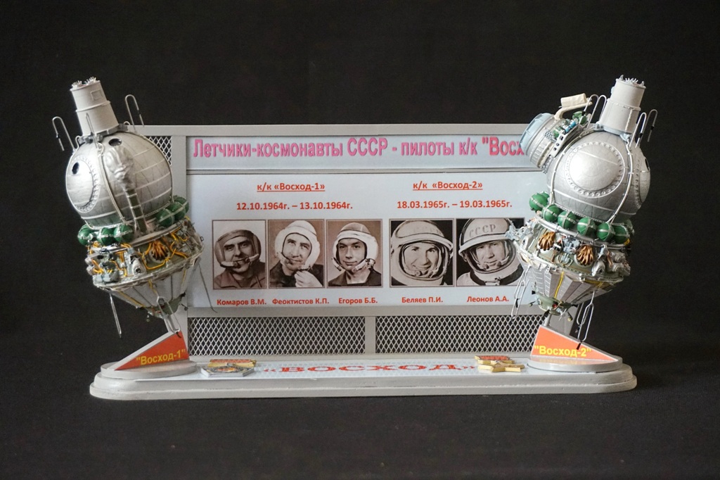 После изготовления моделей кк "Восход-1! и "Восход-2" было принято решение разместить модели на одной подставке, добавив информацию о датах полета и фотографии членов экипажей обоих кораблей. В итоге на модельной полке разместилась пара виньеток, посвященных первым космонавтам СССР.