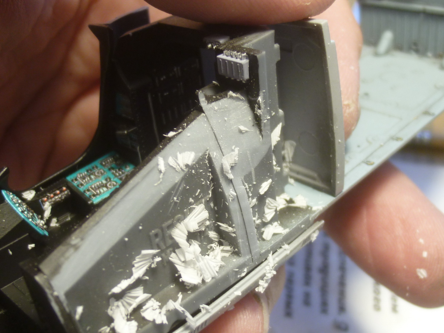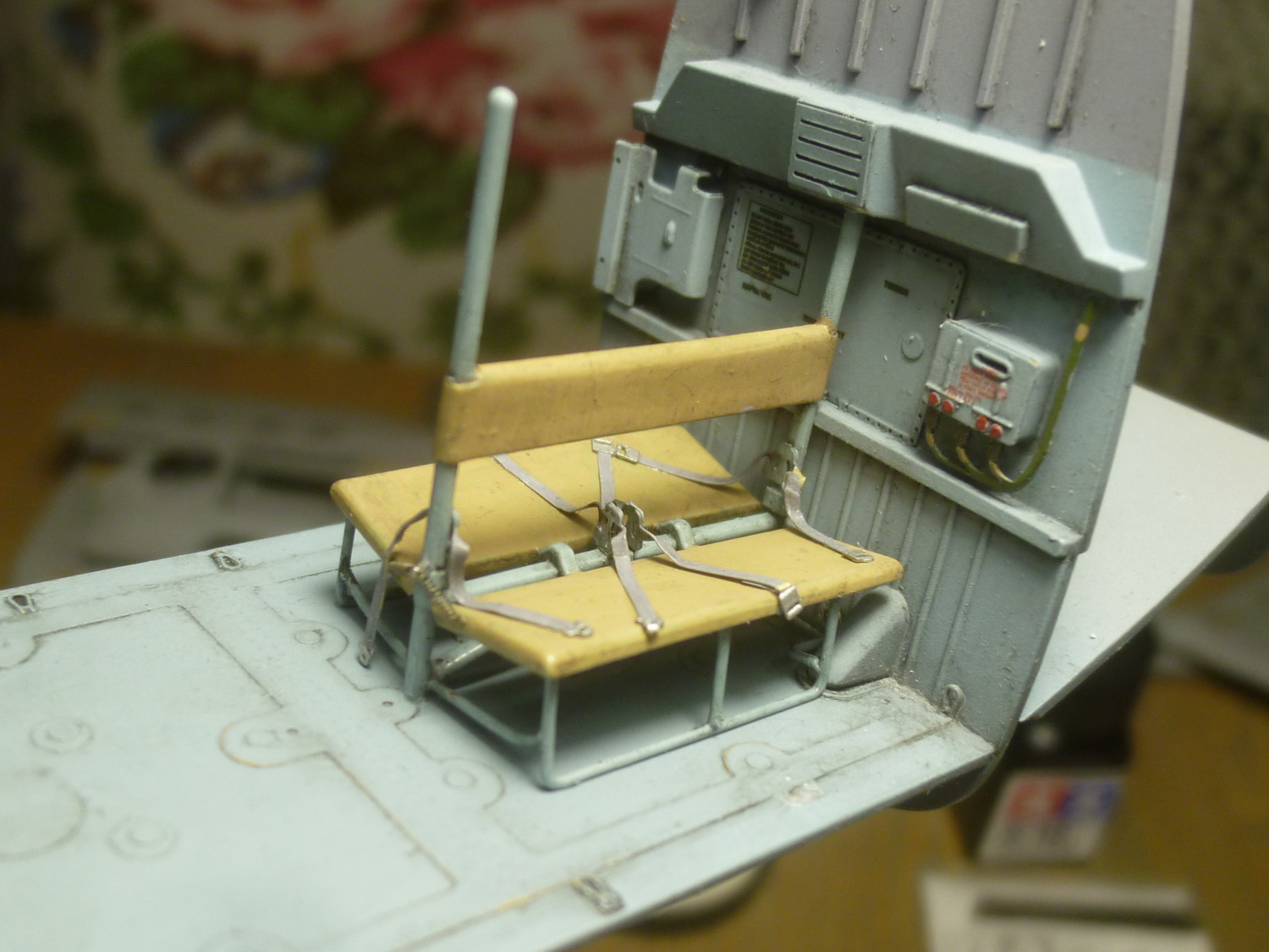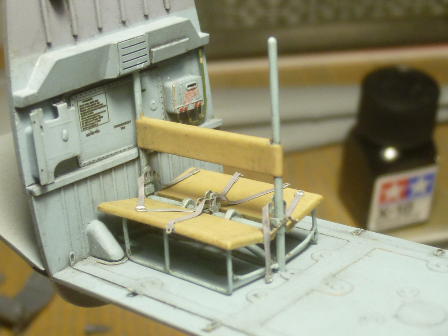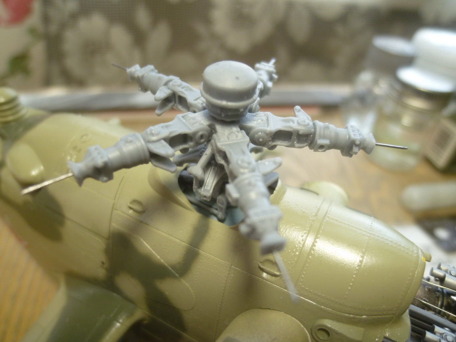 Пространство за креслом пилота сделано с расчётом на приобретение дополнительного набора с десантно-транспортным отсеком от этой же фирмы. Там красотища конечно же, но слишком дорого... Поэтому пришлось сращивать смолу с пластиковыми деталями из набора, добавив при этом "недостающего" полистирола.