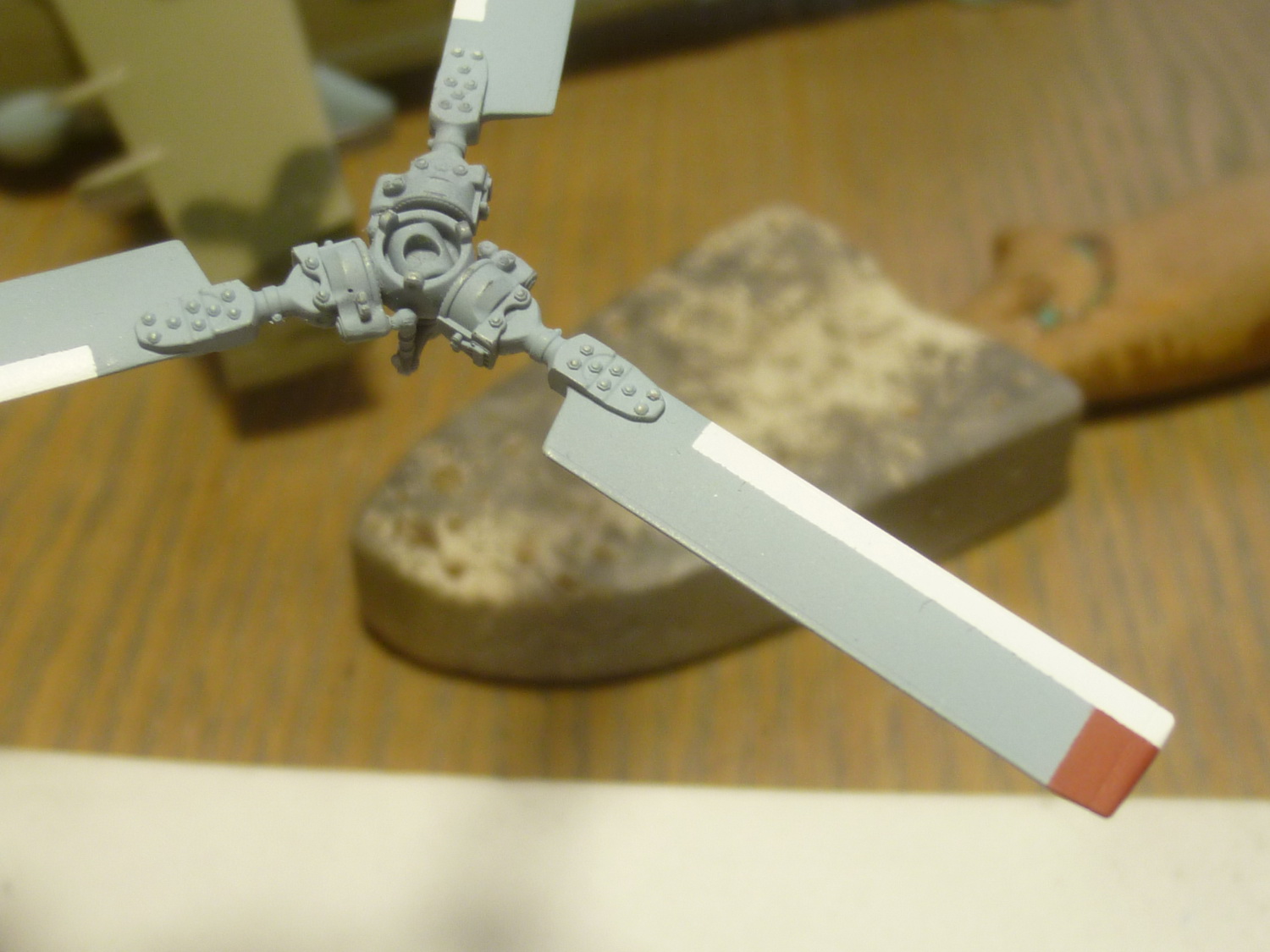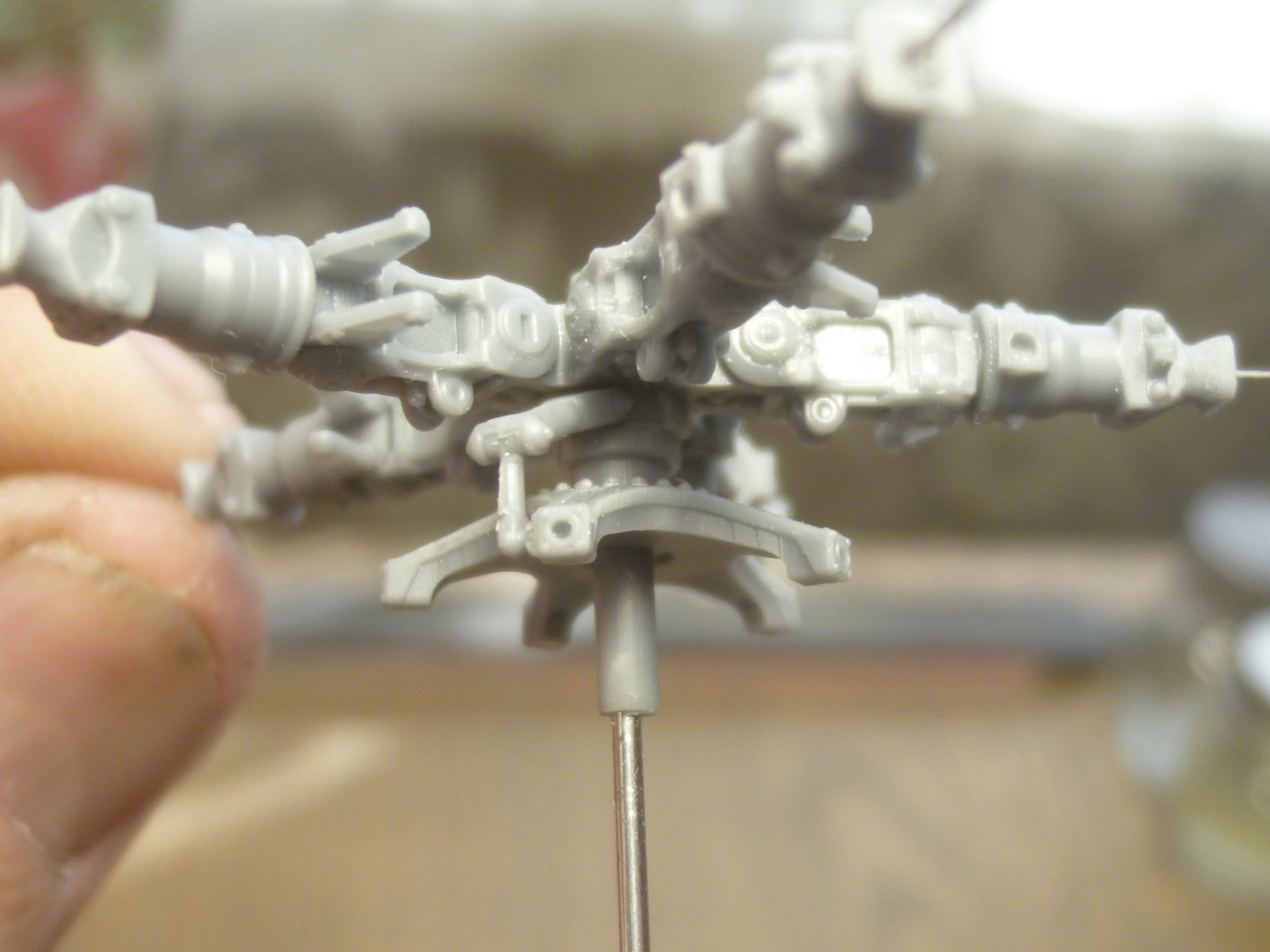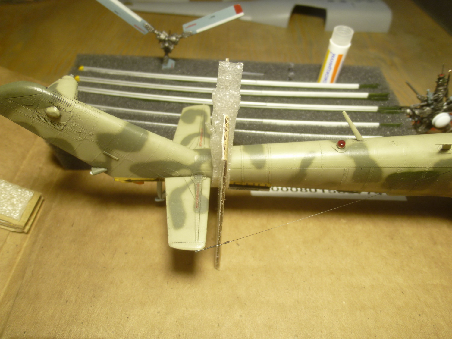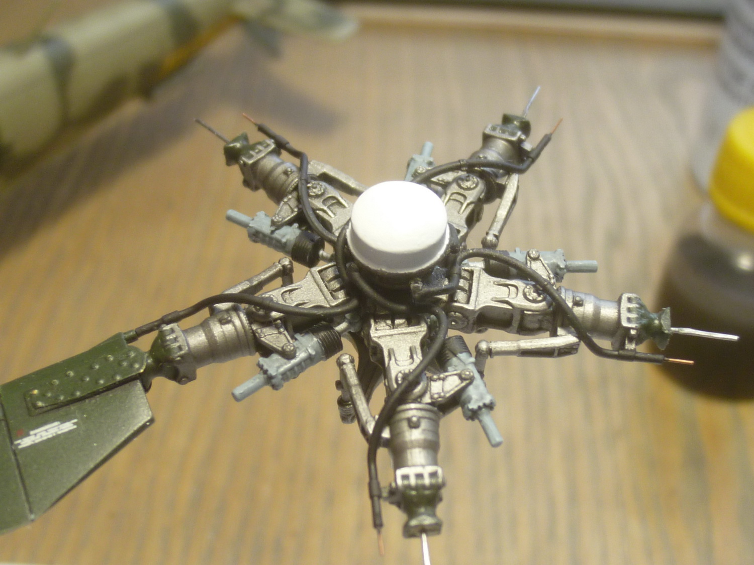 После некоторой подсборки были вклеены штырьки из стальной проволоки диаметром 0,4мм (гитарная струна). Выступающаяя часть (5мм) предназначена для съёмной лопасти НВ и она немного сплющена для более плотной посадки без клея. На концах лопастей вырезал прямоугольнички под будущие огни.