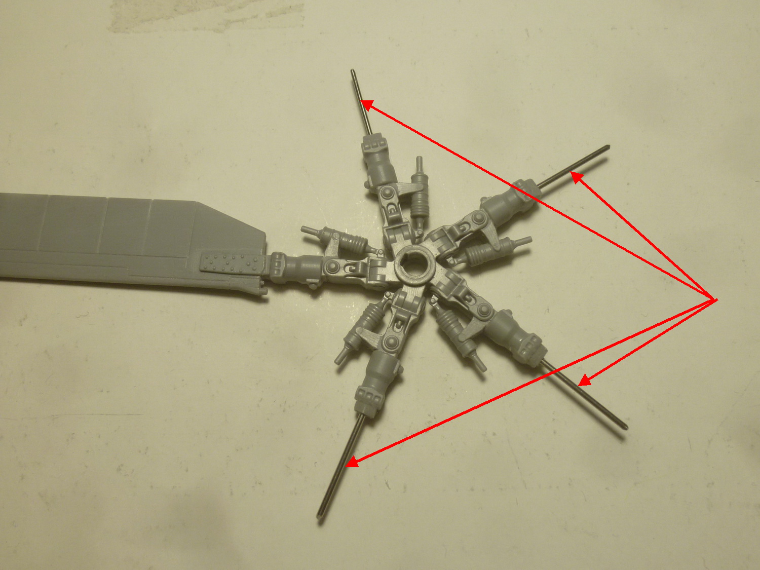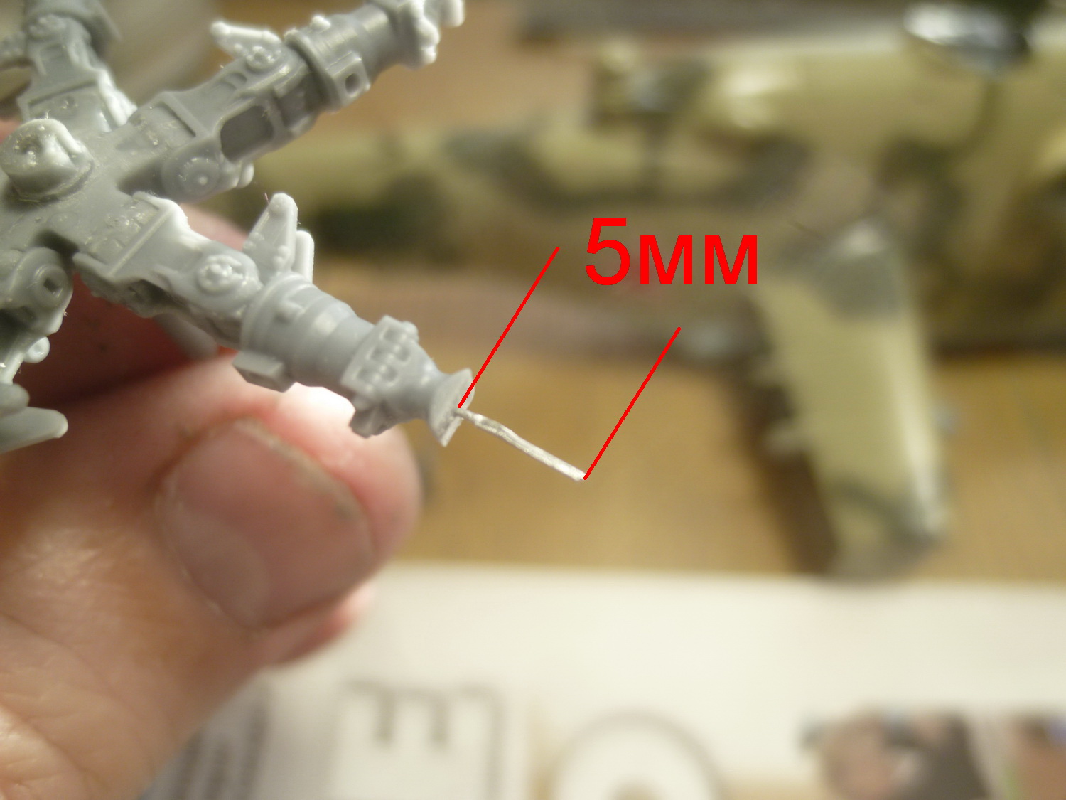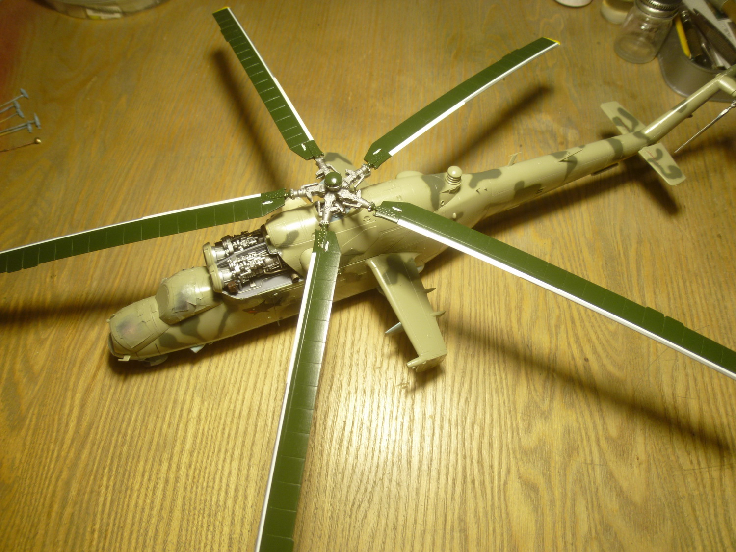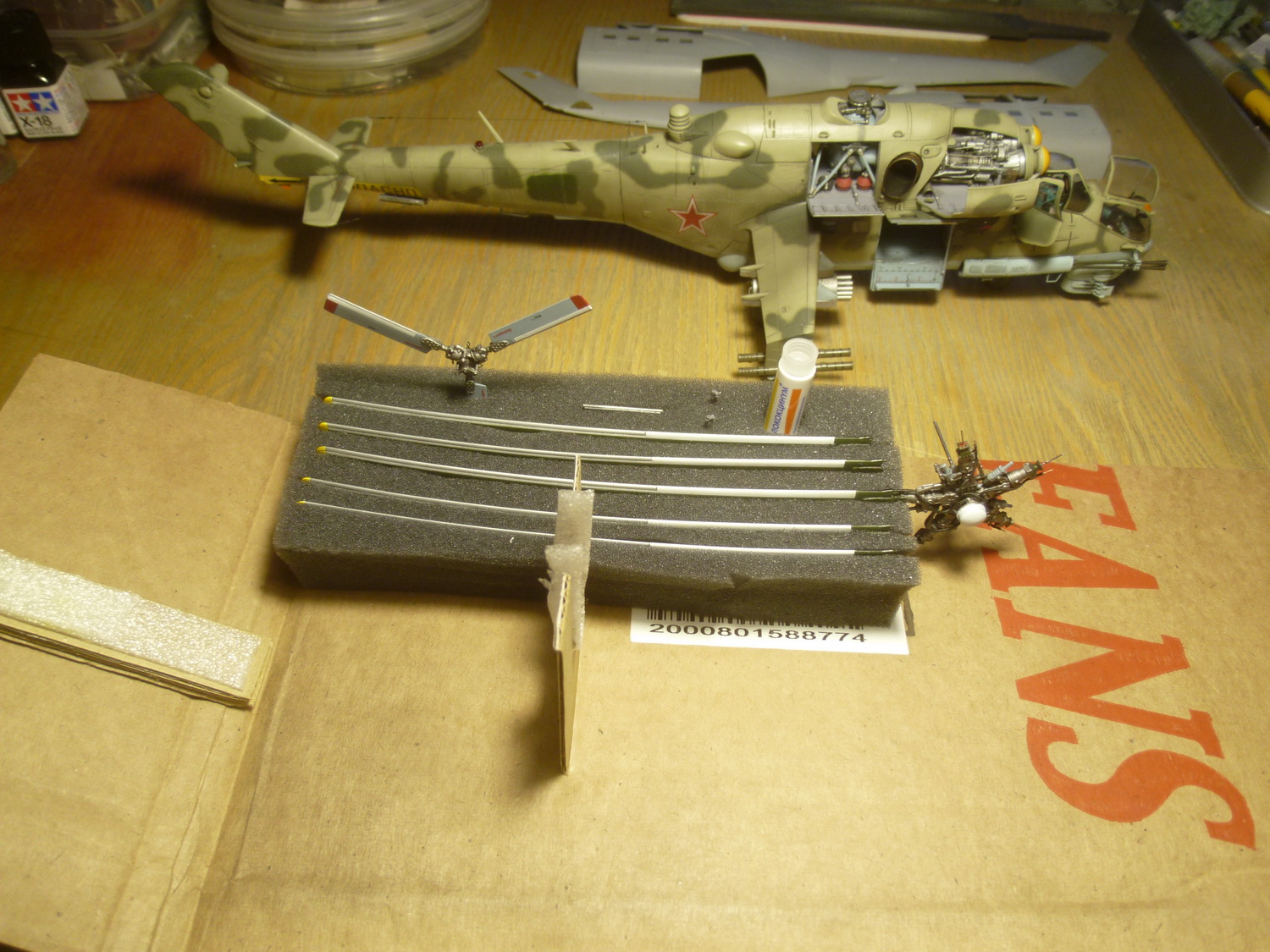 После некоторой подсборки были вклеены штырьки из стальной проволоки диаметром 0,4мм (гитарная струна). Выступающаяя часть (5мм) предназначена для съёмной лопасти НВ и она немного сплющена для более плотной посадки без клея. На концах лопастей вырезал прямоугольнички под будущие огни.
