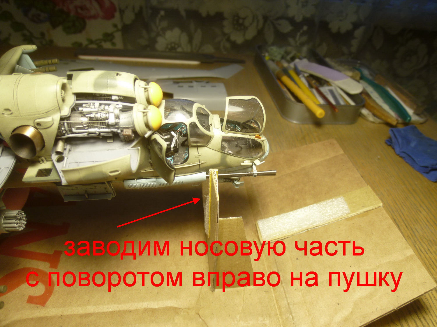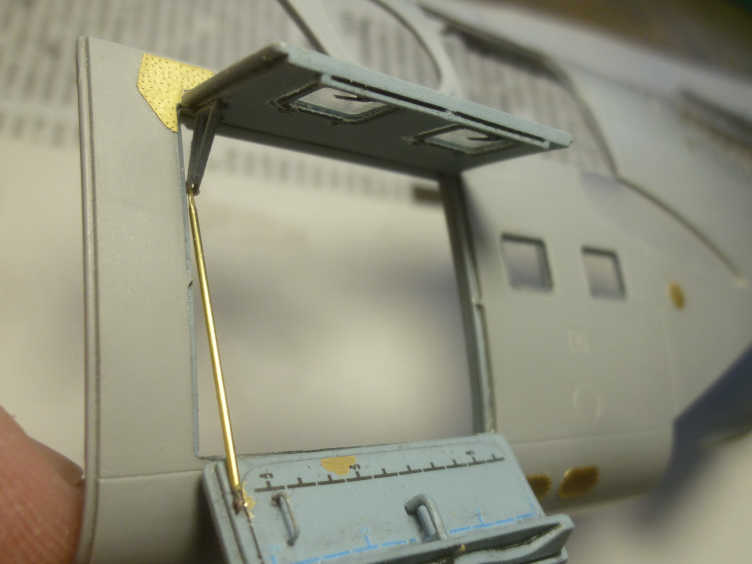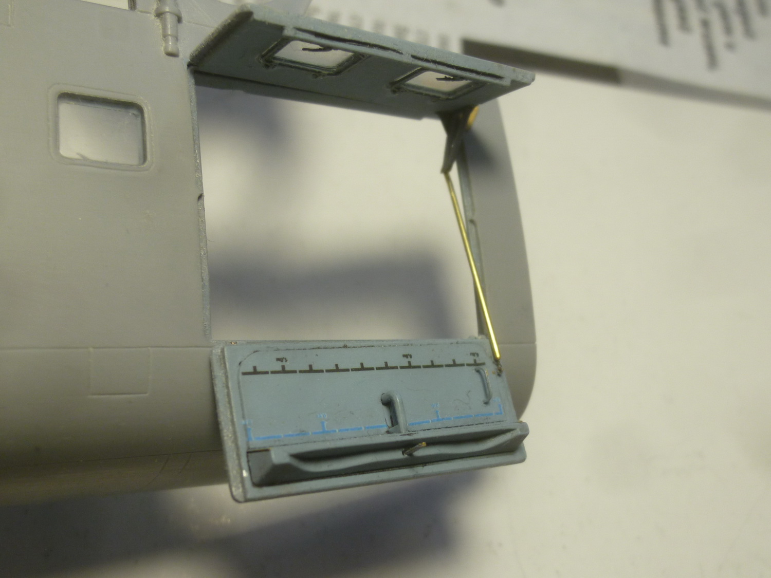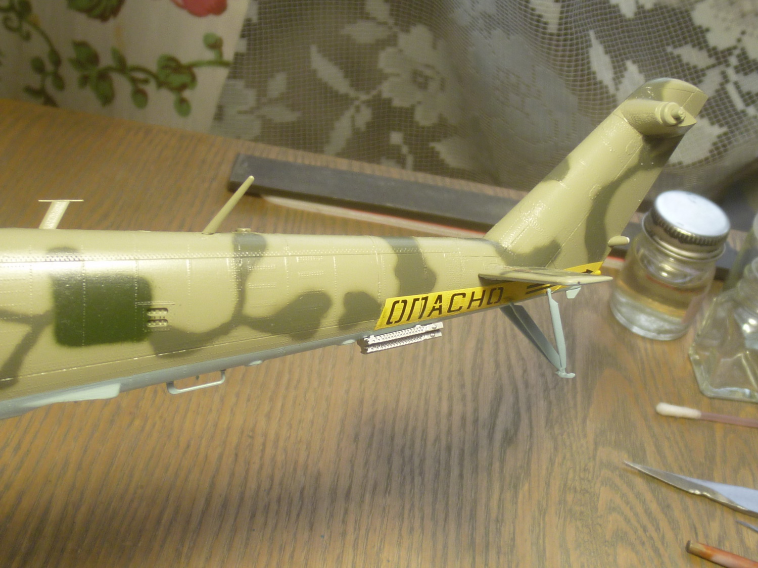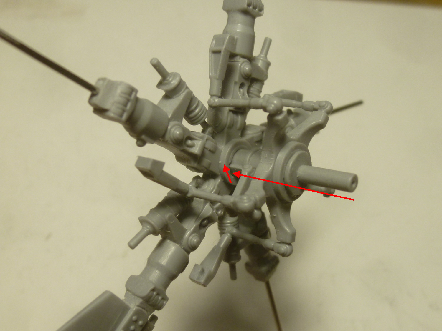 После некоторой подсборки были вклеены штырьки из стальной проволоки диаметром 0,4мм (гитарная струна). Выступающаяя часть (5мм) предназначена для съёмной лопасти НВ и она немного сплющена для более плотной посадки без клея. На концах лопастей вырезал прямоугольнички под будущие огни.