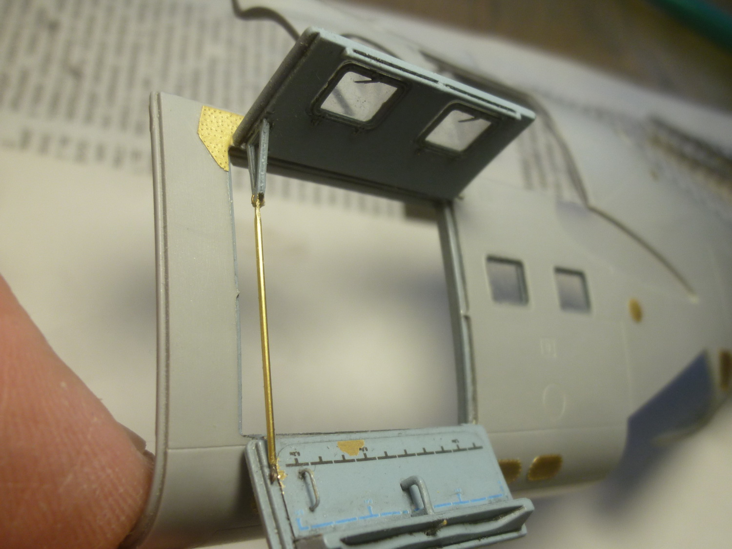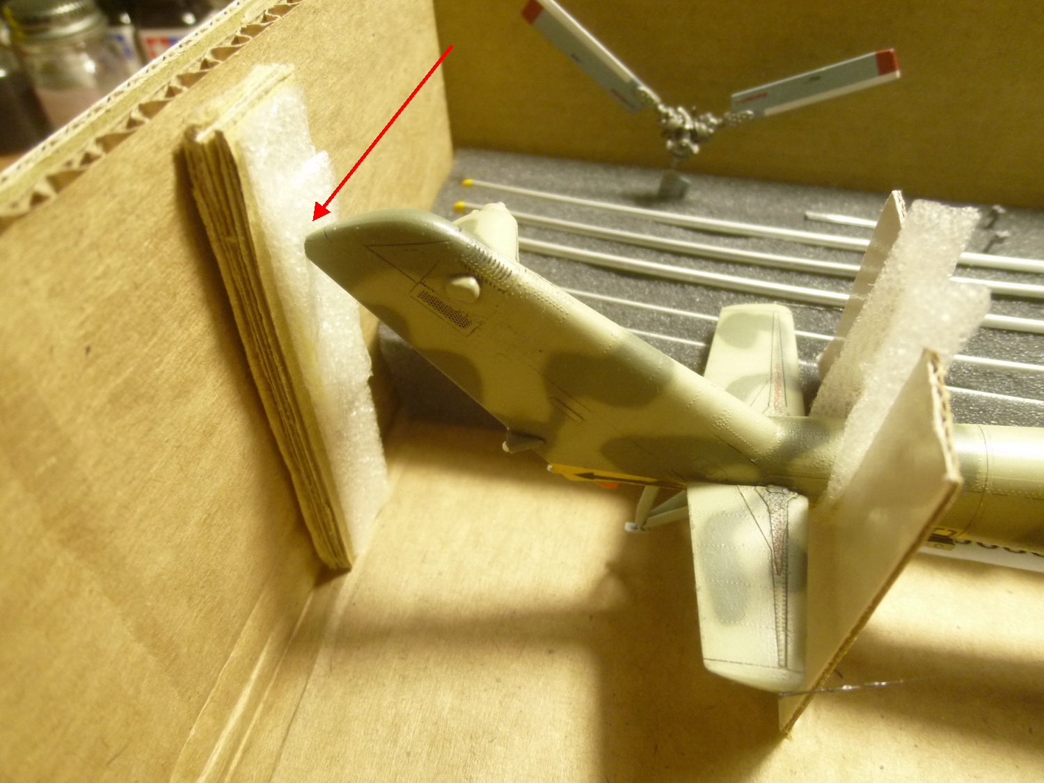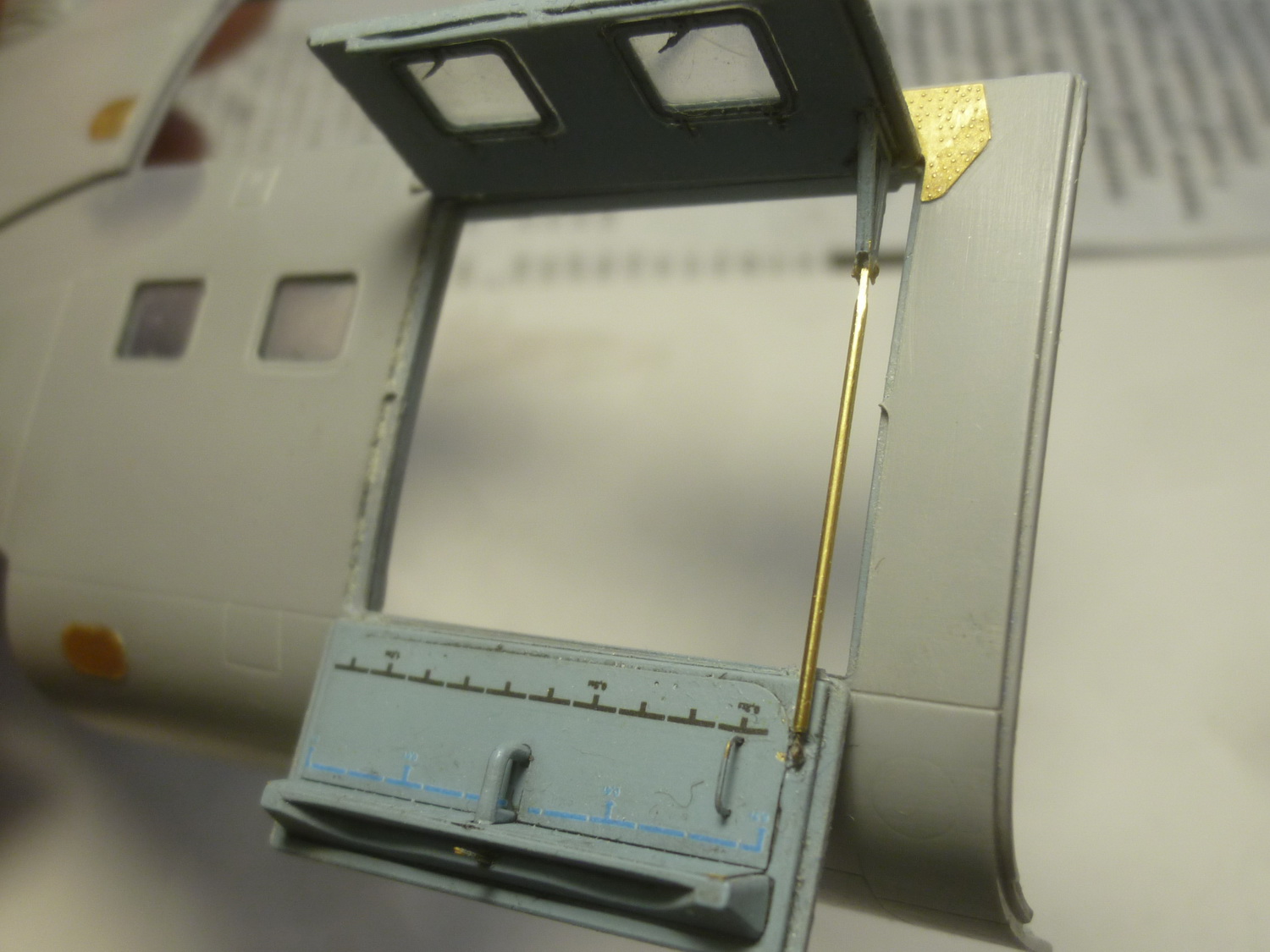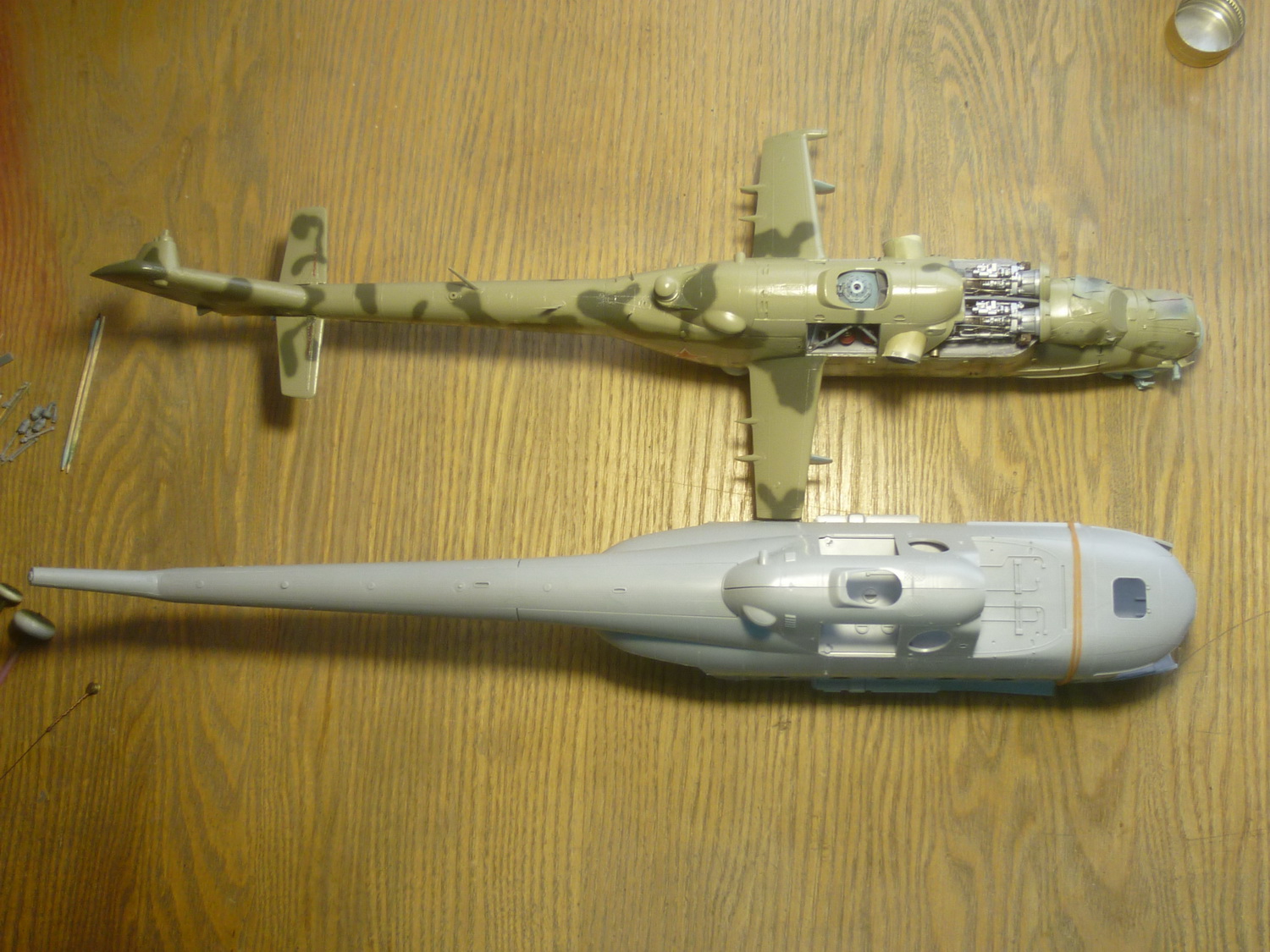 После некоторой подсборки были вклеены штырьки из стальной проволоки диаметром 0,4мм (гитарная струна). Выступающаяя часть (5мм) предназначена для съёмной лопасти НВ и она немного сплющена для более плотной посадки без клея. На концах лопастей вырезал прямоугольнички под будущие огни.