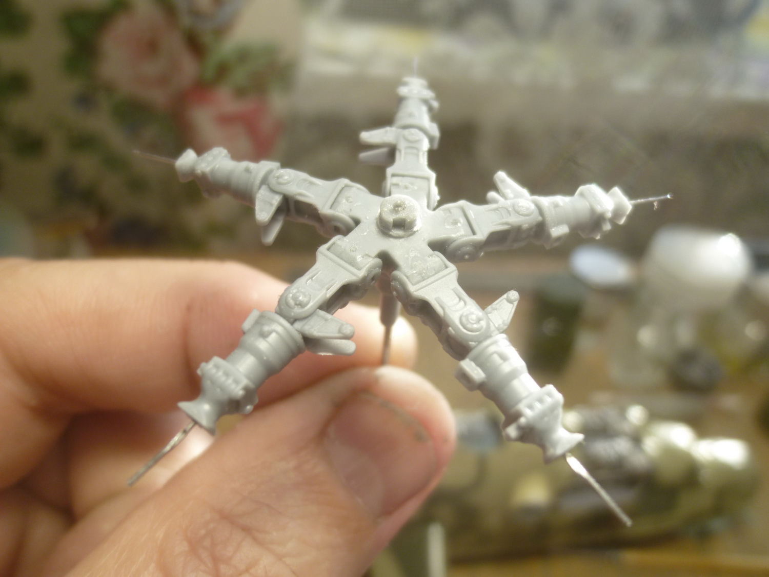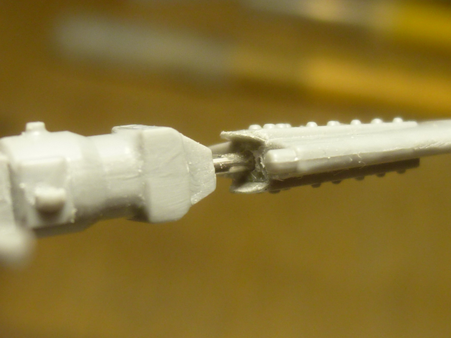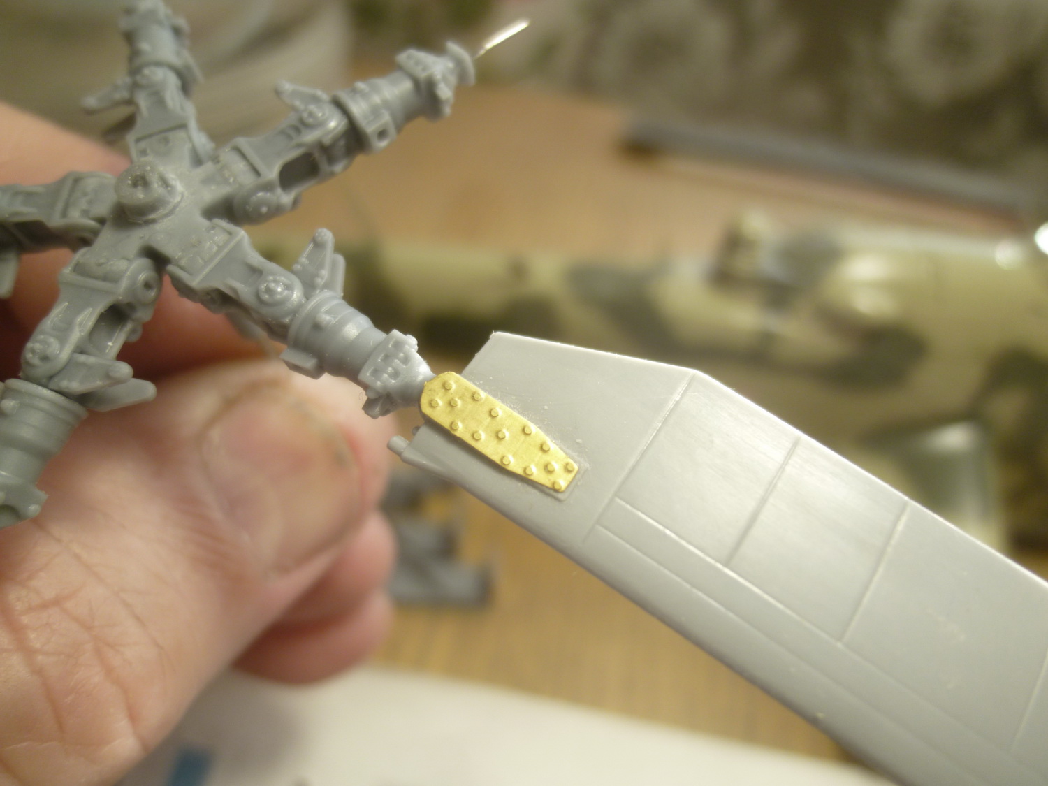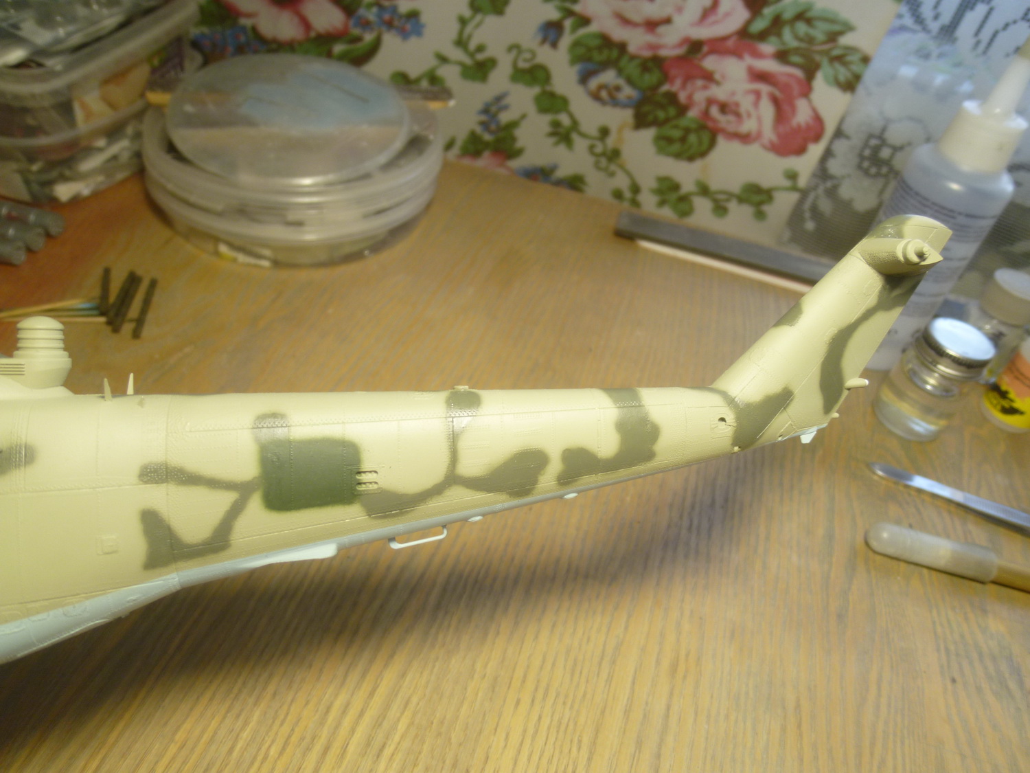 После некоторой подсборки были вклеены штырьки из стальной проволоки диаметром 0,4мм (гитарная струна). Выступающаяя часть (5мм) предназначена для съёмной лопасти НВ и она немного сплющена для более плотной посадки без клея. На концах лопастей вырезал прямоугольнички под будущие огни.