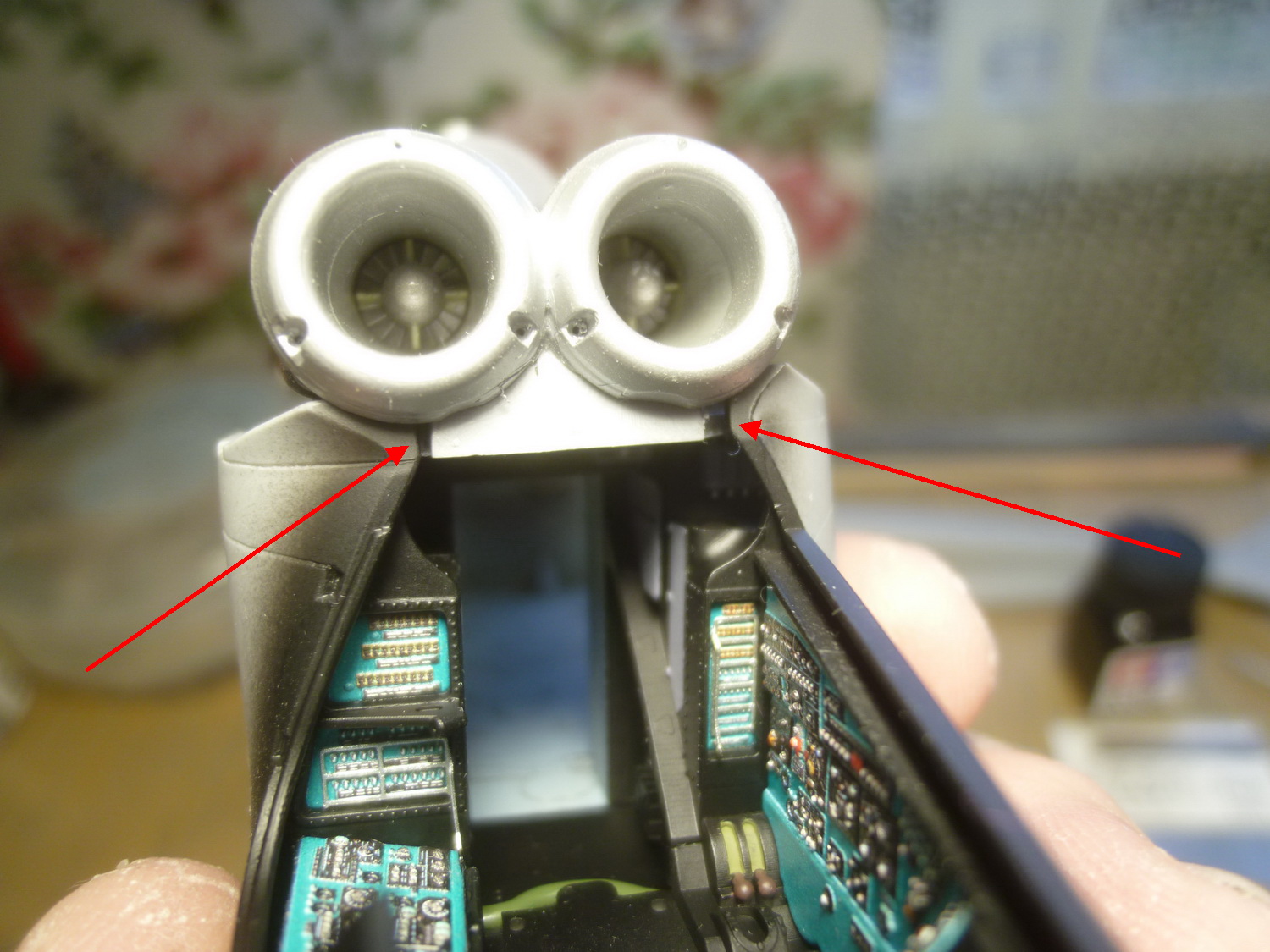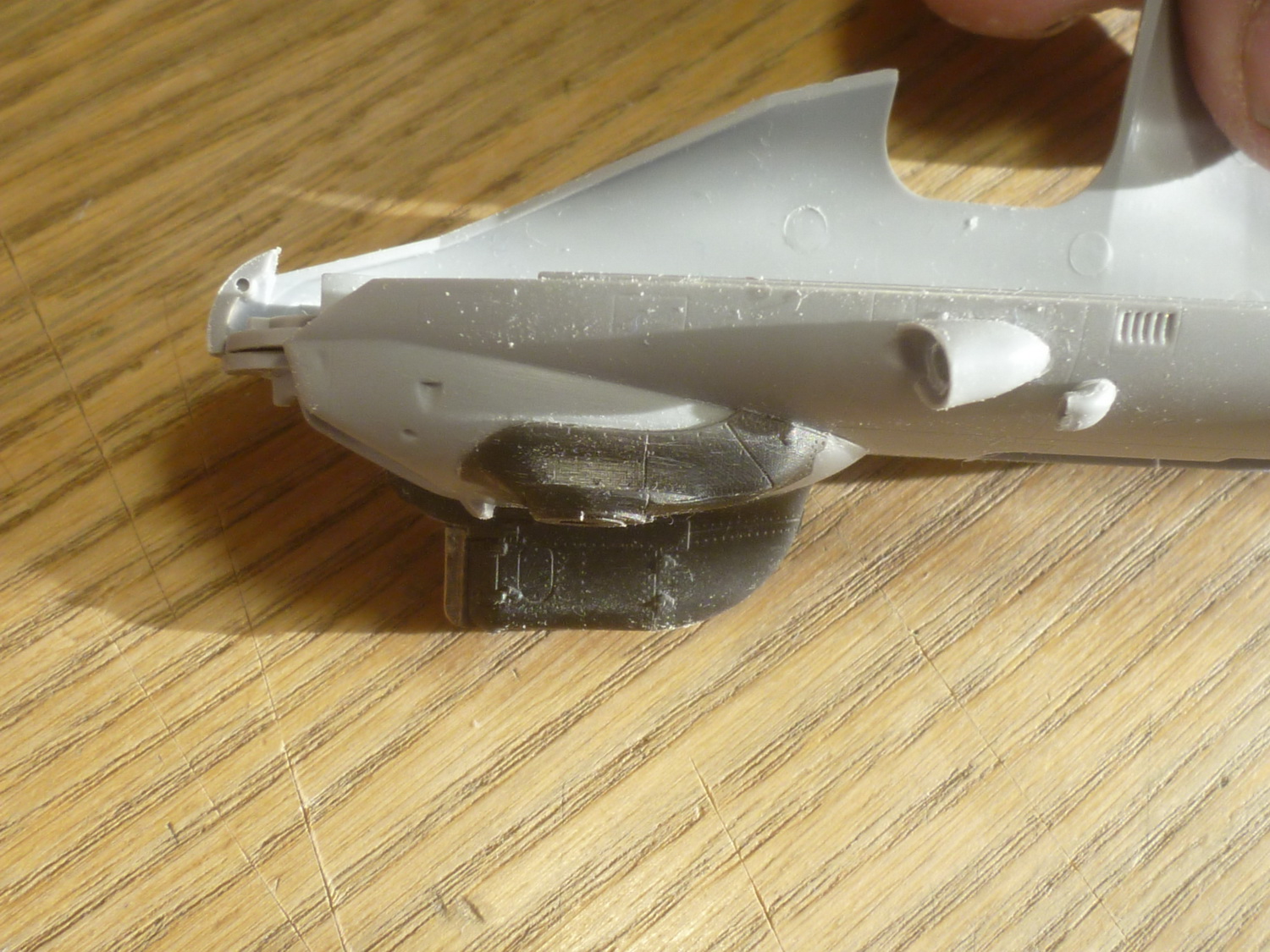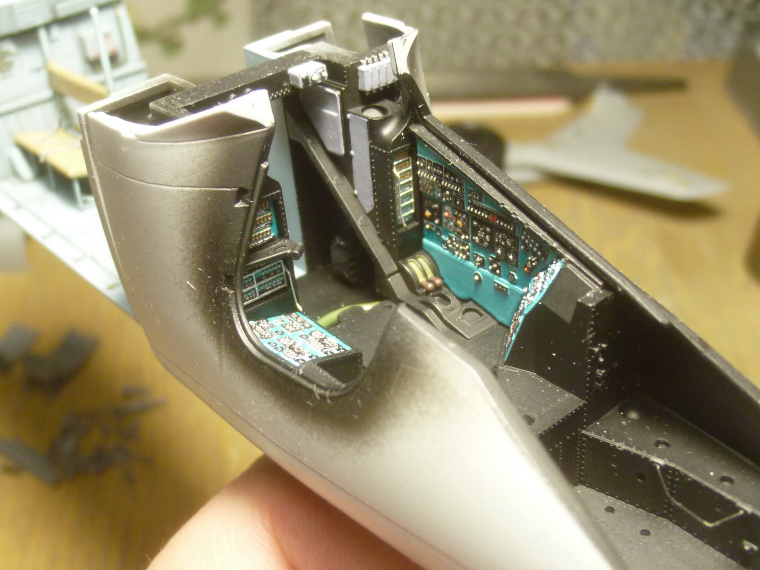 После этого загрунтовал смолу чёрным грунтом, потом положил слой чёрной полублестящей эмали и приклеил на свои места приборные панели. Собрал "тамбур" и попытался снова примерить полученное к пластику. Выяснилось, что с правой стороны надо подрезать кронштейн, к которому крепится гидроцилиндр открытия двери, а слева стачивать более основательно стык, чтобы половинки носовой части фюзеля сошлись в верхней части под ВЗ двигателей.