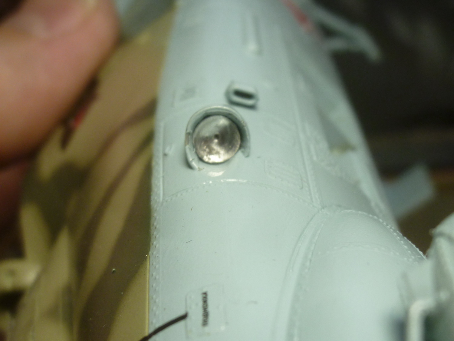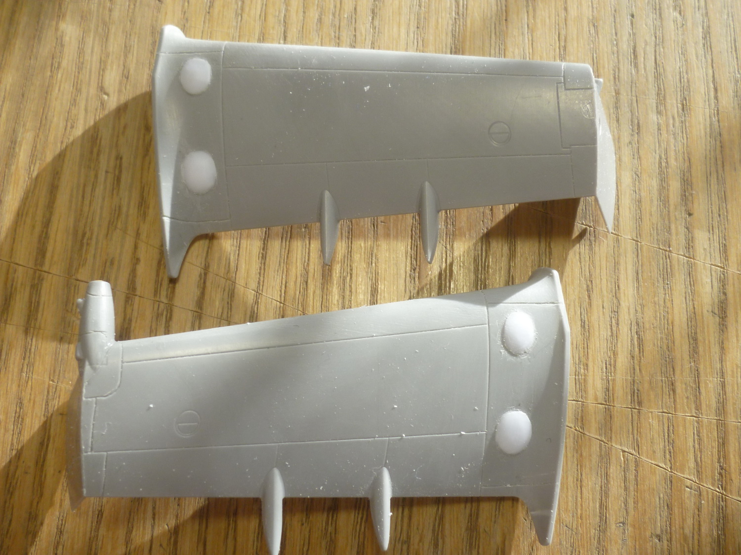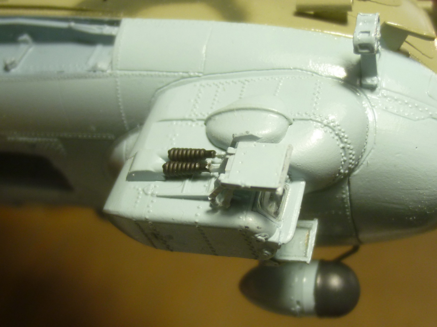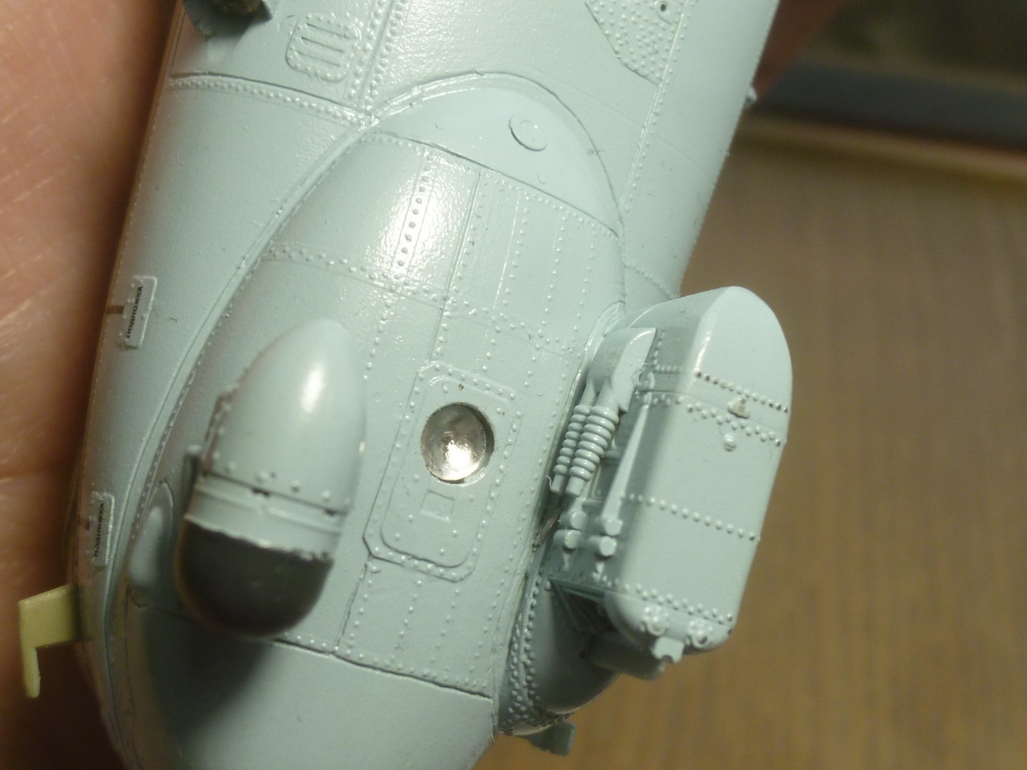 Линию зализа на крылышках отодвинул на 4мм и добавил овальные обтекатели на самом зализе (на моём прототипе они были). Вообще, их наличие надо смотреть по фото конкретного борта, потому как не везде они были. Сделал восемь пластиковых заготовочек и установил их на свои места. Обработал на черновую. Добавил характерные выштамповки и на боковых крышках редуктора - здесь ещё более интересно. Такие, похоже были только на чехах. На наших они менее заметные и почти круглые, а вот на Ми-35 более сильно выступают.