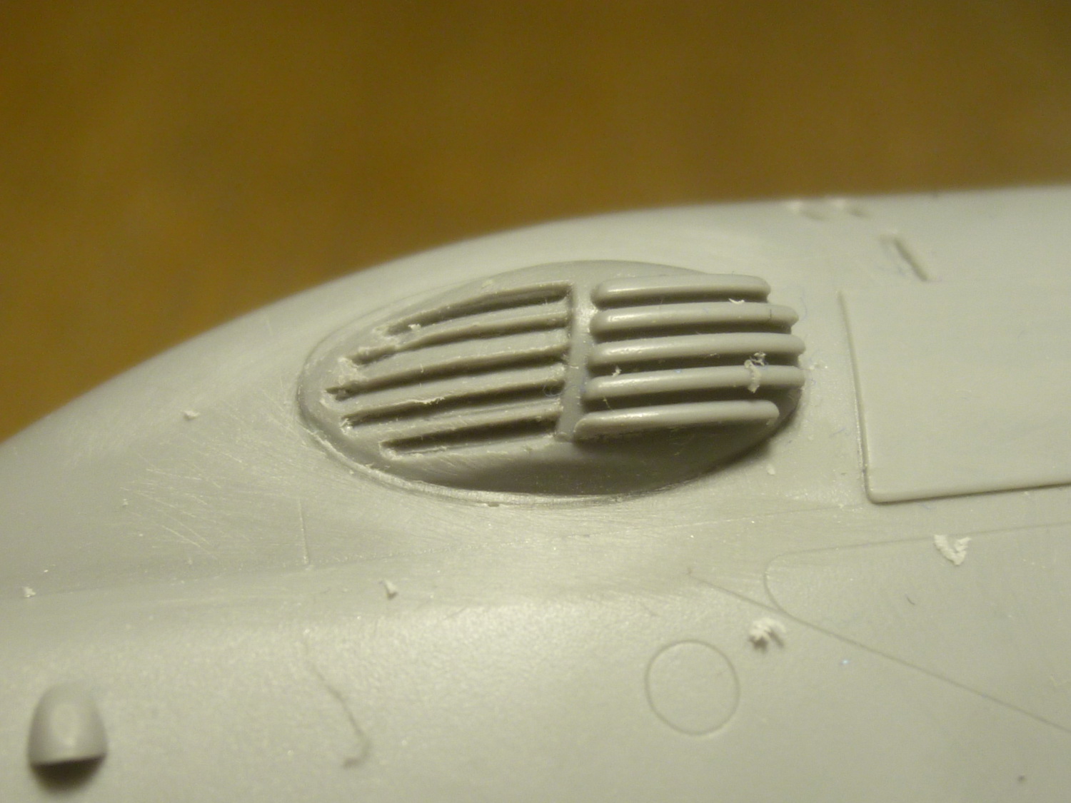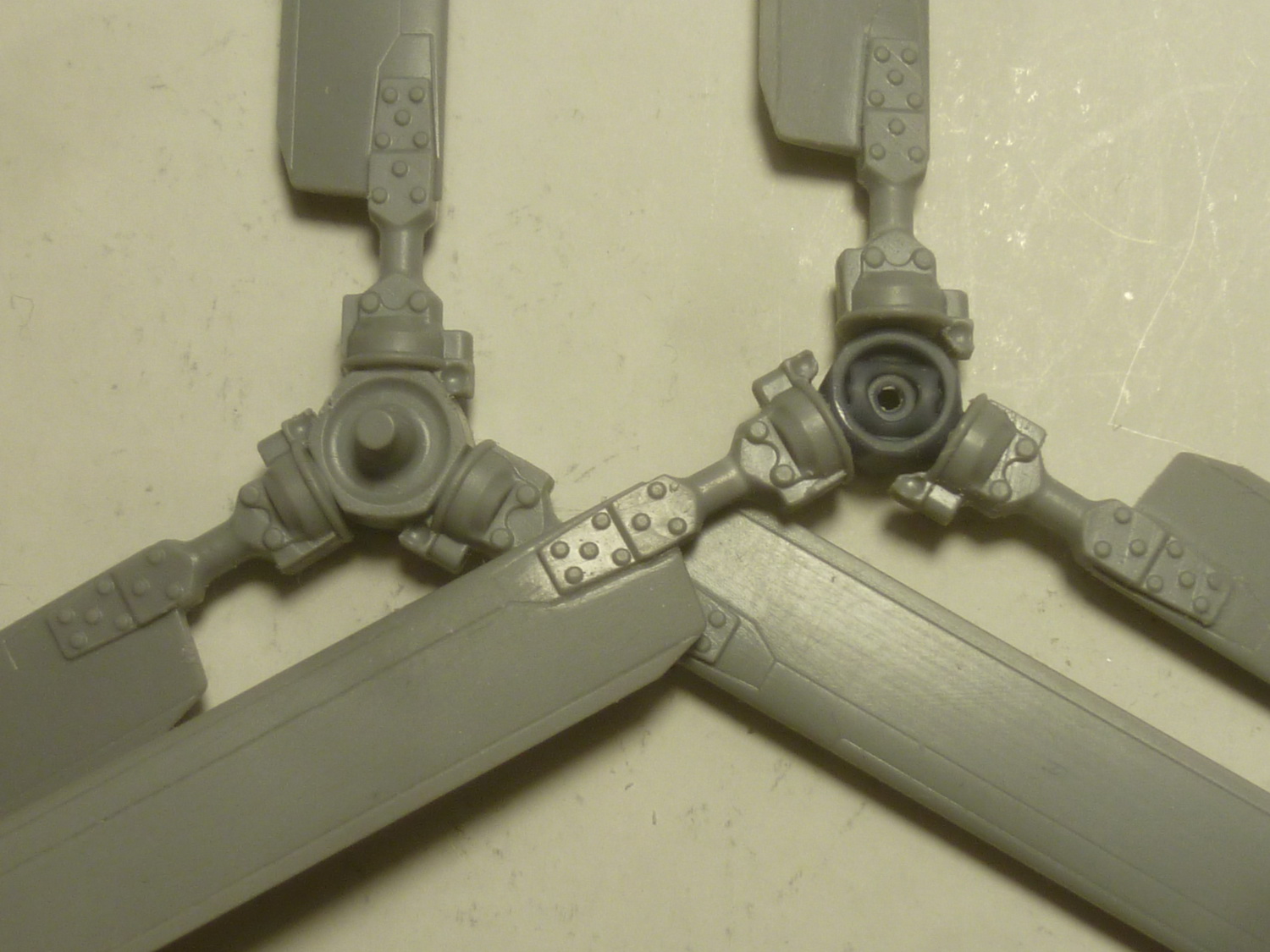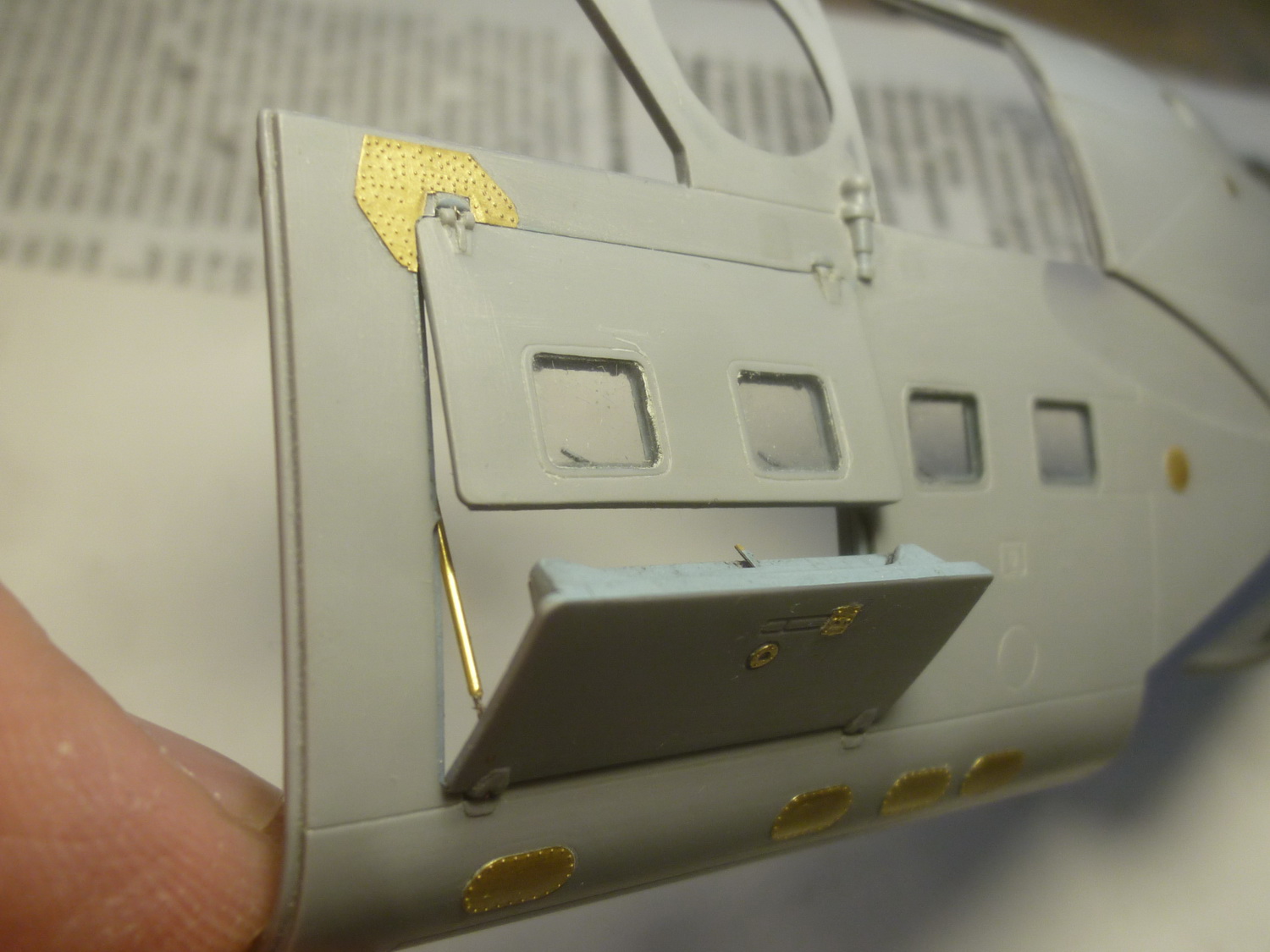 Линию зализа на крылышках отодвинул на 4мм и добавил овальные обтекатели на самом зализе (на моём прототипе они были). Вообще, их наличие надо смотреть по фото конкретного борта, потому как не везде они были. Сделал восемь пластиковых заготовочек и установил их на свои места. Обработал на черновую. Добавил характерные выштамповки и на боковых крышках редуктора - здесь ещё более интересно. Такие, похоже были только на чехах. На наших они менее заметные и почти круглые, а вот на Ми-35 более сильно выступают.
