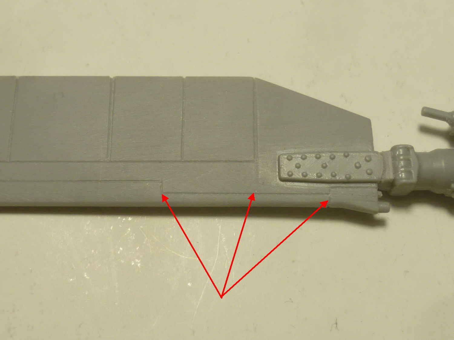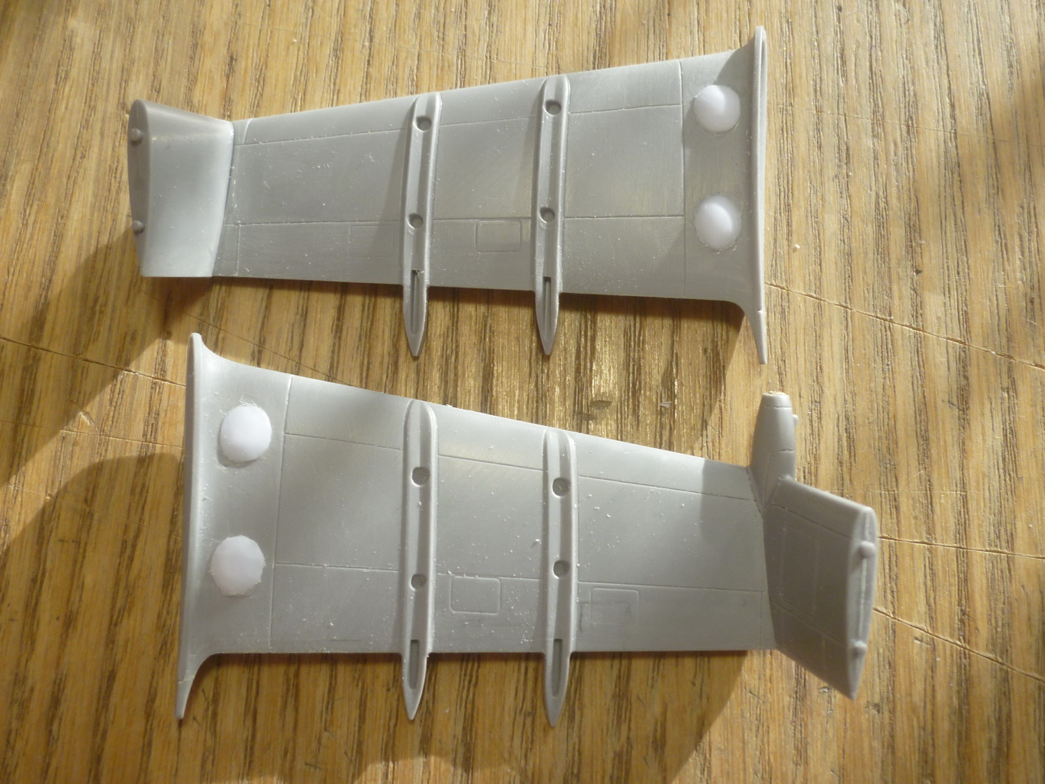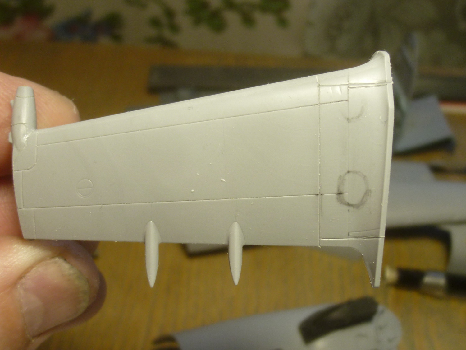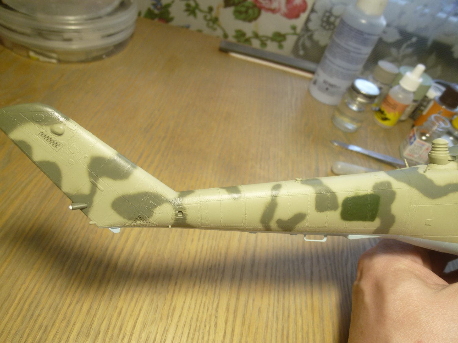 Линию зализа на крылышках отодвинул на 4мм и добавил овальные обтекатели на самом зализе (на моём прототипе они были). Вообще, их наличие надо смотреть по фото конкретного борта, потому как не везде они были. Сделал восемь пластиковых заготовочек и установил их на свои места. Обработал на черновую. Добавил характерные выштамповки и на боковых крышках редуктора - здесь ещё более интересно. Такие, похоже были только на чехах. На наших они менее заметные и почти круглые, а вот на Ми-35 более сильно выступают.