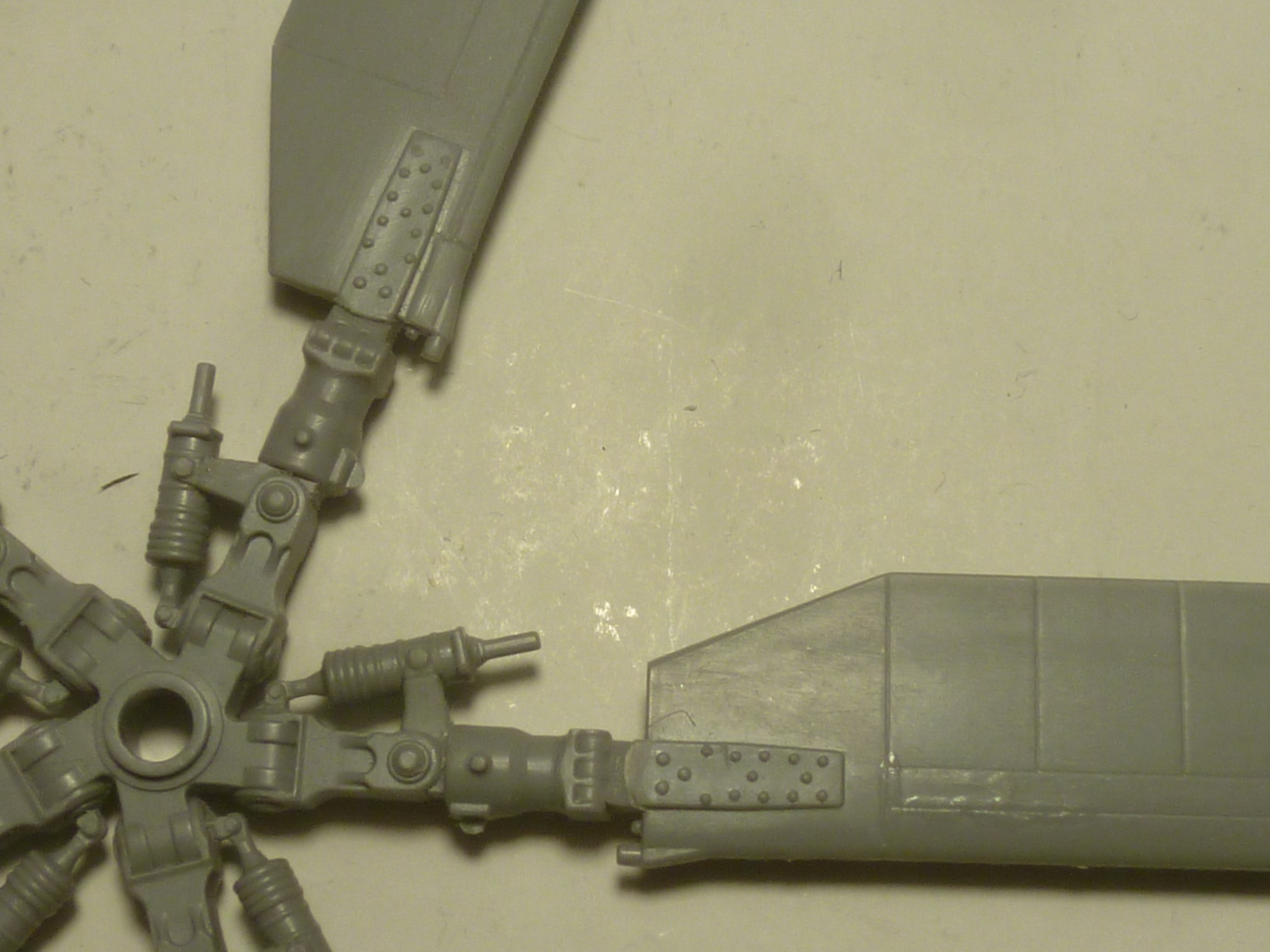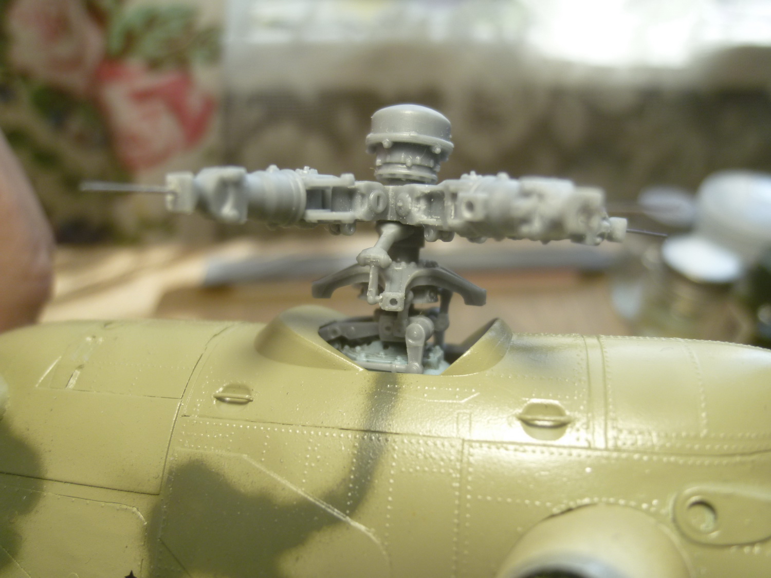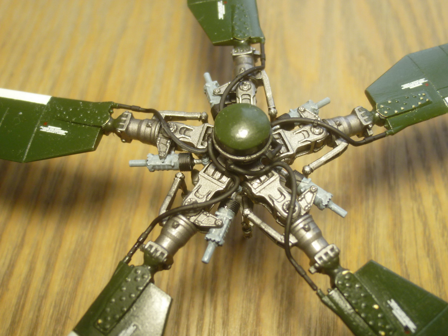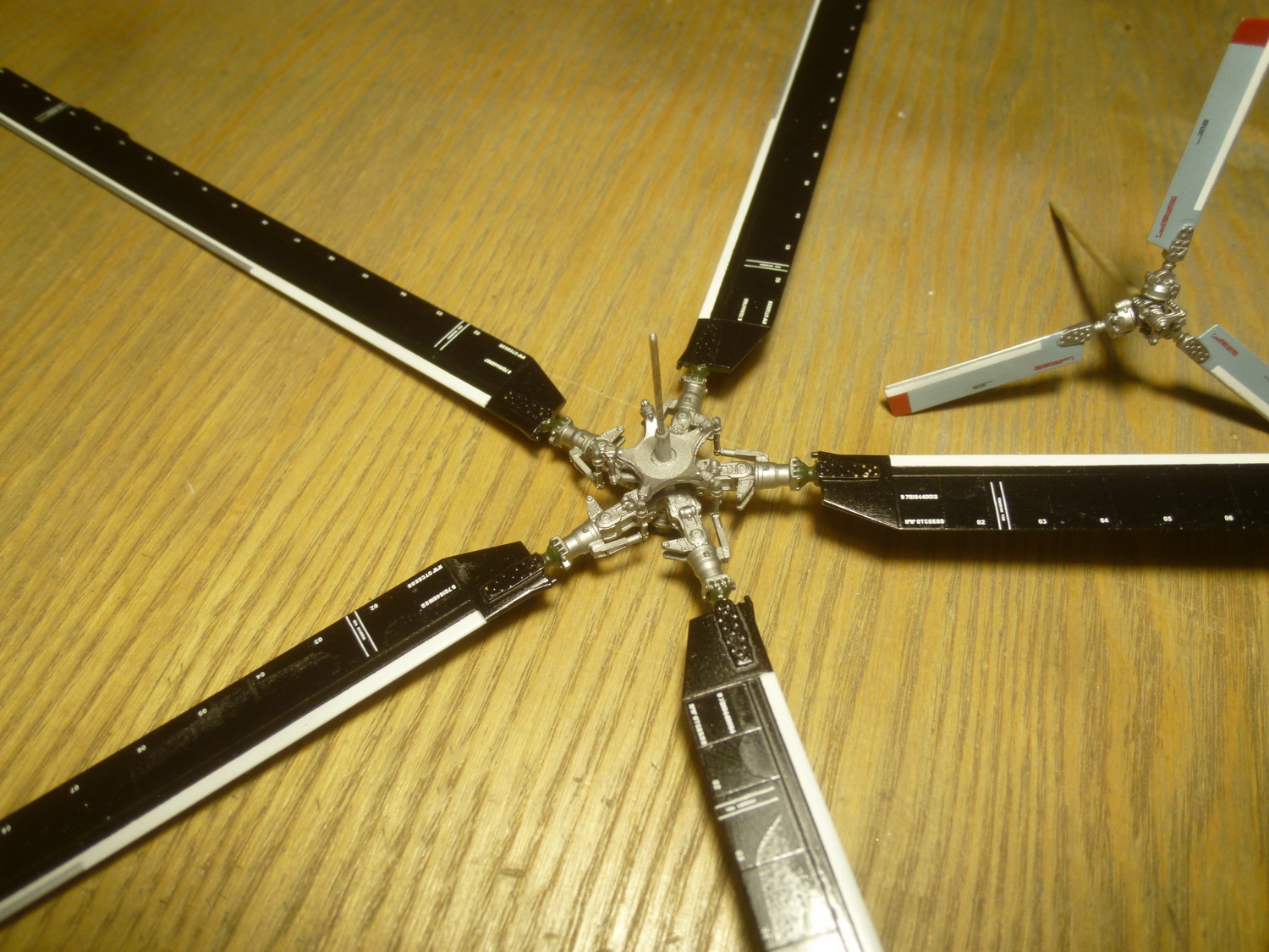 Как и на заказном, одну лопасть приклеил к ротору НВ, остальные сделал съёмными. Аккуратно отделил лопасти от комлевых частей, подточил и теперь в присоединённом состоянии они не отличаются от приклеенной. В качестве штифтов использовал медицинские иглы диаметром 0,8мм - сидят мёртво на трении(на заказном стальной корд 0,5мм и на нём лопасти покачиваются). Изменил расшивку на комлевой части лопастей. Для удобства окраски собрал отдельно от ротора автомат перекоса лопастей. За счёт небольшого увеличения паза он теперь вместе с осью вставляется в ротор и путём доворота рычаги встают на своё место.