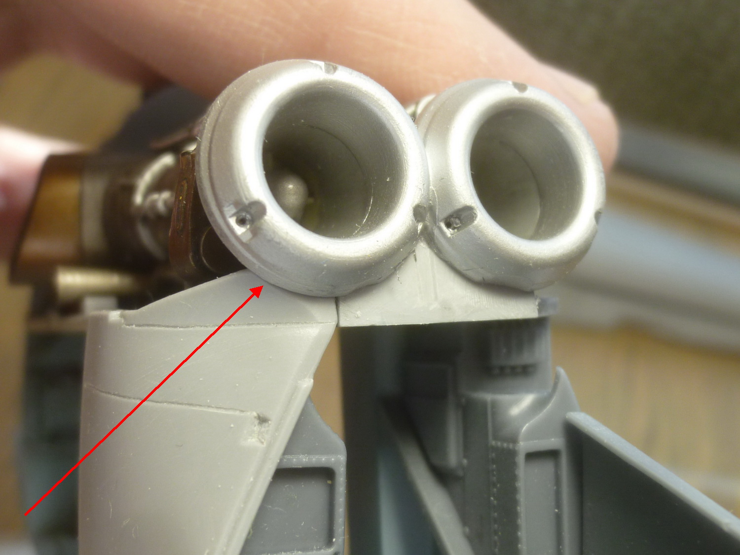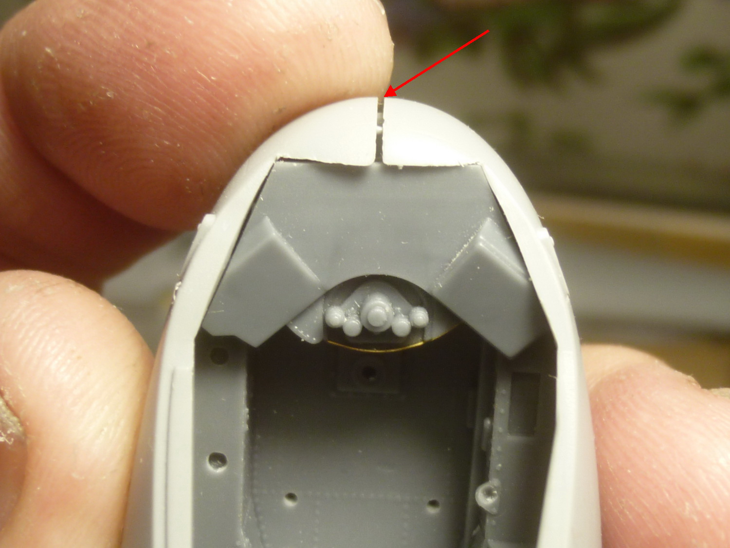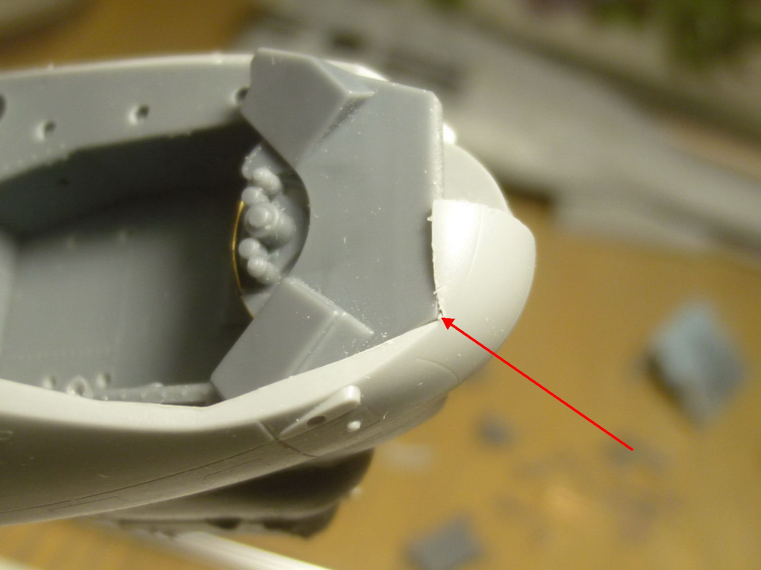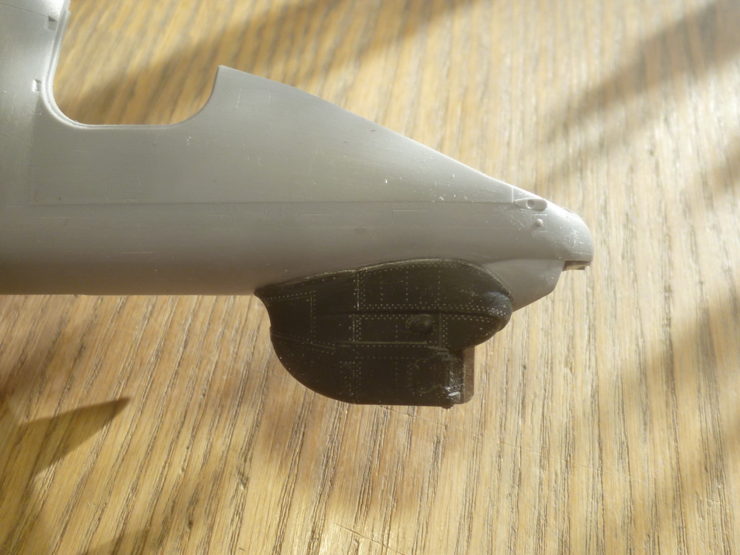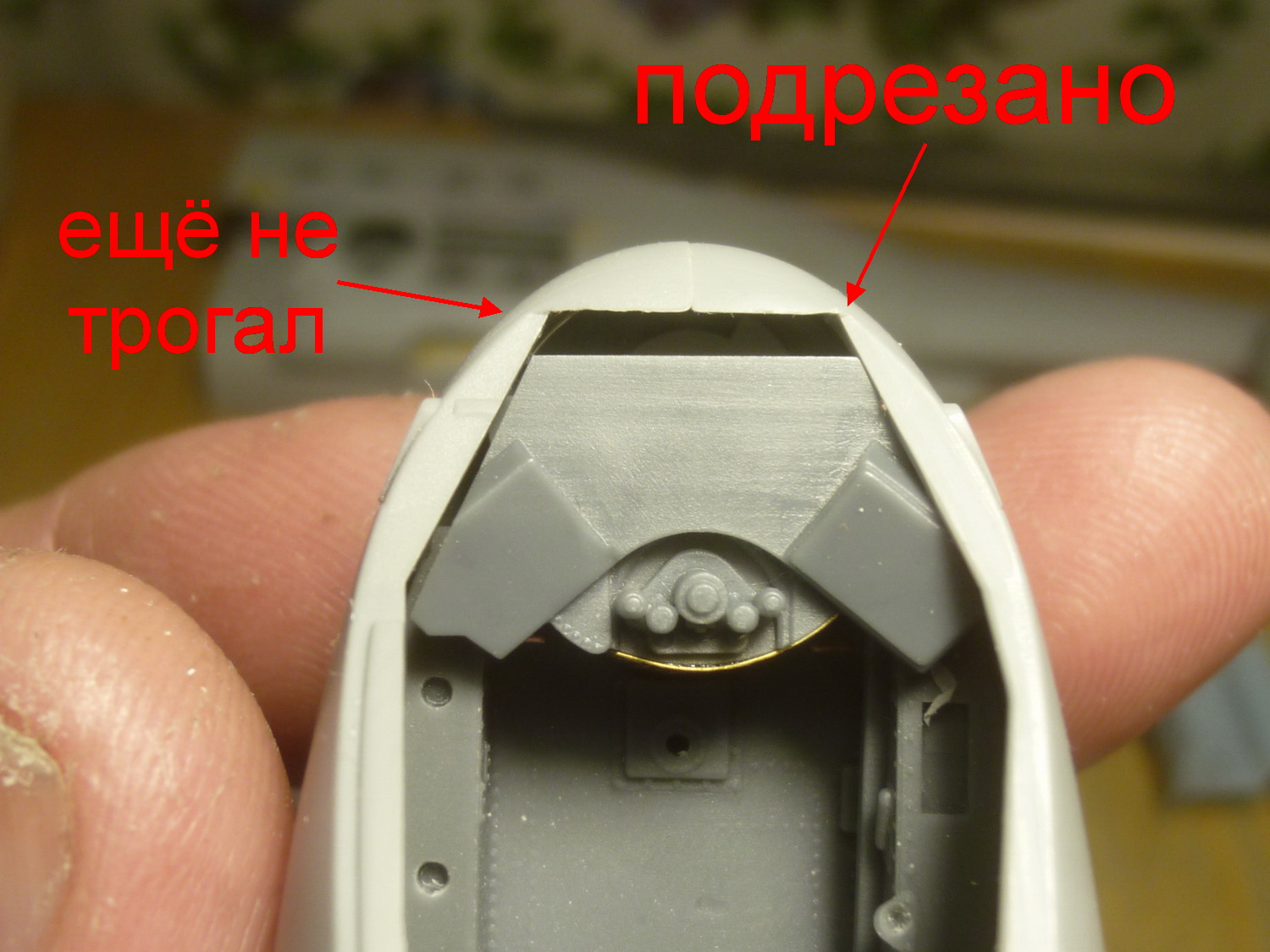 Правый борт носовой части фюзеля был приклеен к нижней, чтобы более точно подогнать смолу к борту. В результате, примерка смолы на своё место выявила необходимость подтачивания борта изнутри и это ещё до установки площадки под прицел оператора вооружения. После её установки пришлось подтачивать посадочное место фонаря. Справившись с правой стороной примерил левую - "фигвам", точите и её...