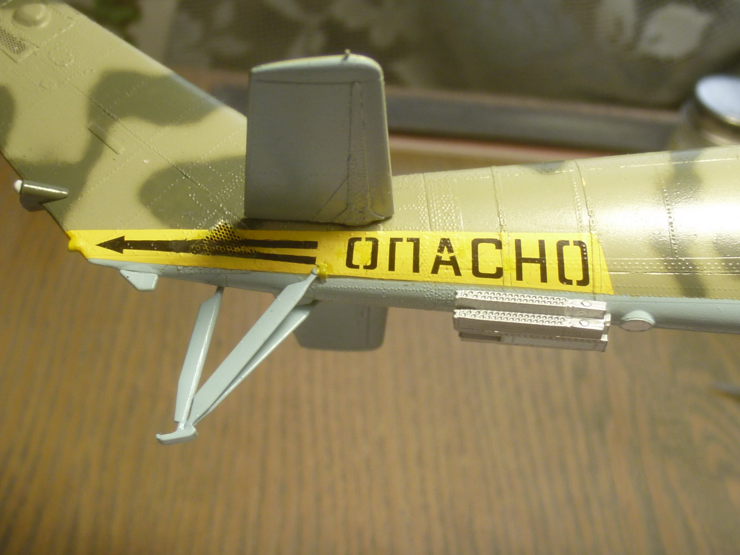 Пошла доработка и всякая мелочёвка на фюзеле. Сегодня сделал отражатели на фары. Жёлтая подложка под надпись "ОПАСНО" при переводе на место сильно потрескалась - надо не забыть про это и на следующем лучше накрасить. А здесь удалось хорошо прижечь и подкрасить. Установил основные стойки шасси, чтобы не ломать постоянно антенны.