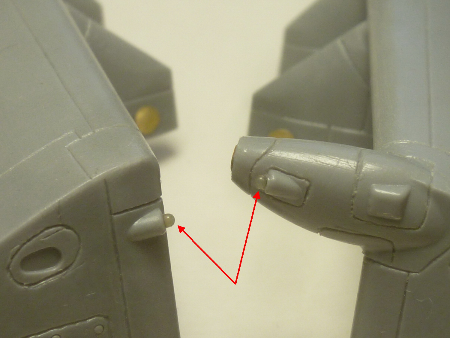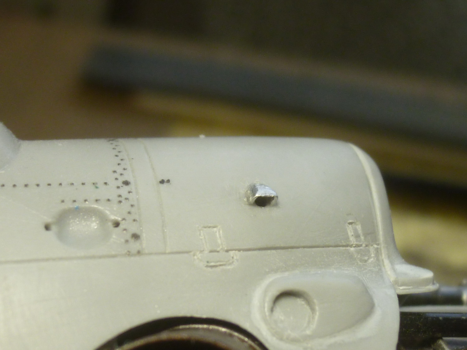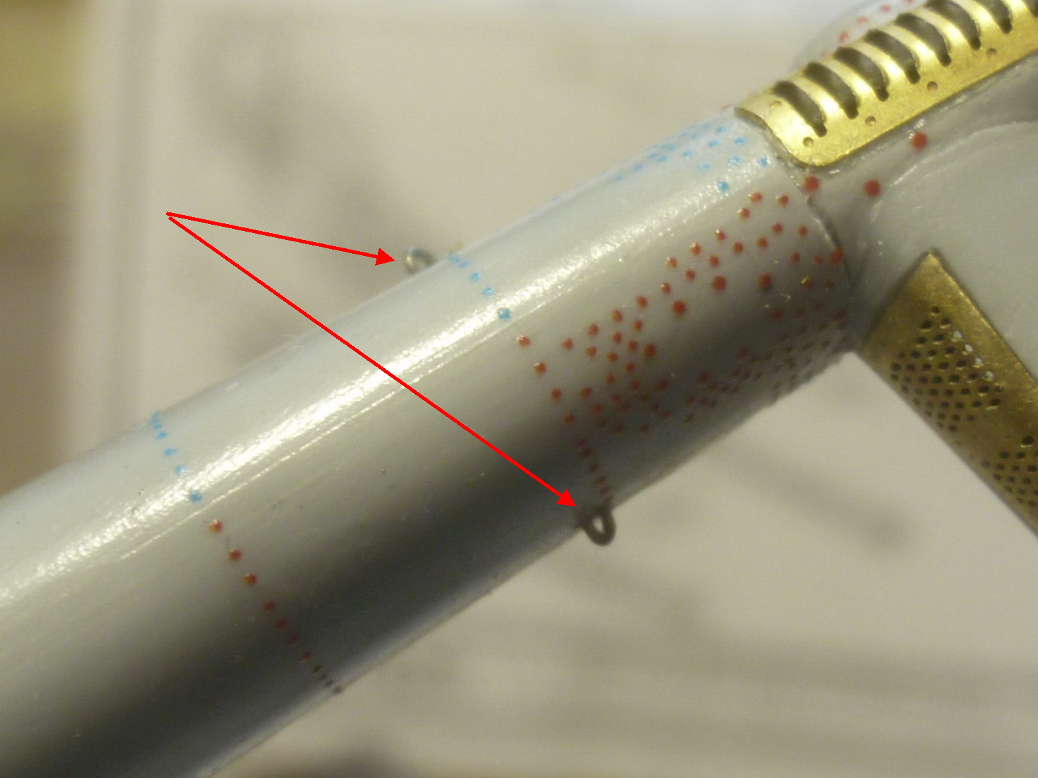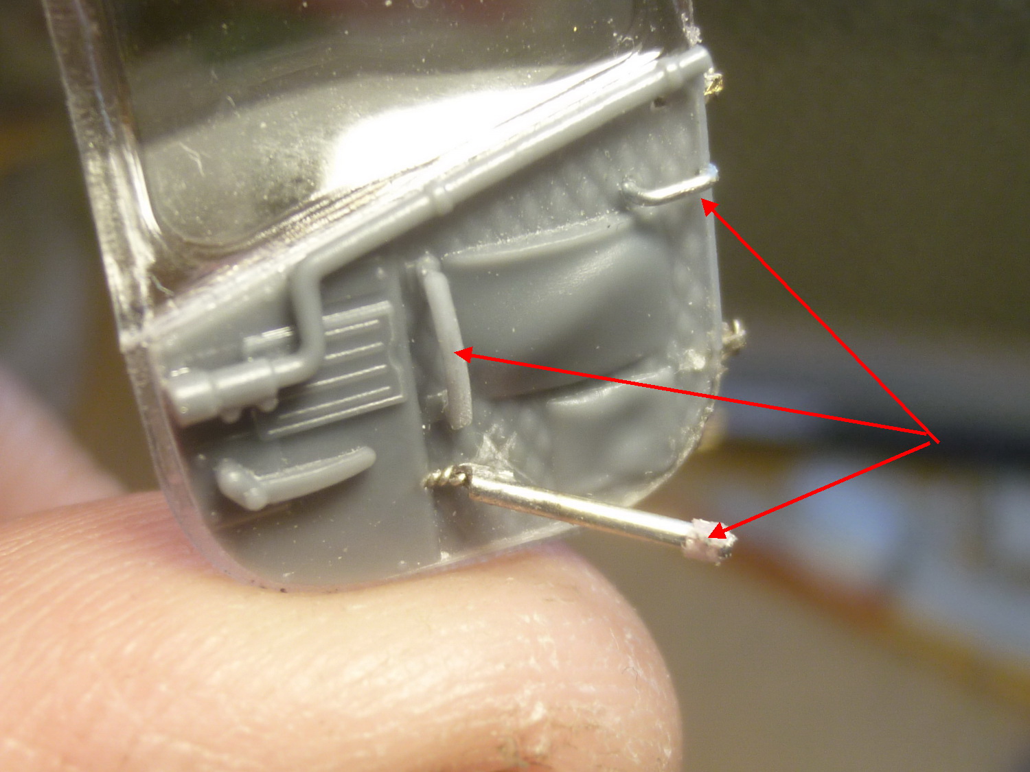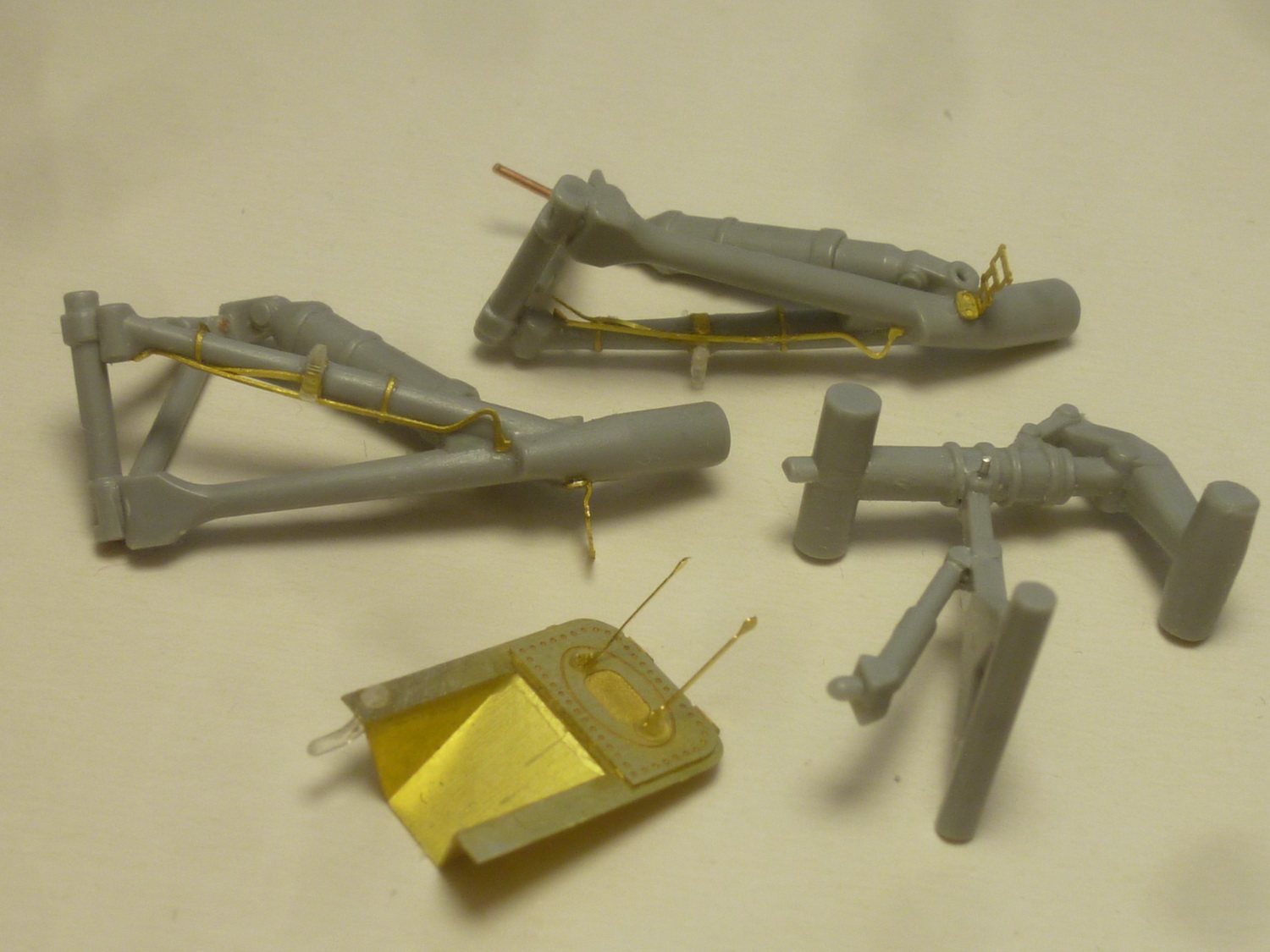 Склеил травлёные дворник из травлёнки, подклеил тоненькую проволочку, чтобы придать объём. Доработал стойки шасси и переднюю створку, добавив огни сигнализации выпущенного шасси. Сделал складную рукоятку патронного ящика, вклеил трубочки дренажа - основная их масса приходится на правый борт, под крылышками не смог подлезть... Покрасил в светло-серый хвостовую часть фюзеля.