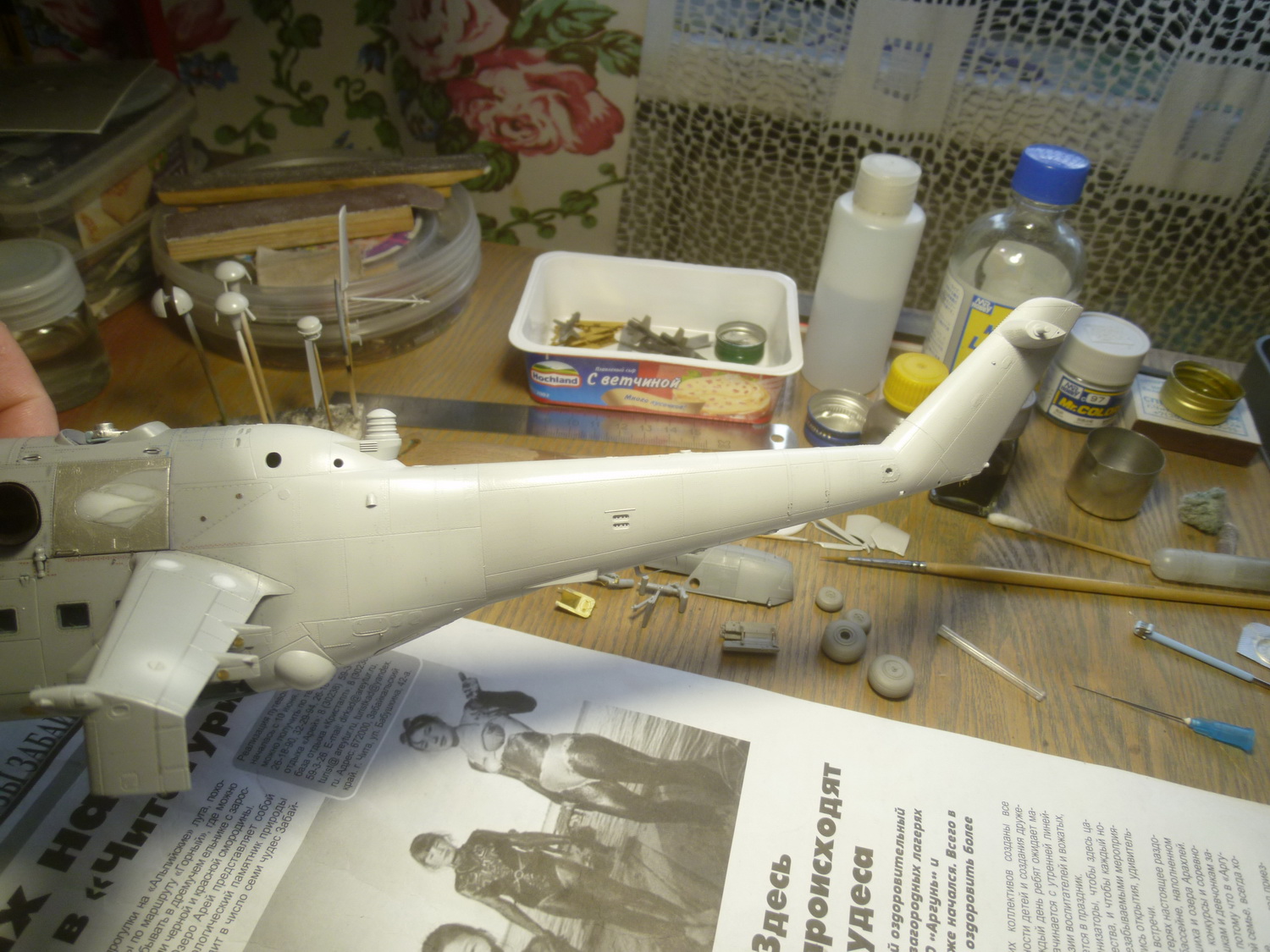Более углубленное изучение матчасти и копание в литературе окончательно подтвердили мои сомнения в модификации копируемого прототипа - у меня получается переходной "Д" (в натовской классификации Hind D), который был выпущен в количестве 370-ти экземпляров взамен отложенного "В" (Hind B), поскольку для него не были готовы ПТУР Штурм-В. Поэтому у него другие по форме обтекатели электронно-оптической станции и лазерного дальномера, отсутствует фара с левого борта и другие мелкие отличия. Поскольку идёт доделка основной части фюзеля, а хвост уже готов, то решено было его "обклепать" - чем и занимался сегодня.