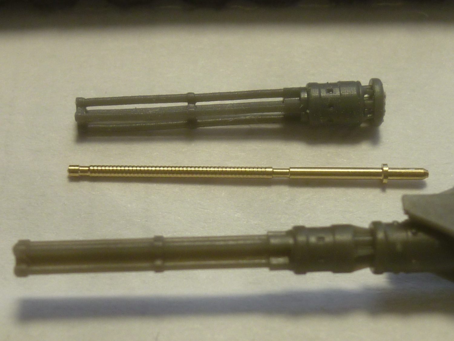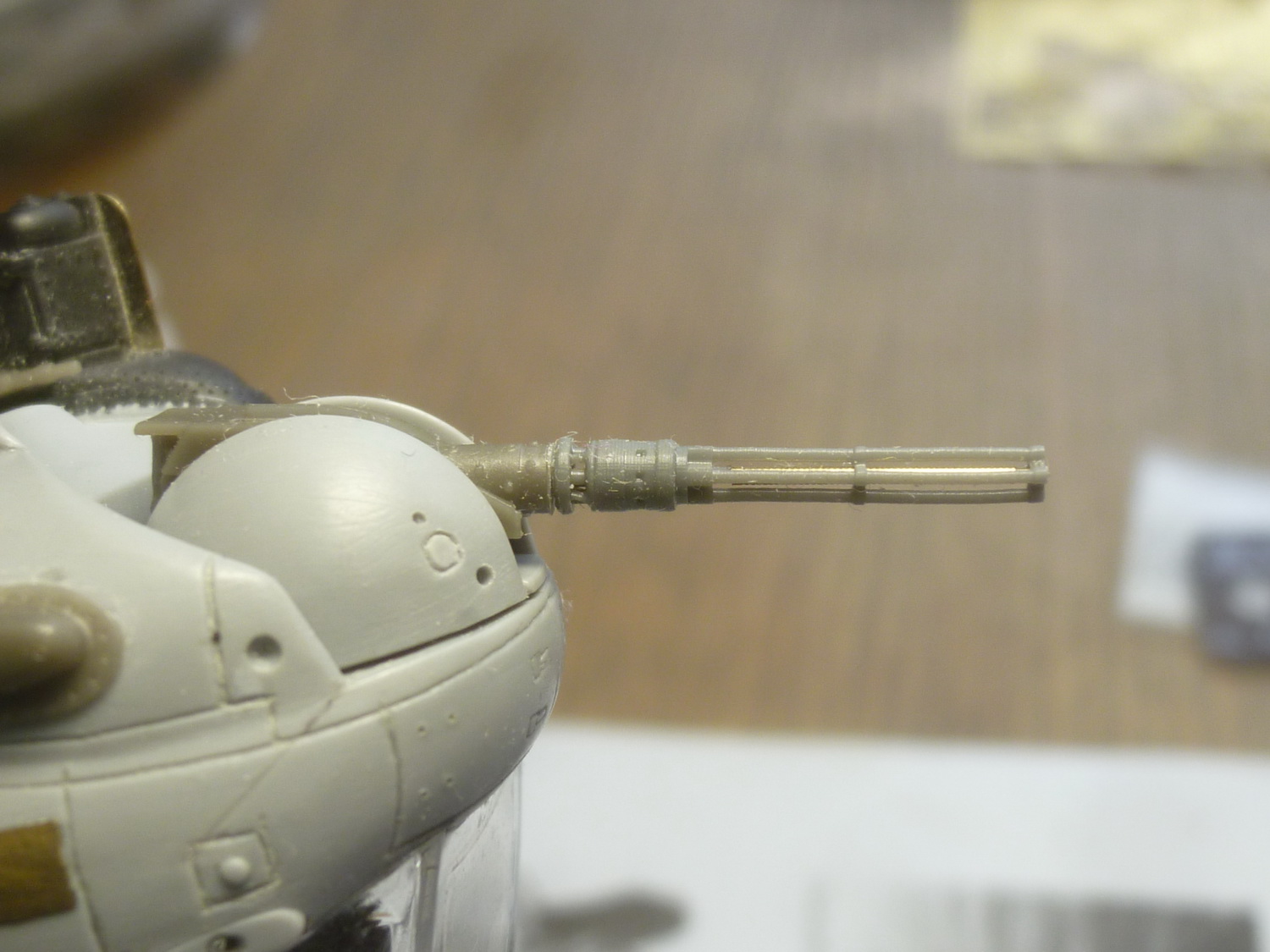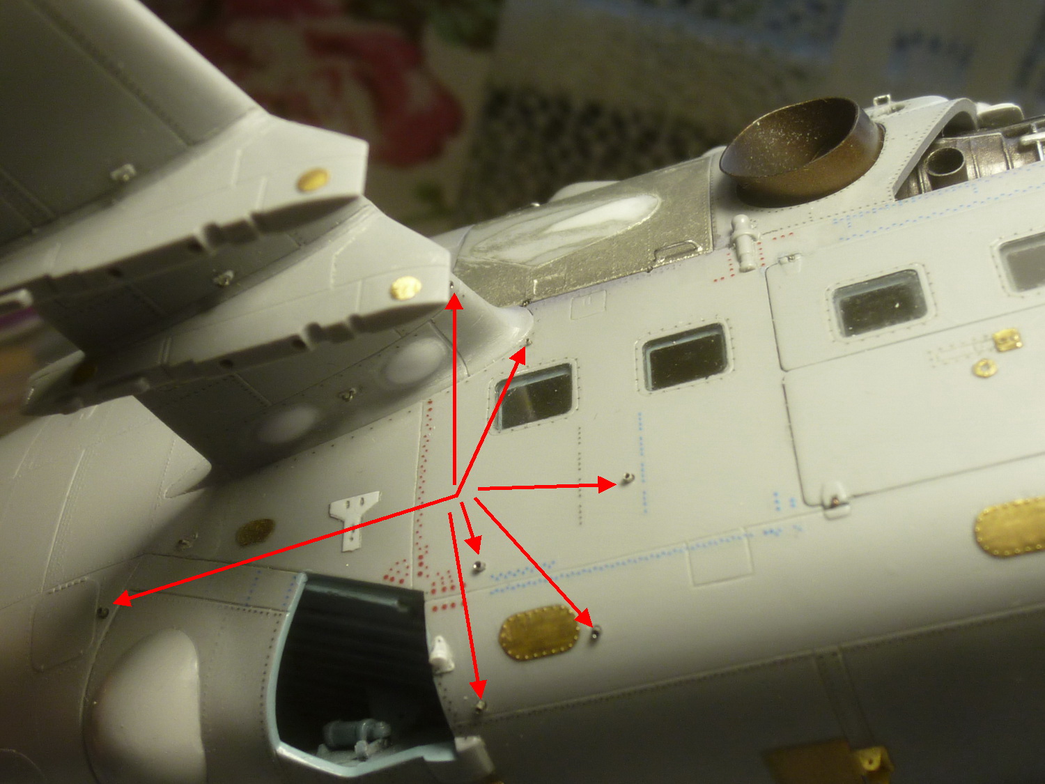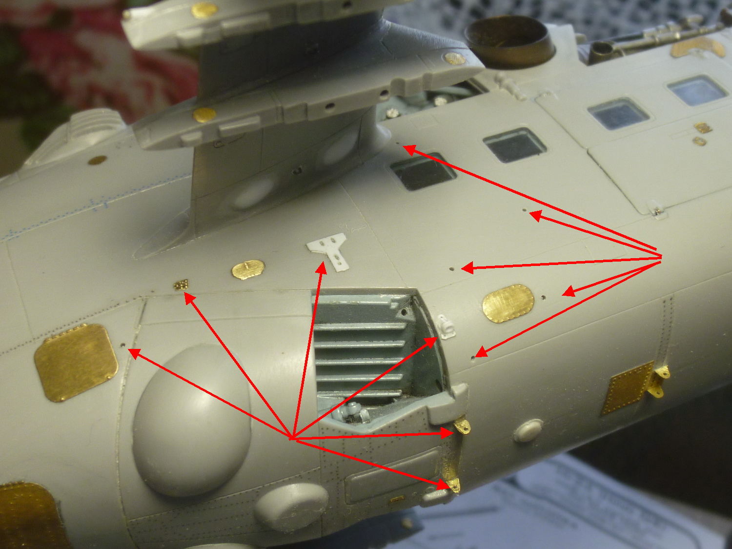 Наметил и просверлил самые видные дырочки на корпусе вертолёта, добавил скобочки, опоры для домкратов, усиления для крепления лебёдок, крепления для внешней грузовой рамы, переделал антенну "Эвкалипта" Р-828 и прочую мелочёвку. К модели были докуплены мастеровские и эдиковские стволы пулемёта, произвёл скрещивание.