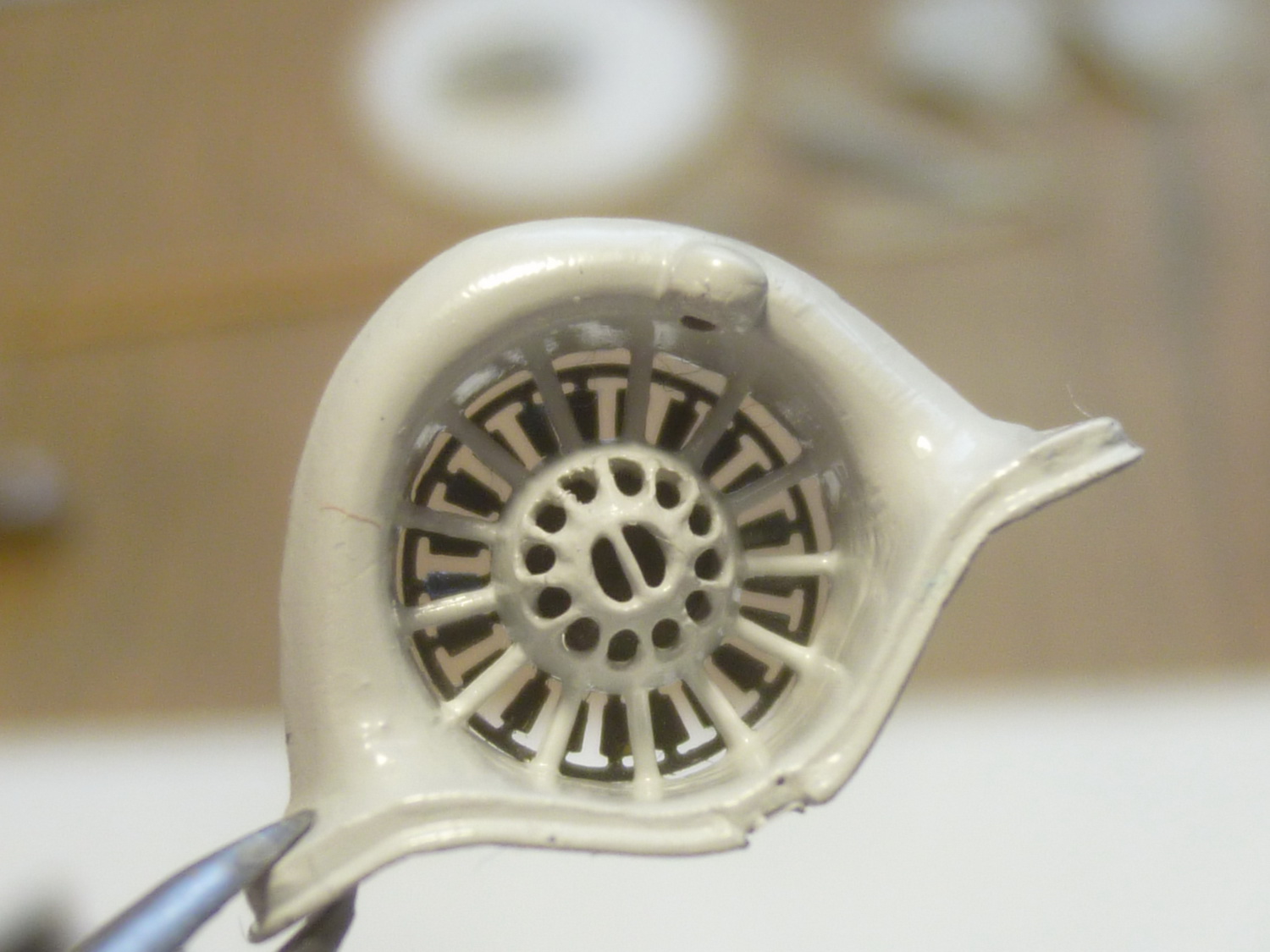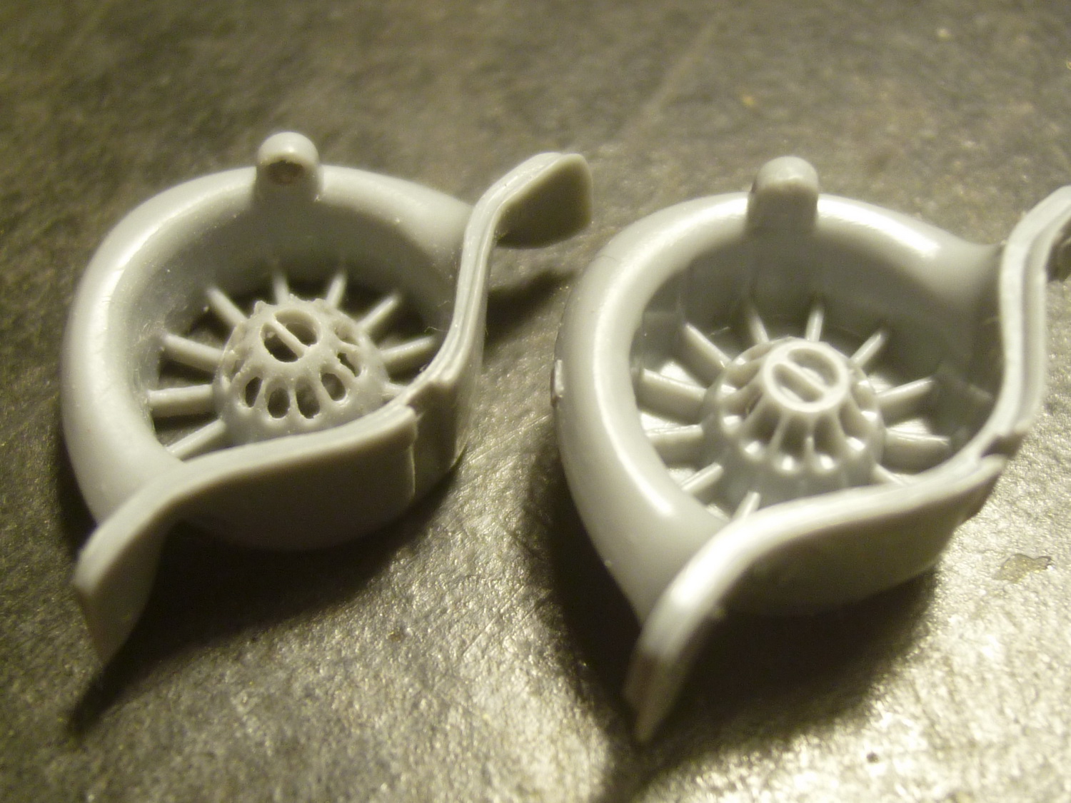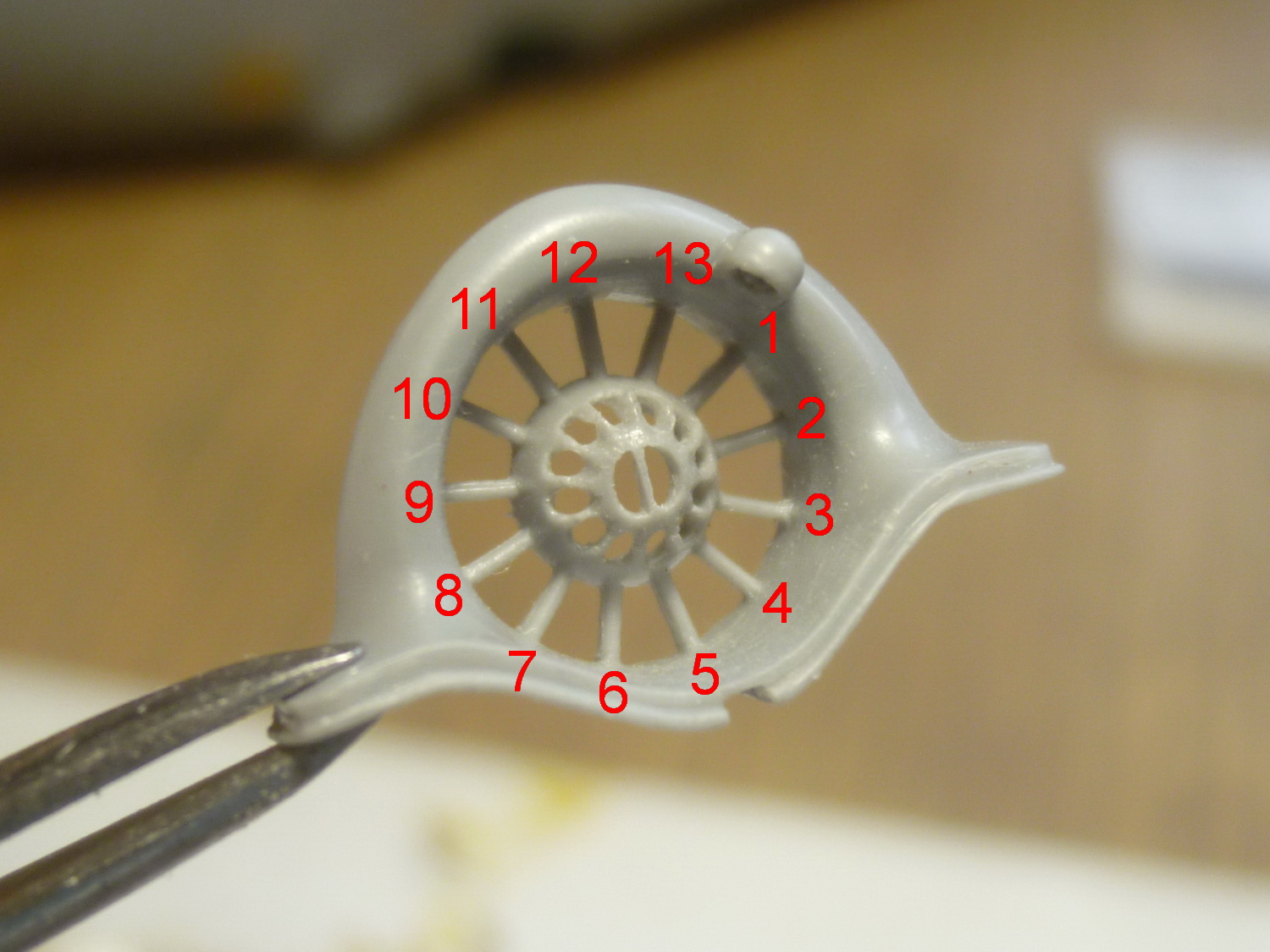 Решил слегка доработать вентилятор маслорадиатора над движками. Срезал заднюю часть на пластиковой детали, подточил до просвета и выбрал лишний пластик. Получились аккуратные 13 пластинок ВНА, хотя их дожно быть 17. На следующем переделаю и их. Обточил с внешней стороны центральное тело, с внутренней - алмазной шарожкой довёл до минимально возможной толщины и сделал прорези. Мелочь, а приятно!