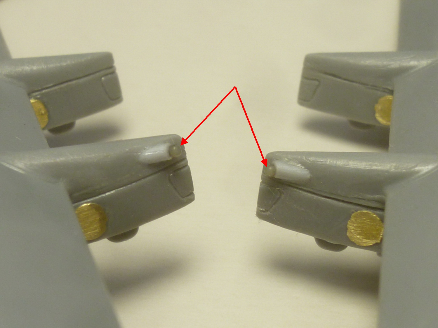 Приклеил лючки на носовую часть. С правой стороны оставшиеся неиспользованные с армовского травления для "В" - их толщина минимальна и смотрится очень даже ничего. А вот с левой стороны и снизу решётки вентиляции от МД имеют излишнюю толщину и смотрятся ужасно!