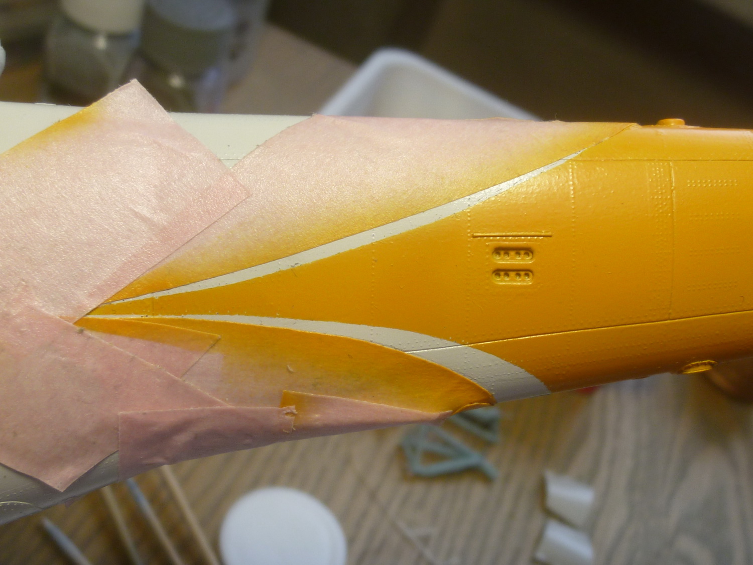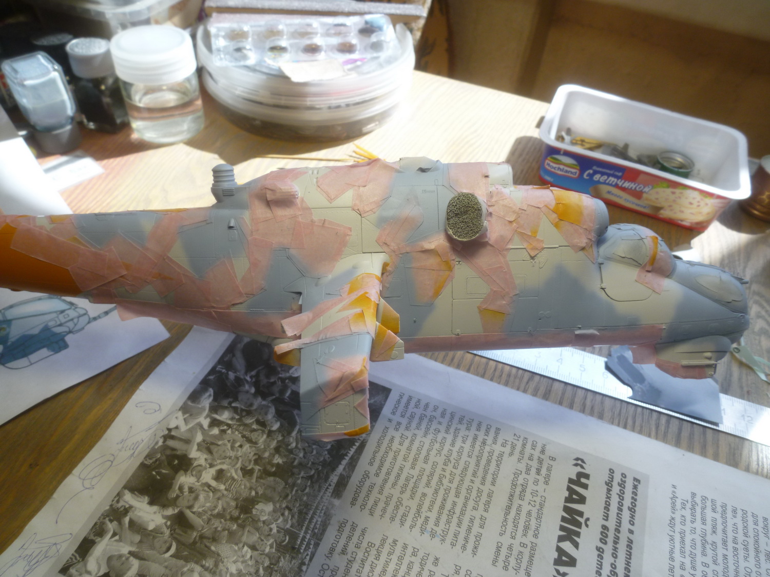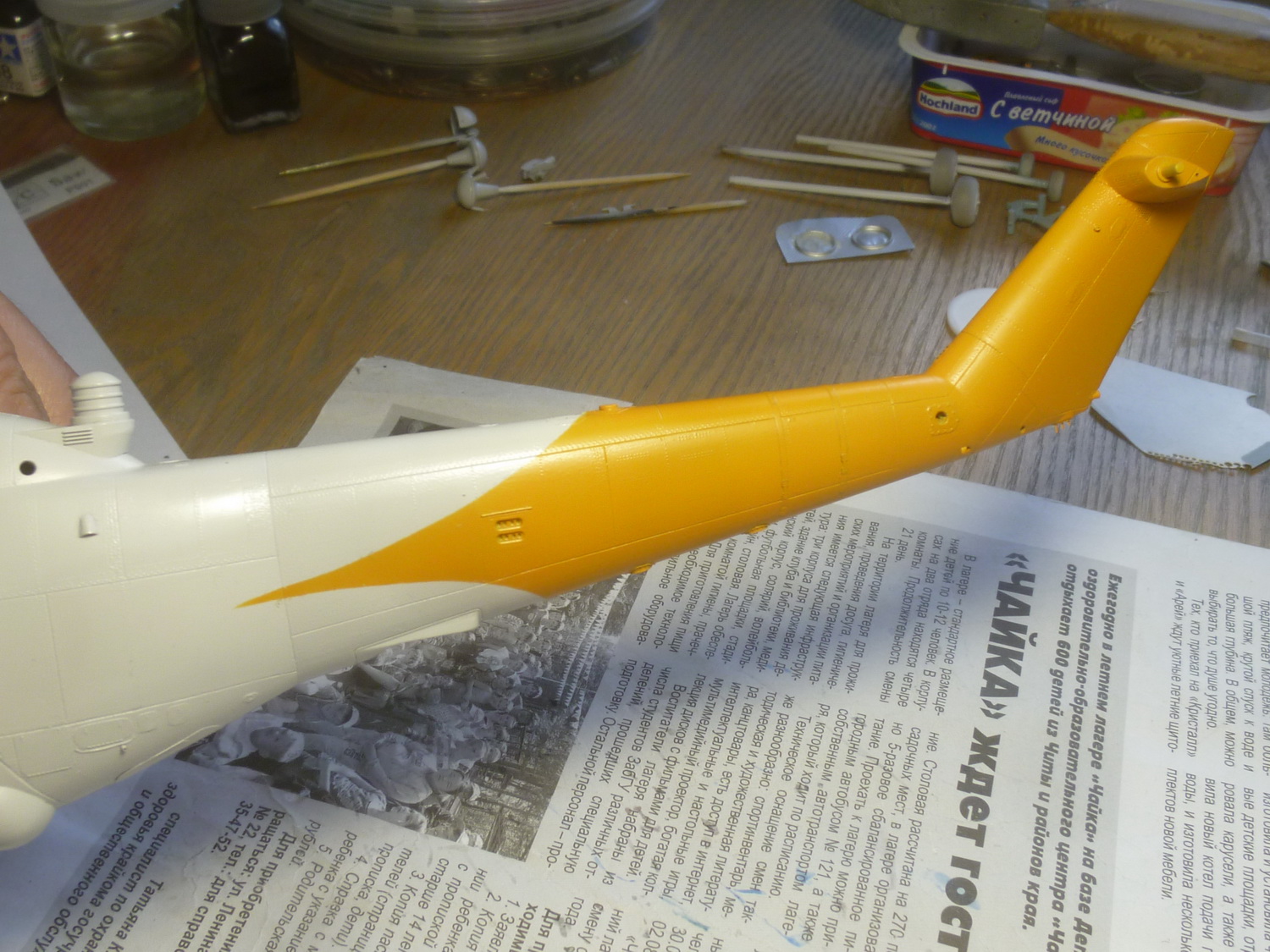 Покрасил весь фюзель светло-серым, нанёс маски для покраски оранжевого хвоста и "пролетел"... Пришлось корректировать по фотографиям. Кстати, пришлось удалить антенну "Эвкалипта" - именно на этом её нет.