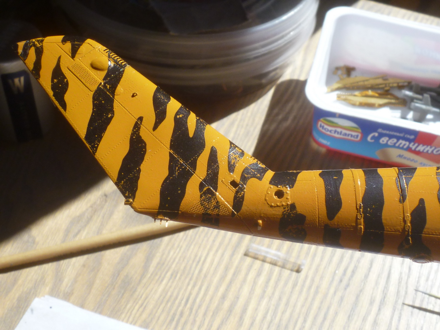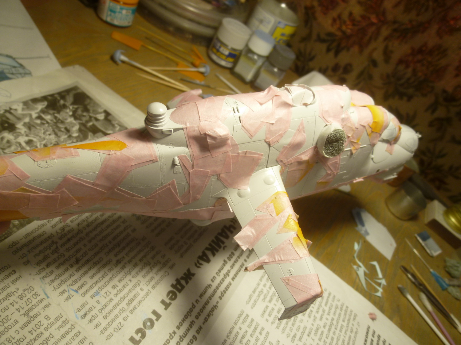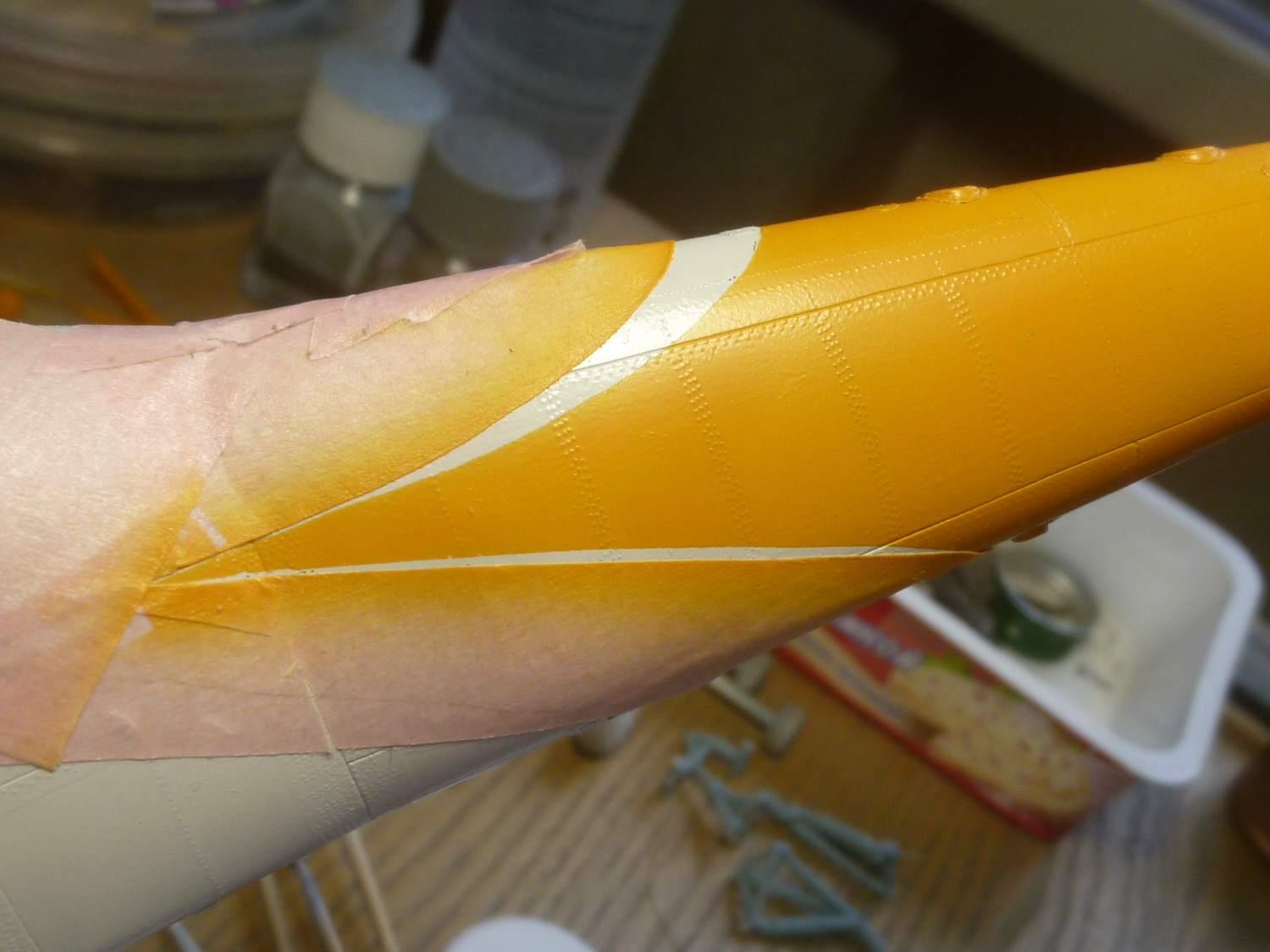 Покрасил весь фюзель светло-серым, нанёс маски для покраски оранжевого хвоста и "пролетел"... Пришлось корректировать по фотографиям. Кстати, пришлось удалить антенну "Эвкалипта" - именно на этом её нет.