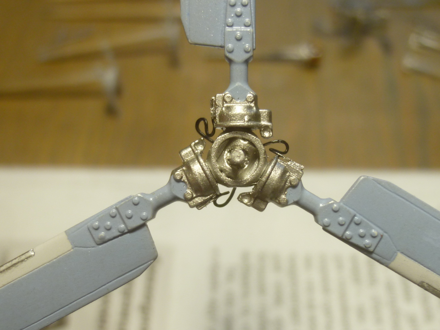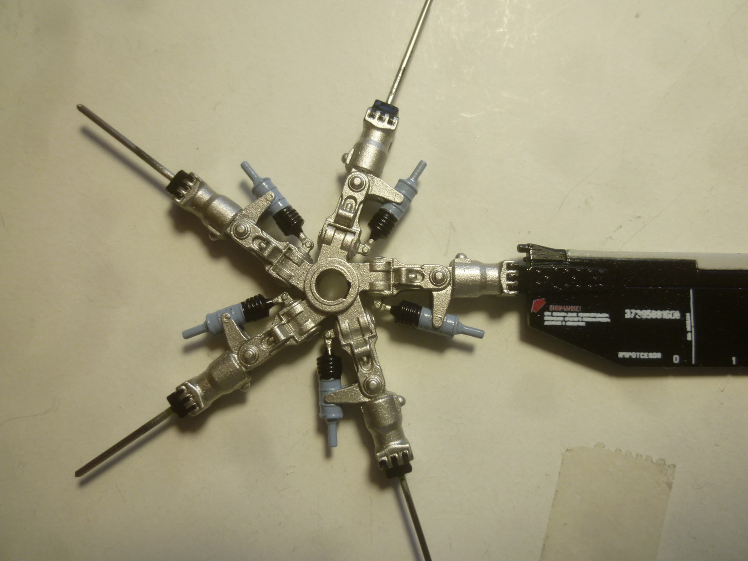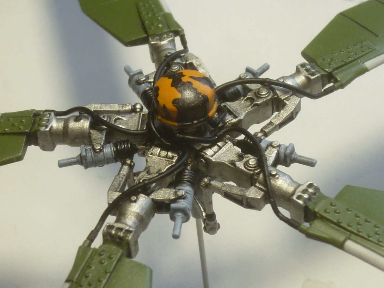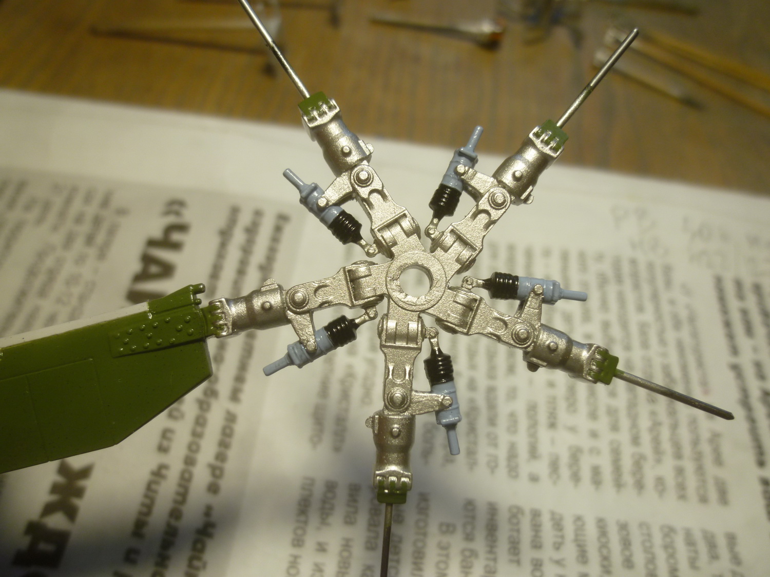 Доработал лопасти и колонки винтов. В рэскитовском наборе, который я приобрёл для будущего Ми-24П некоторые детали даны в двойном экземпляре ввиду поломок. Вот и взял оттуда автомат перекоса на РВ, сделав недостающее... Налепил маски в несколько заходов и покрасил.