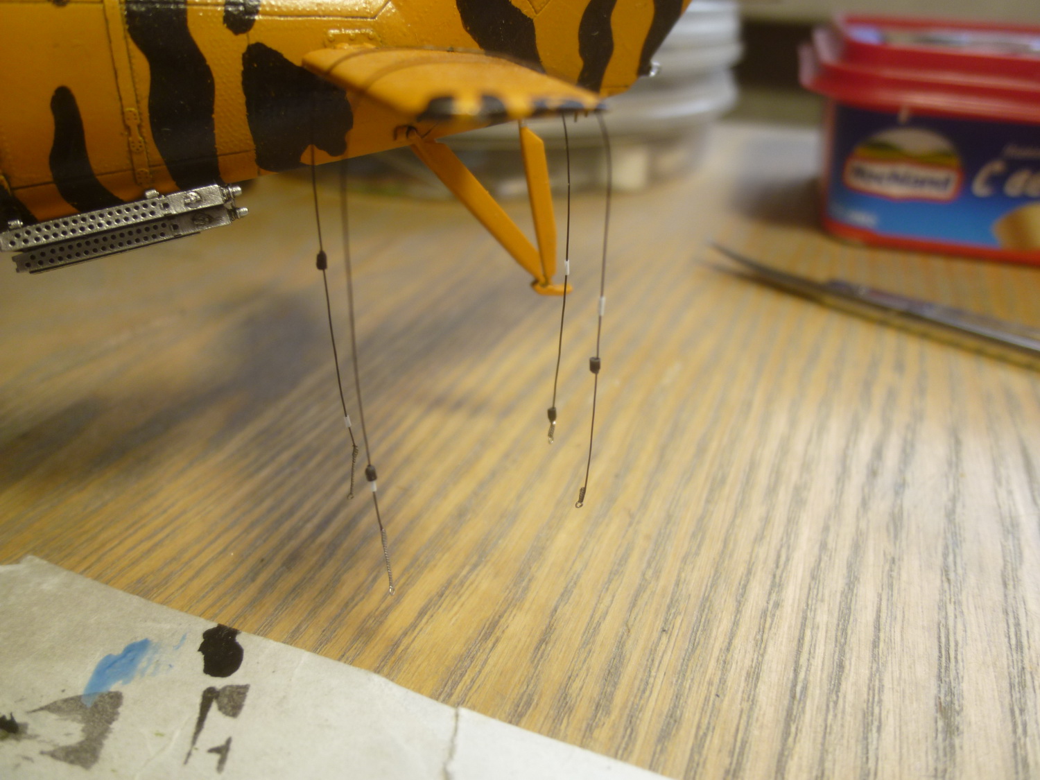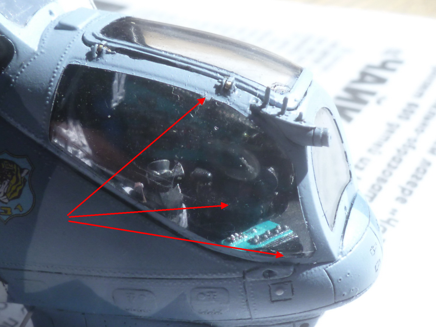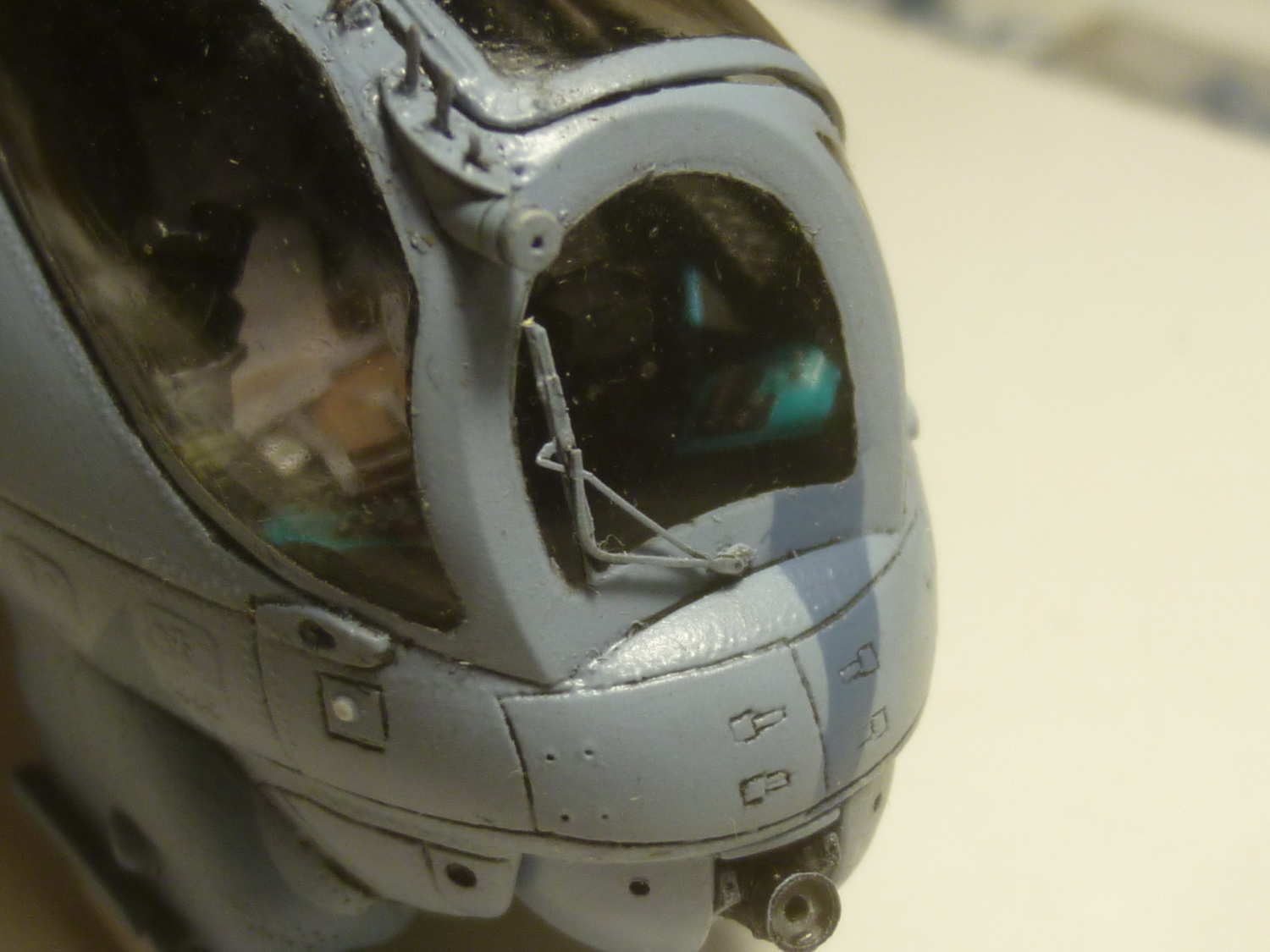 Доделал НВ и РВ, установил проблесковый огонь сверху хвостовой балки, накрасил строевые огни и воткнул хвостовой БАНО, покрасил статики. Установил на своё место турельку и решётку на фару под носовой частью фюзеля. Изобразил "щётку" на задней части дворников и установил их на свои места. Благодаря подклеенному шарику, пантограф находится на некотором расстоянии от стекла, что соответствует истине.