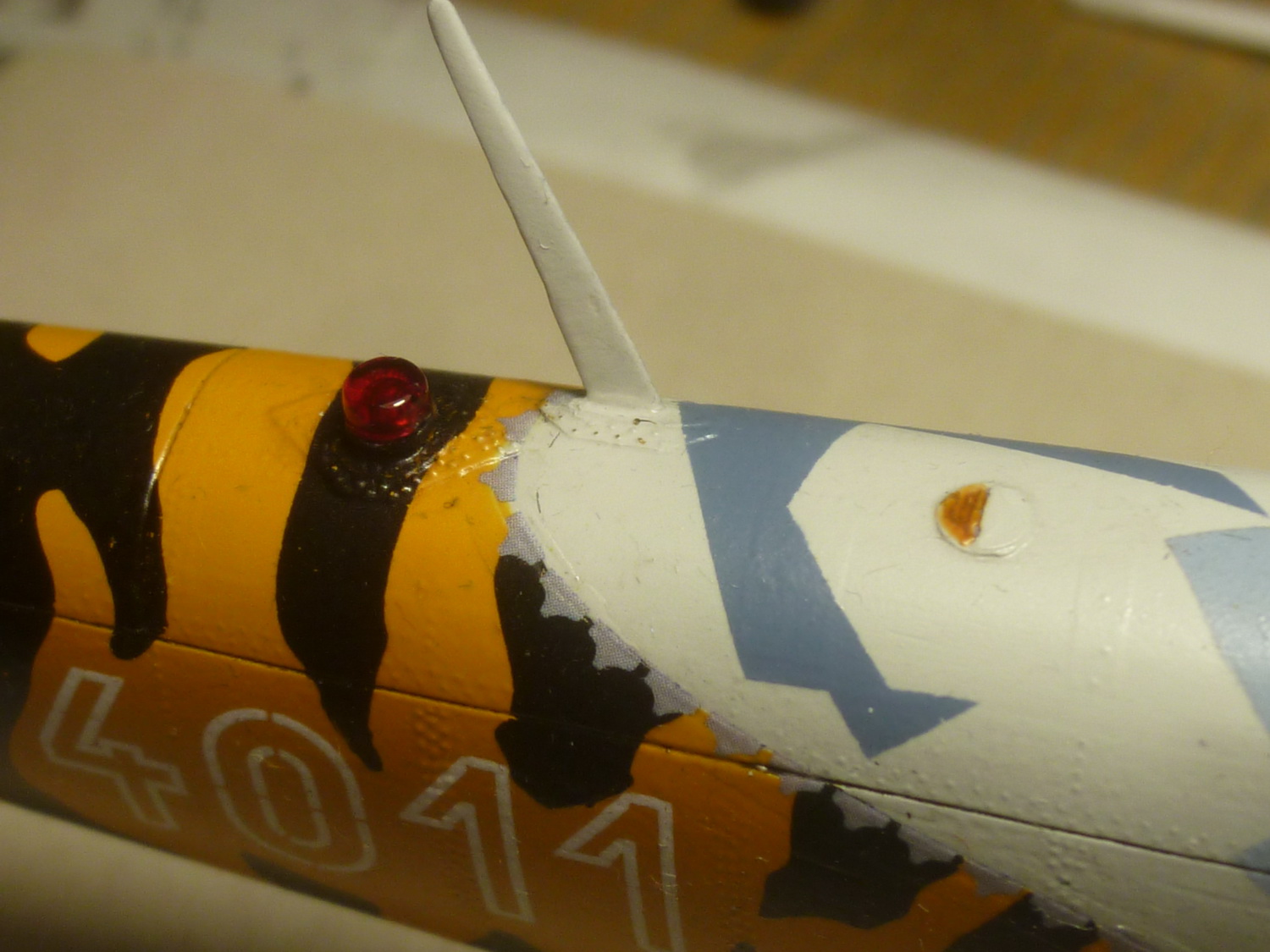 Сделал по новой антенны на верхнюю часть хвостовой балки и пару выводов в изоляторах. Вклеил кусочки прозрачного пластика в законцовки лопастей НВ с уже намеченными лампочками.