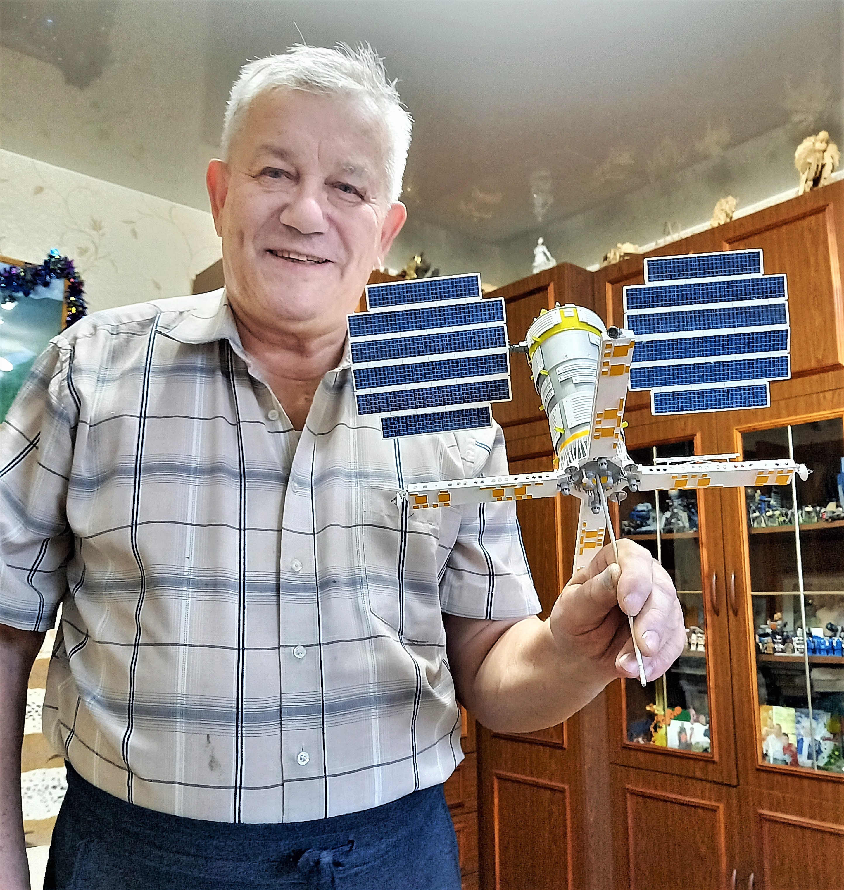 Для начала было решено воспроизвести в модели облик спутника «Лотос-С». По материалам, найденным в открытом доступе в интернете в М1/35 мною были прорисованы эскизы корпуса спутника, солнечных и антенных панелей, по которым Александром были выполнены программы для печати на 3Д-принтере и воспроизведены рендеры данных деталей. Прорисовка и доработка внешнего вида элементов экстерьера спутника производилась в ходе обсуждения и проработки программ для печати по рисункам и фотоснимкам моделей спутника с различных выставок, после чего была произведена распечатка деталей на 3D-принтере.