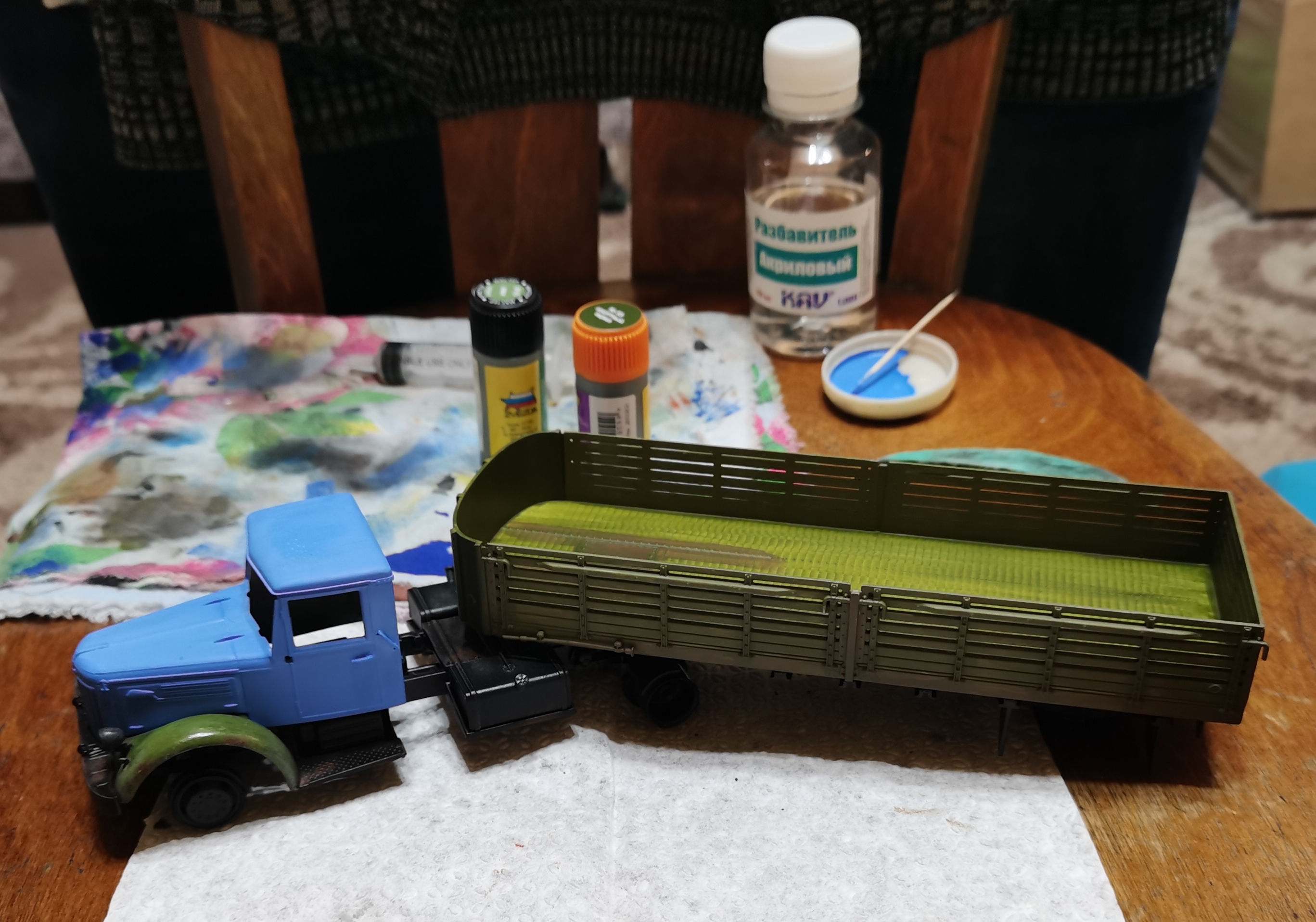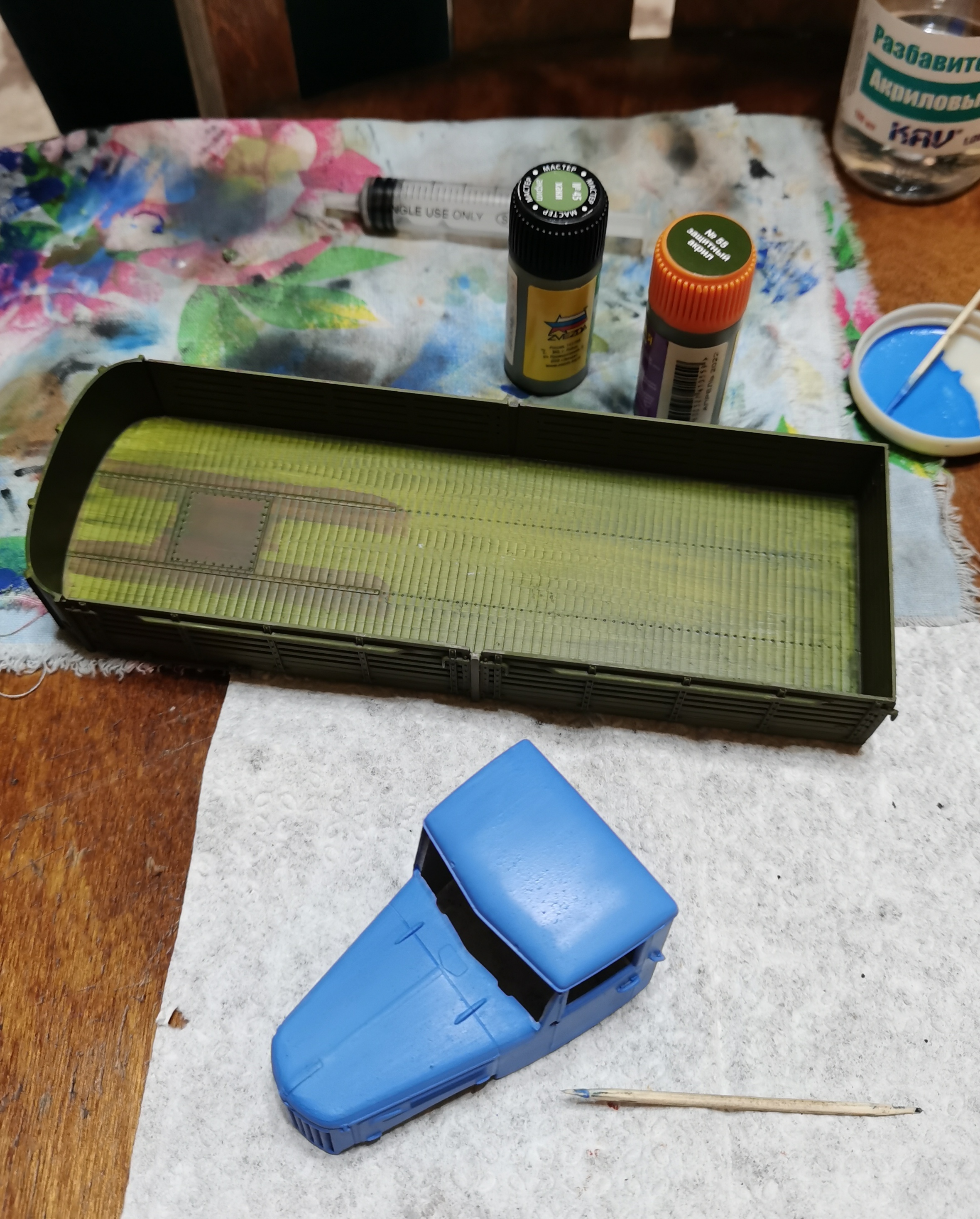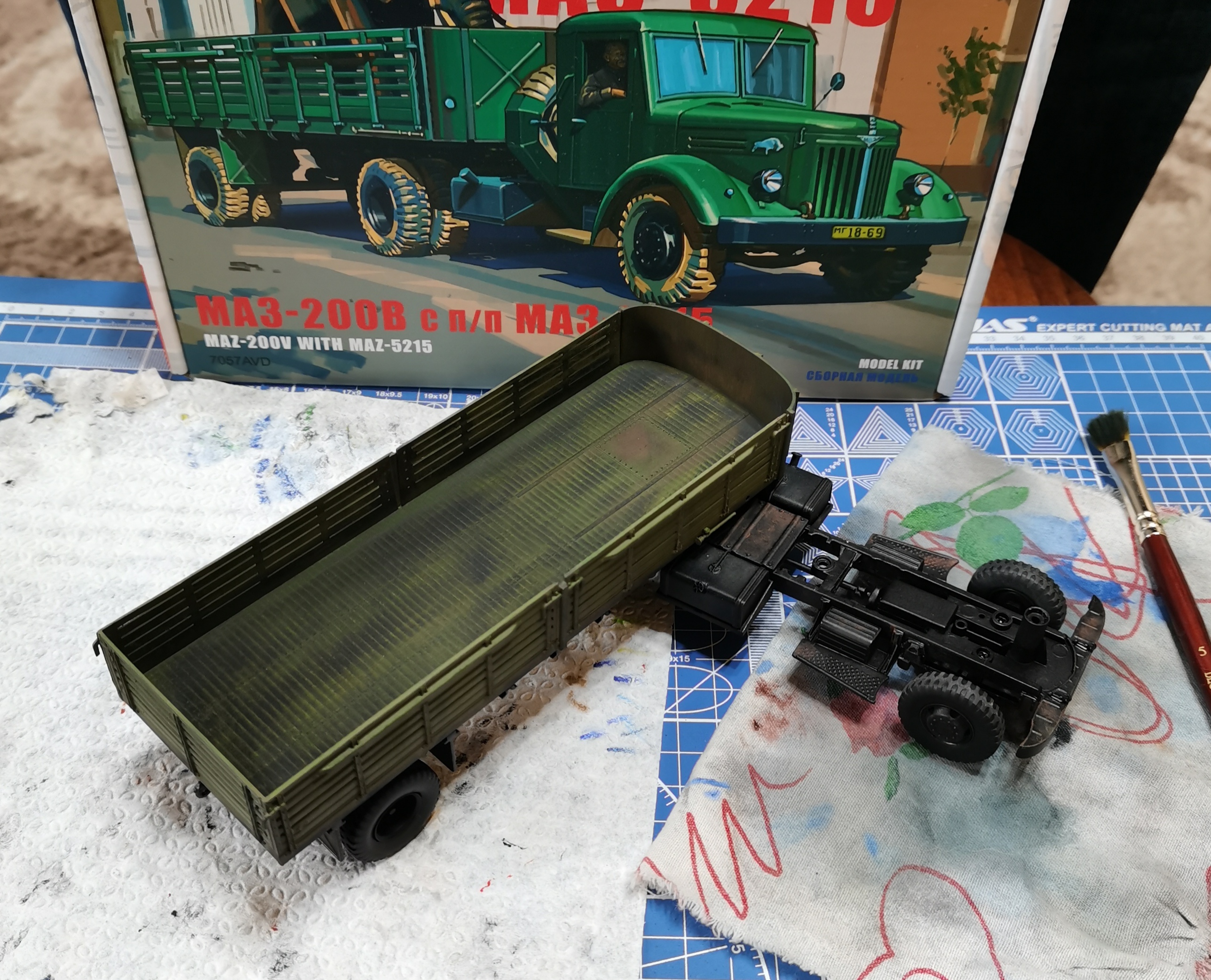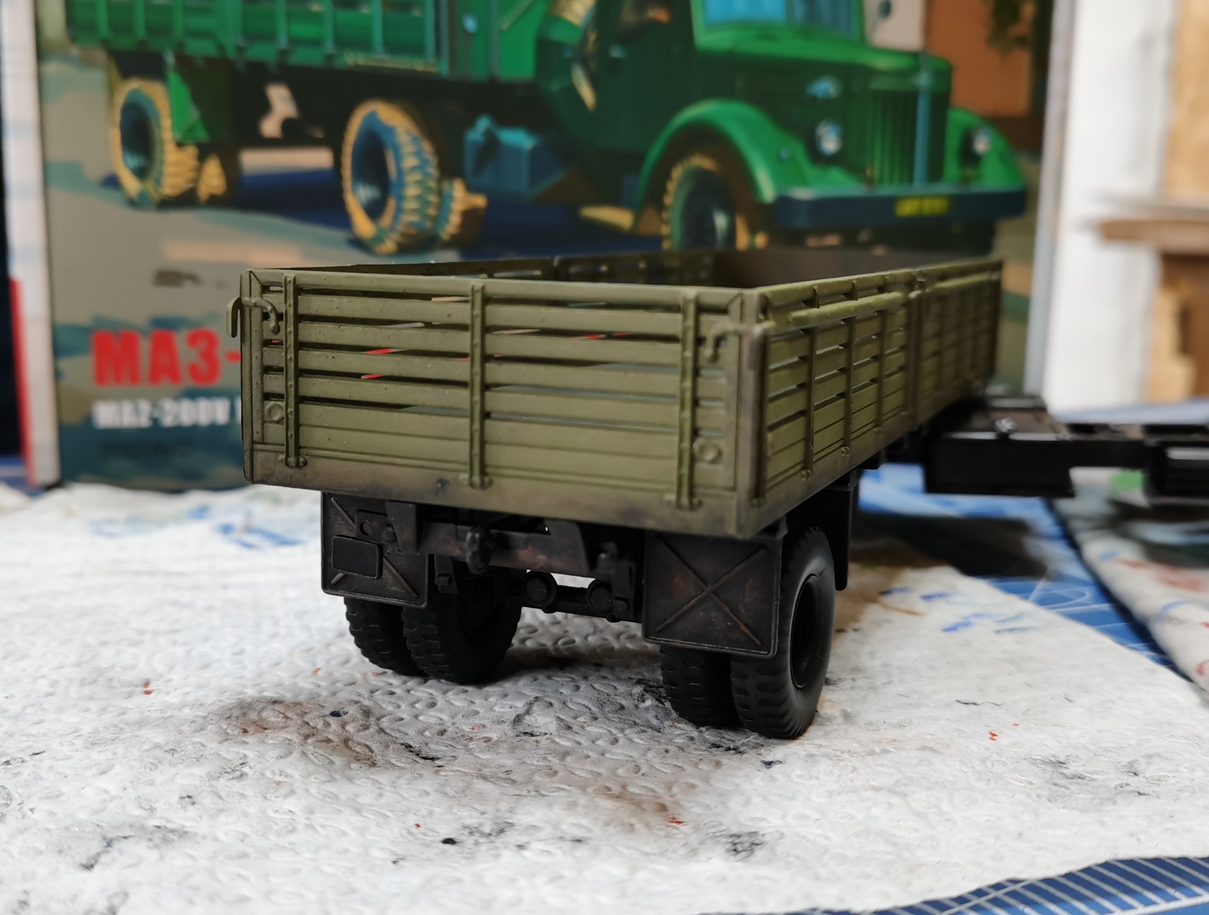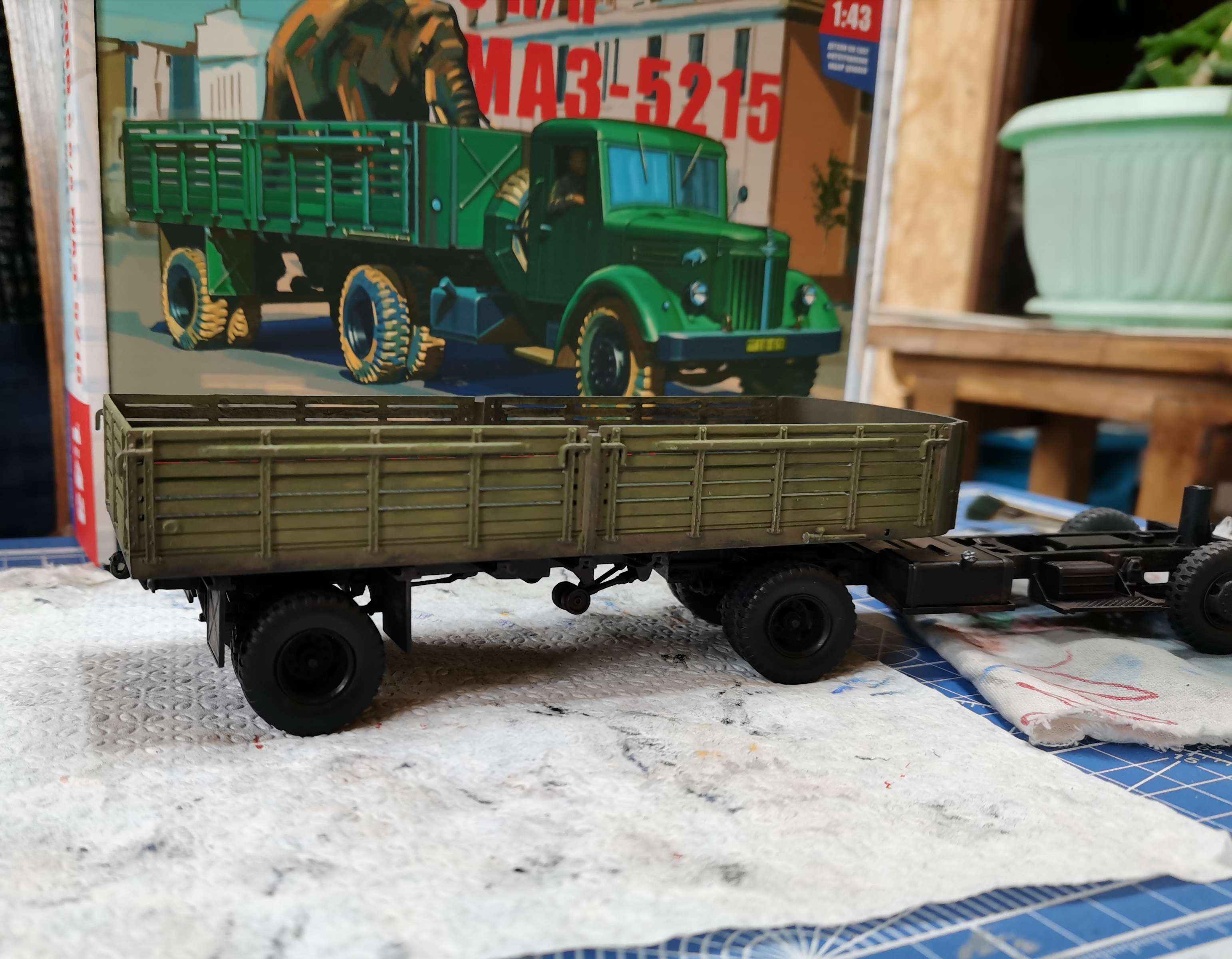 Пускай кабина пока отлёживается и просыхает, а я попробую поэкспериментировать масляной пастелью "Сонет" Невская палитра. Подопытным будет прицеп МАЗ-5215