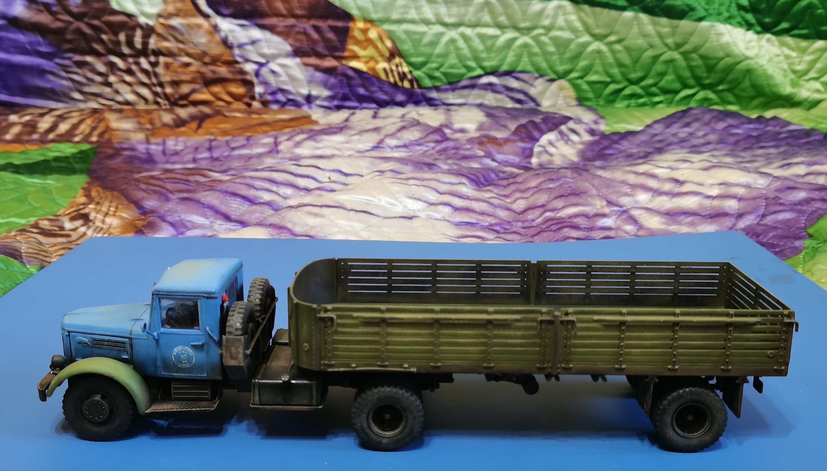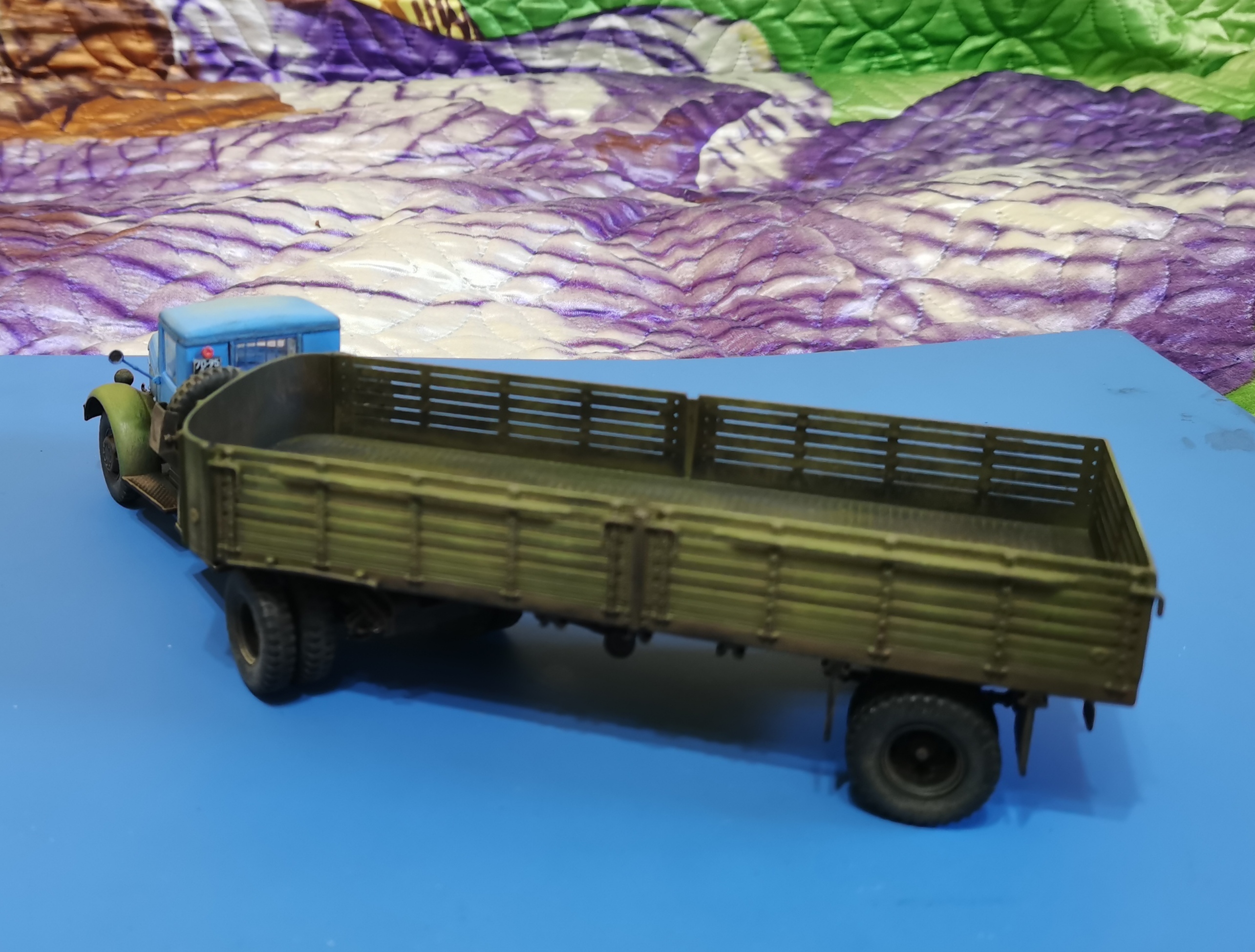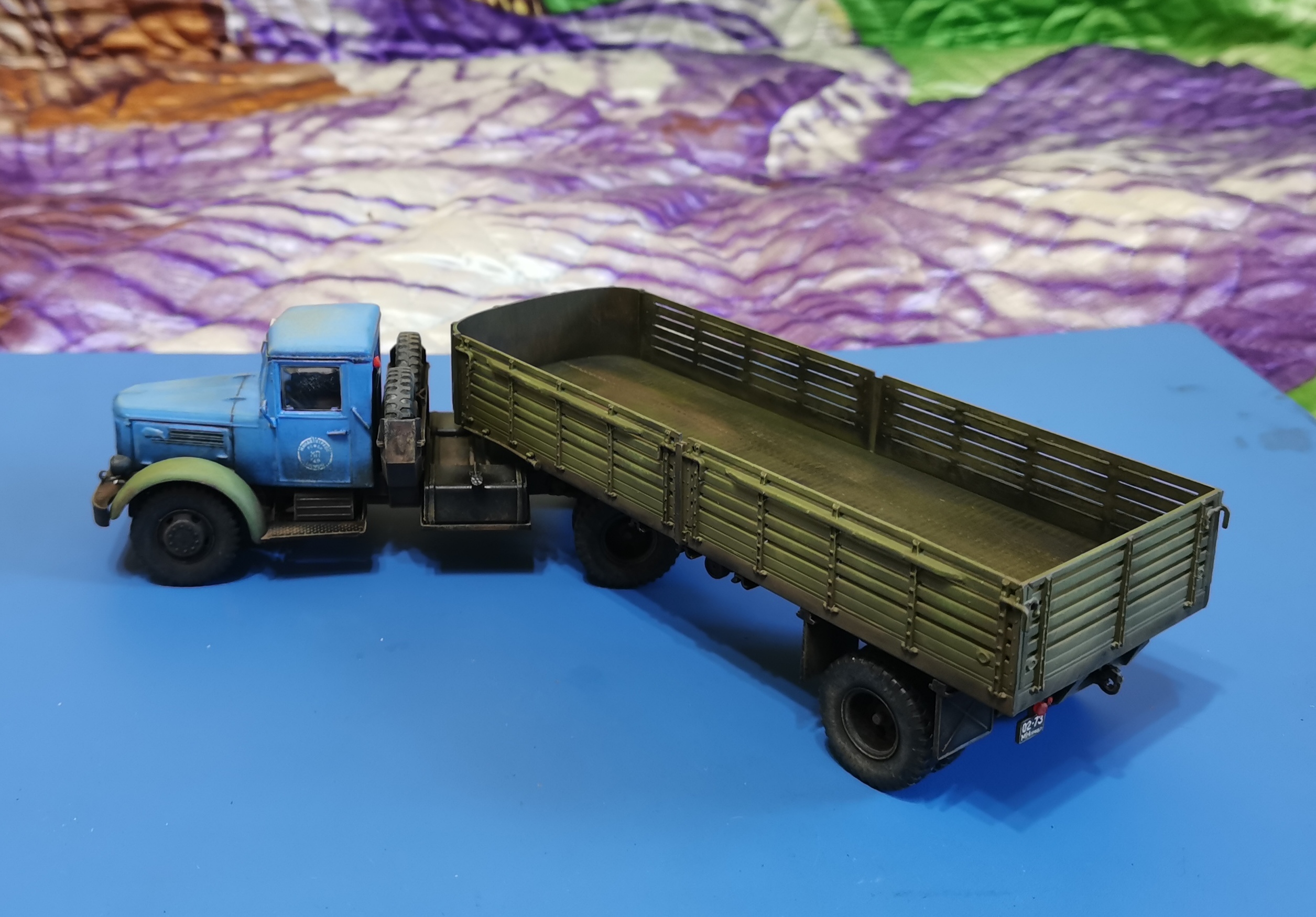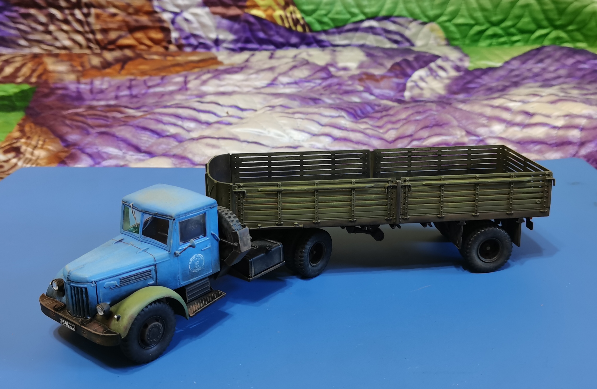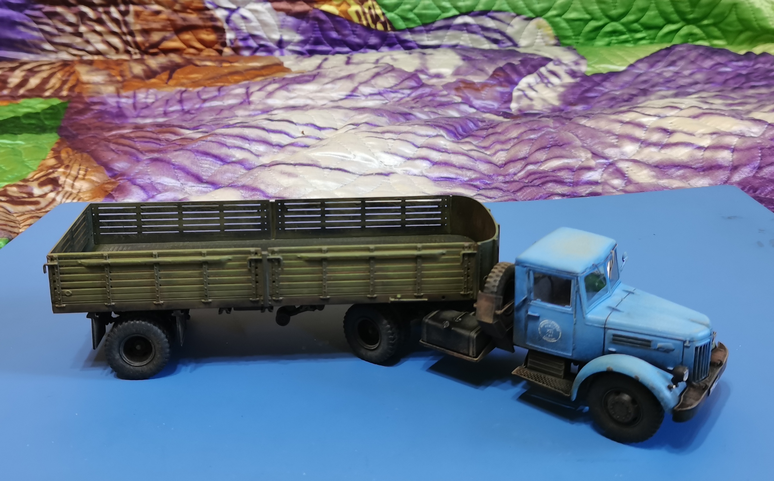 Дорогие Друзья! Представляю очередную работу автозавода, МАЗ-200В с п/п МАЗ-5215. Покраска проводилась кистью акрилом от Звезды, за исключением рам тягача и п/п XF-85 TAMIYA. Смывка мяслянные краски+растворитель для маслянных красок. В качестве пигмента использовал маслянную пастель "Сонет" Невская палитра. Глянцевый и матовый лаки в аэрозольных баллончиках TYTAN. Идею покраски подсмотрел на просторах интернет