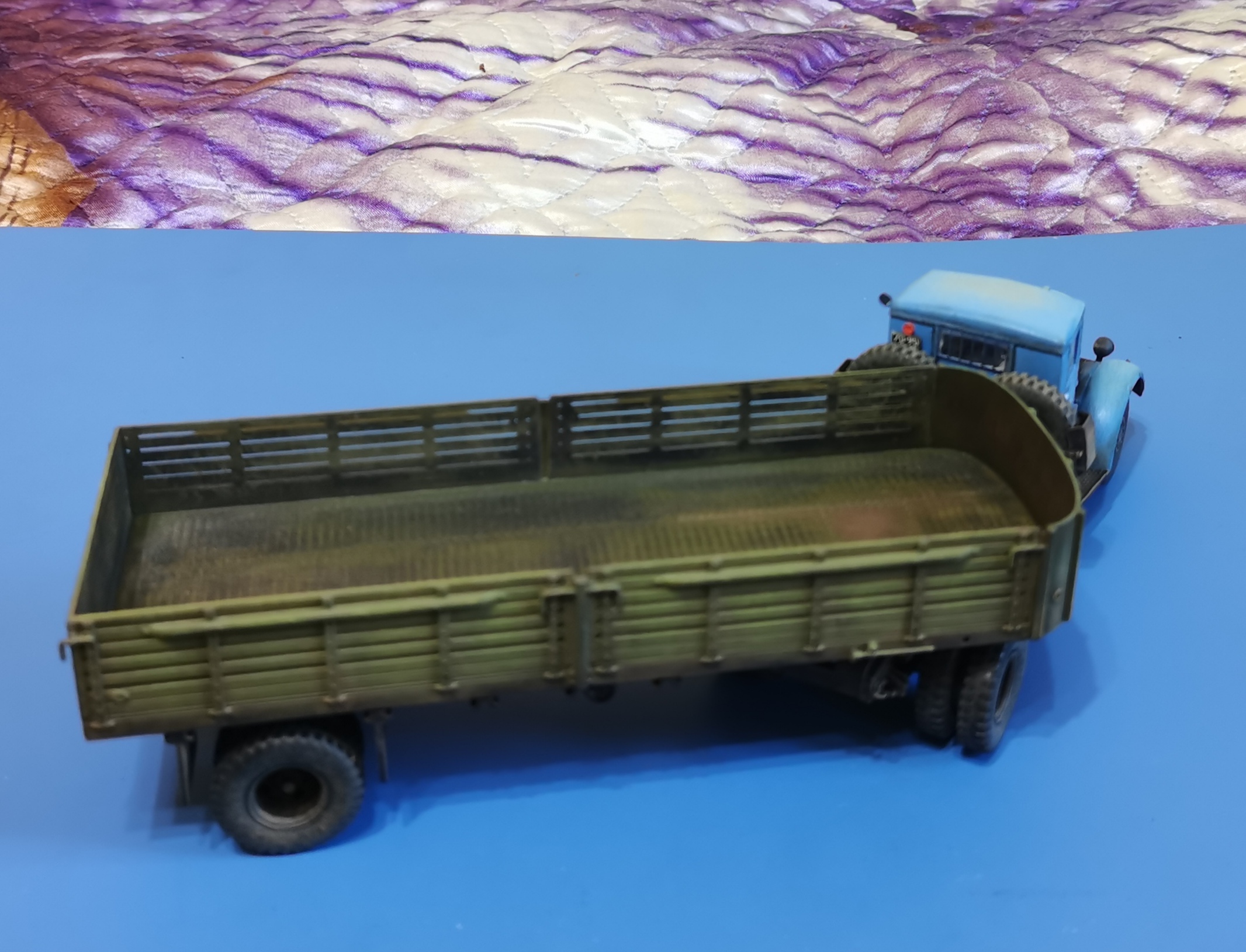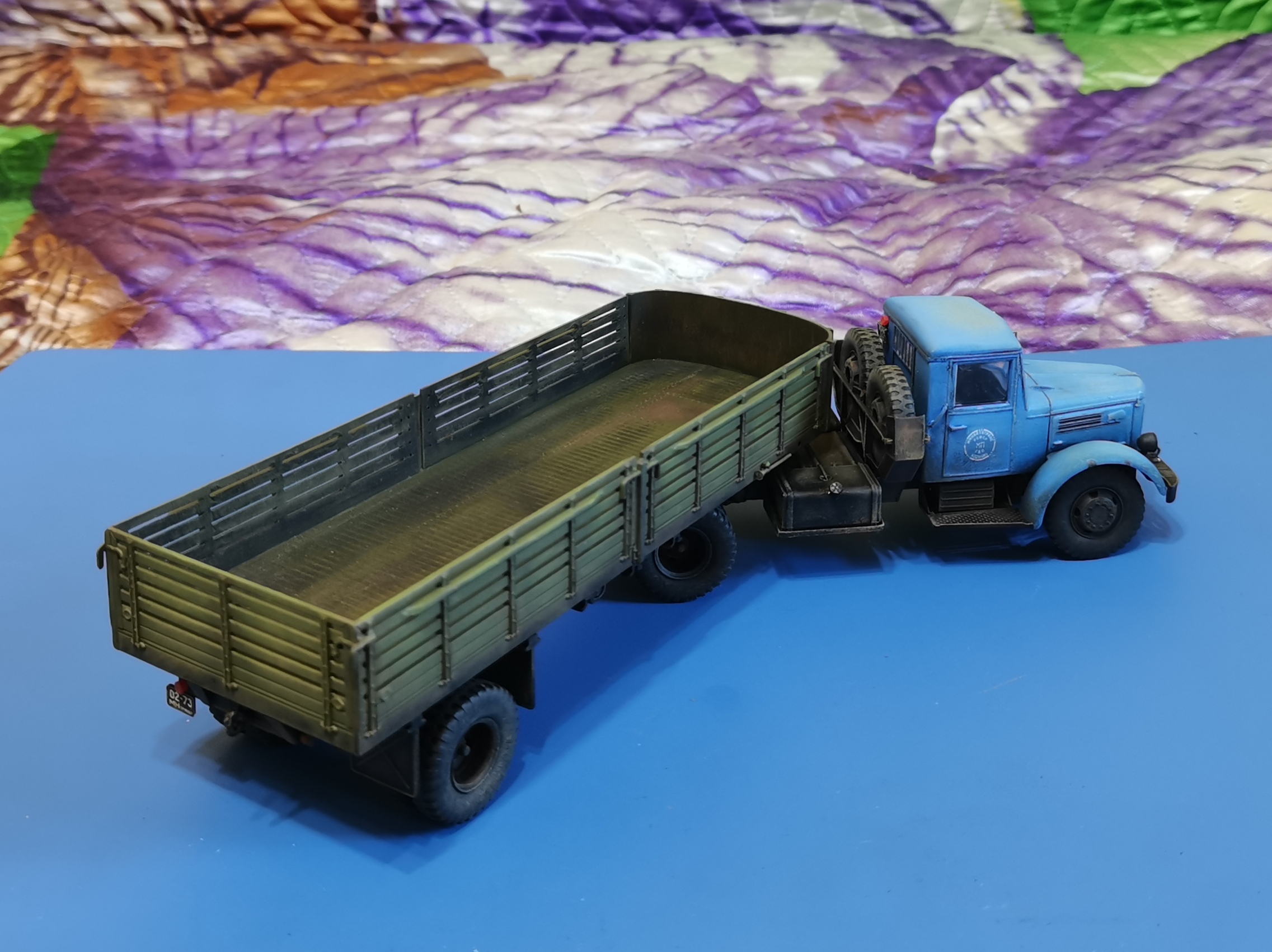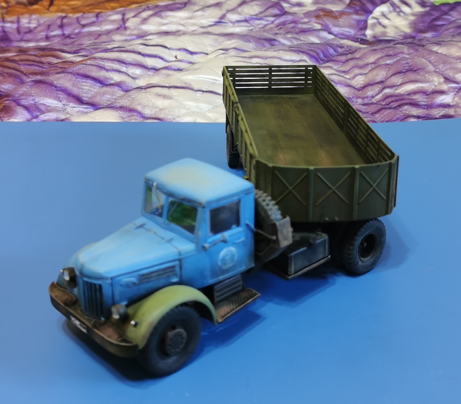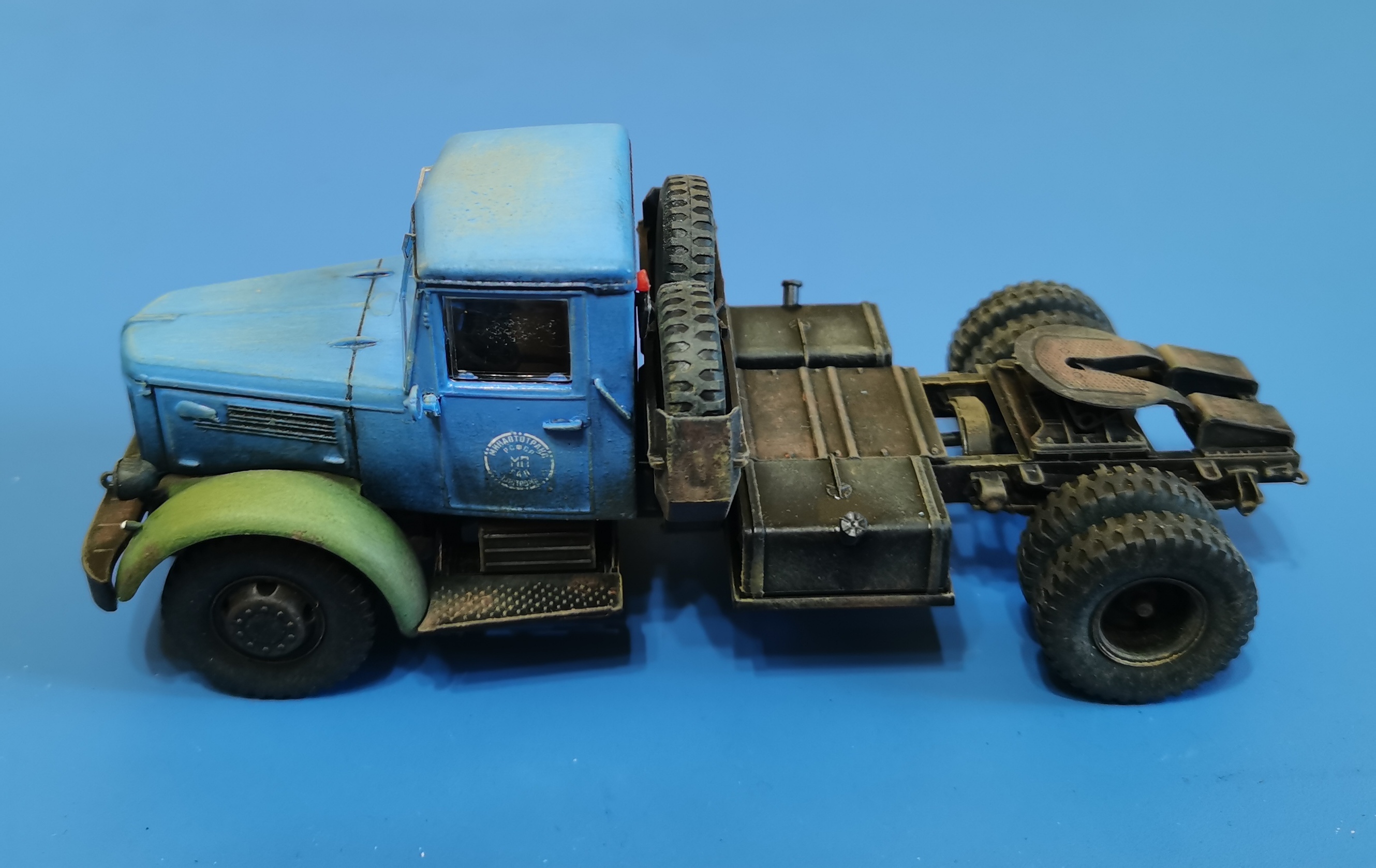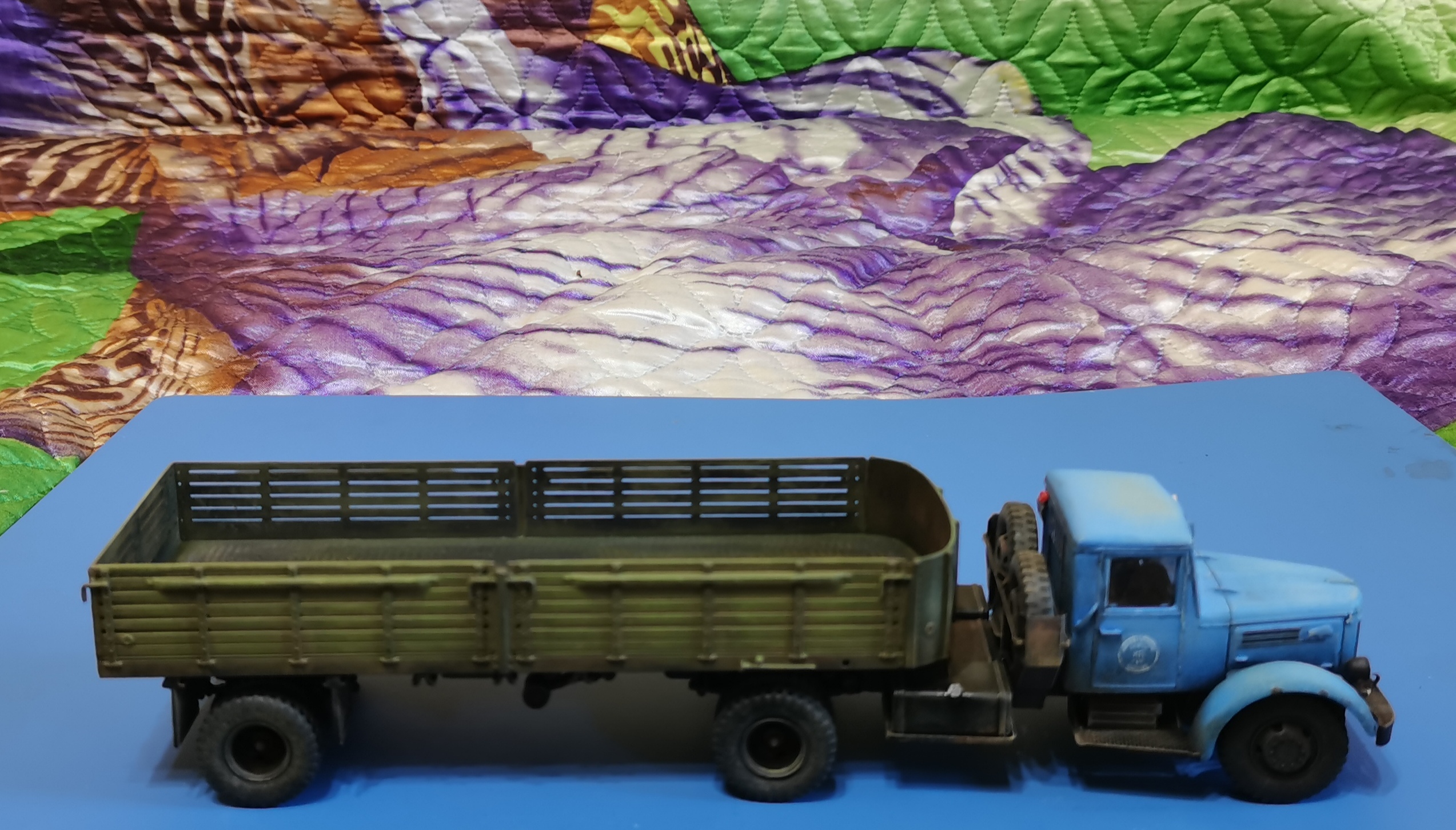 Дорогие Друзья! Представляю очередную работу автозавода, МАЗ-200В с п/п МАЗ-5215. Покраска проводилась кистью акрилом от Звезды, за исключением рам тягача и п/п XF-85 TAMIYA. Смывка мяслянные краски+растворитель для маслянных красок. В качестве пигмента использовал маслянную пастель "Сонет" Невская палитра. Глянцевый и матовый лаки в аэрозольных баллончиках TYTAN. Идею покраски подсмотрел на просторах интернет