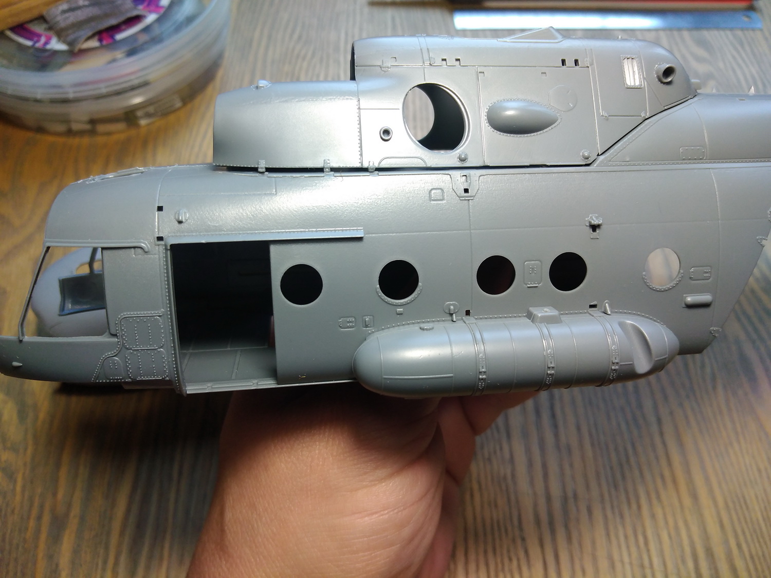 Так получилось, что основной мой заказчик изъявил желание получить Ми-8 в гражданской ливрее для установки в статичной экспозиции на аэродроме Орешково (Калужская обл.). Модель будет установлена на тумбе со стеклянным колпаком возле настоящего вертолёта. Условия "эксплуатации" данного экспоната будут "суровыми" по модельным меркам - мороз, жара и солнце. Поэтому необходима качественная склейка деталей, а покраска - там посмотрим, как он будет выгорать под солнцем... Именно поэтому в качестве исходника для конверсии выбрана модель от АМК из более прочного и жёсткого пластика. Устанавливаться будет на штырь и демонстрироваться в полётном варианте. А вот для себя гражданский буду делать позже из звездинского МТ, если к тому времени не сделают такую модификацию.