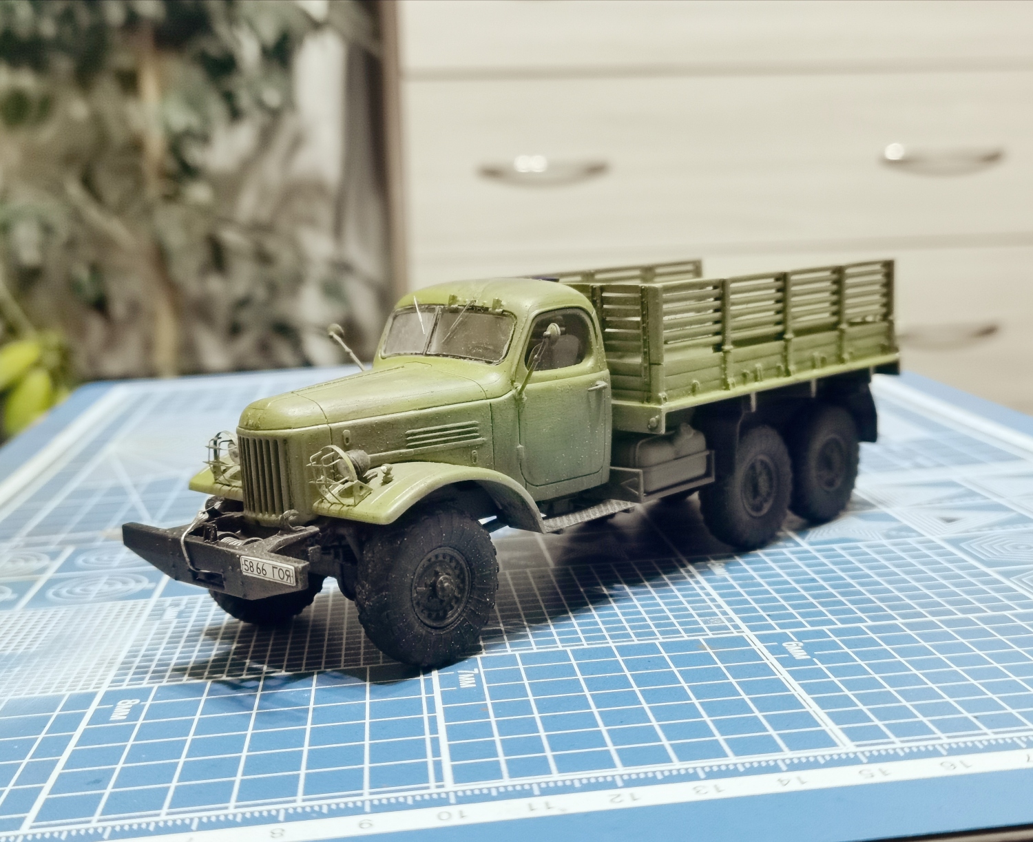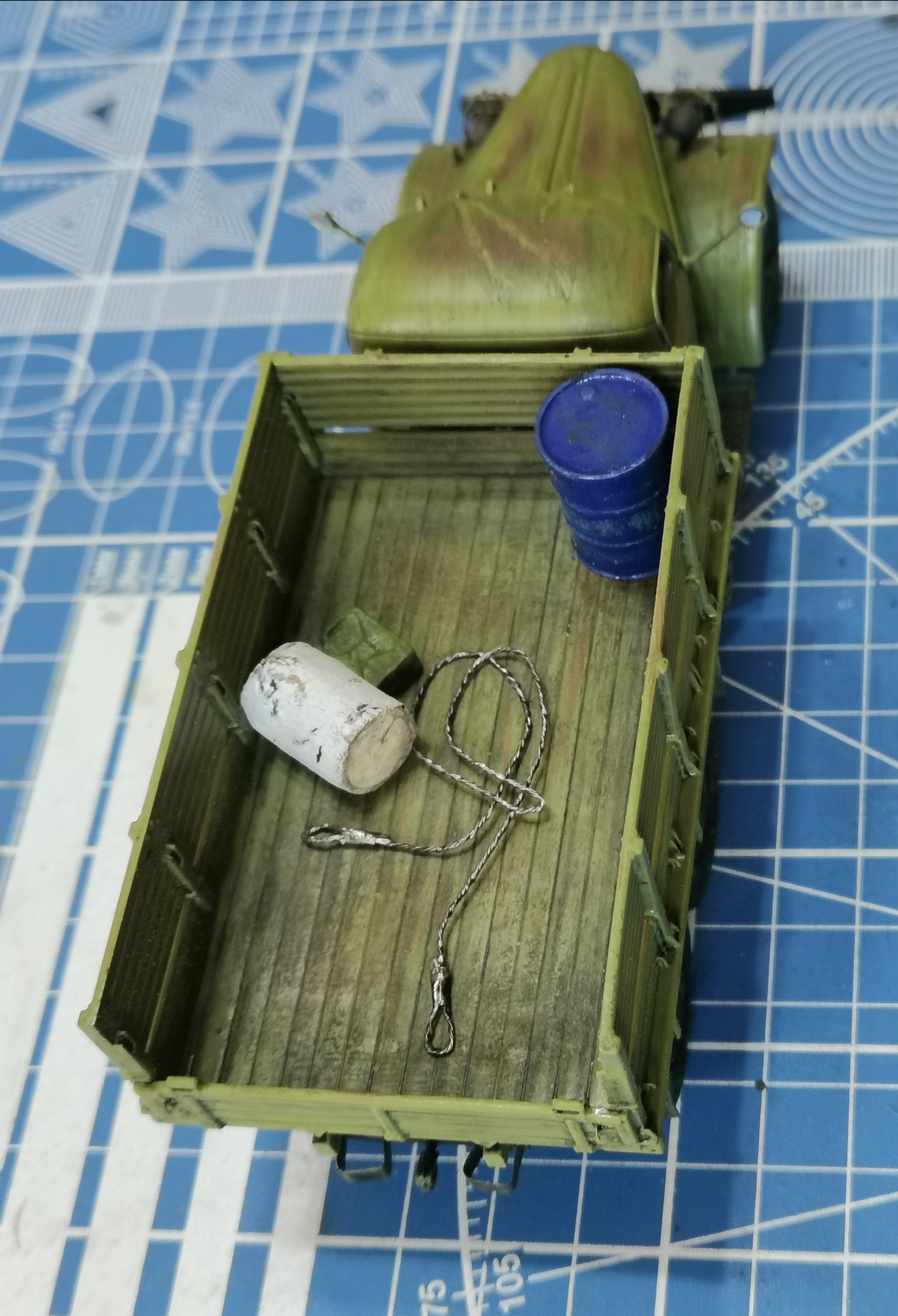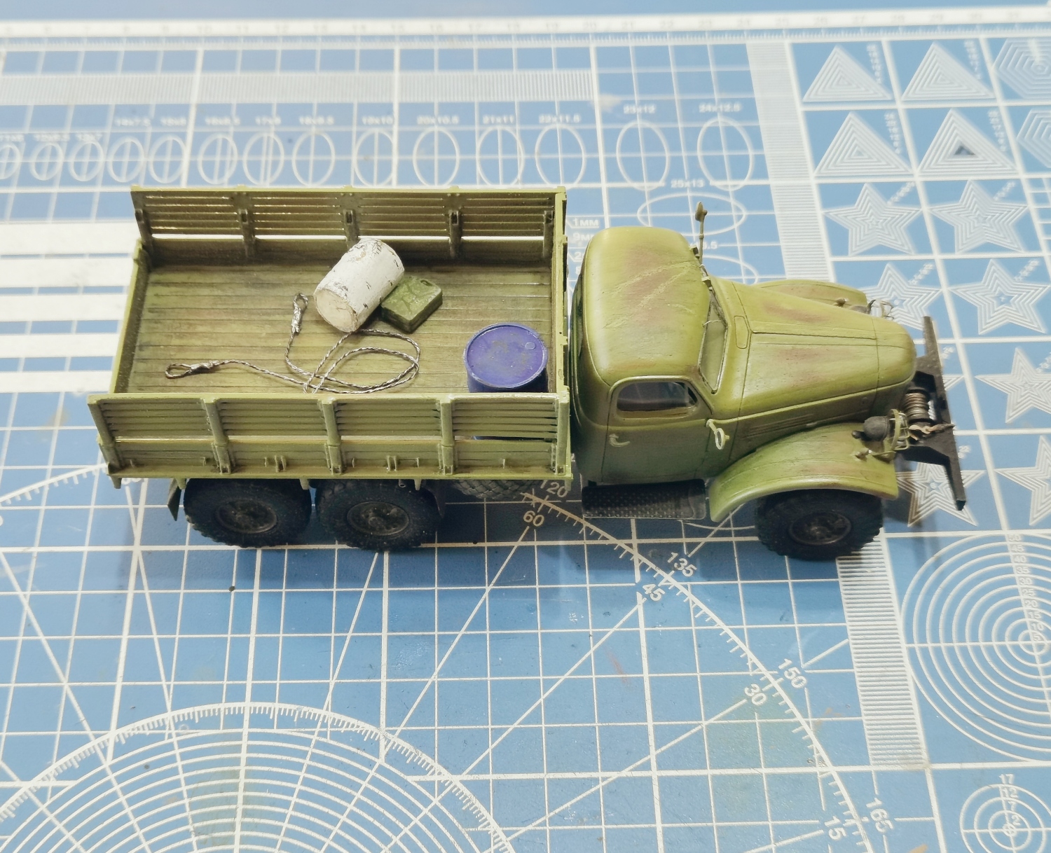 За прошедшее время поставил смотрелки и гос номера. Навёл небольшой антураж в кузове ЗИЛка. Берёзовая чурка, может кому-то показаться несколько великоватой и этот кто-то не ошибётся. По задумке она предназначена не для дров, а для хозяйства. К примеру рубки на ней мяса.