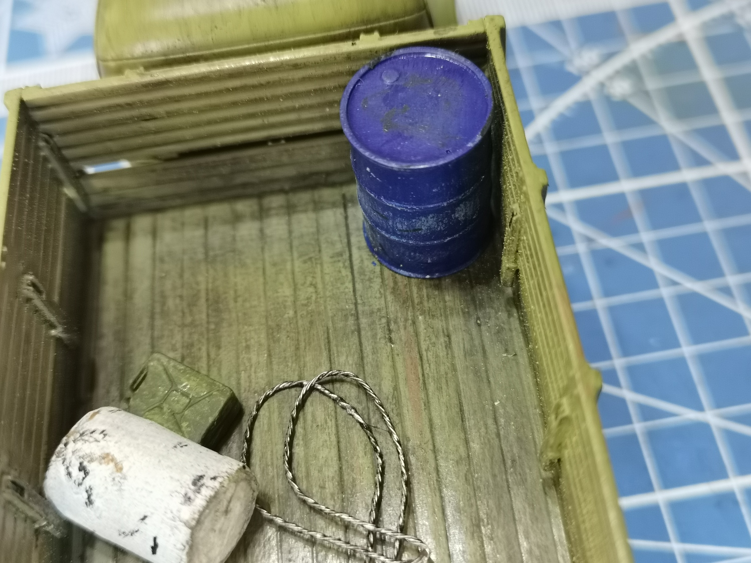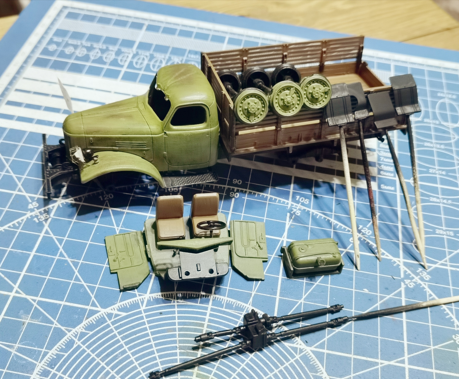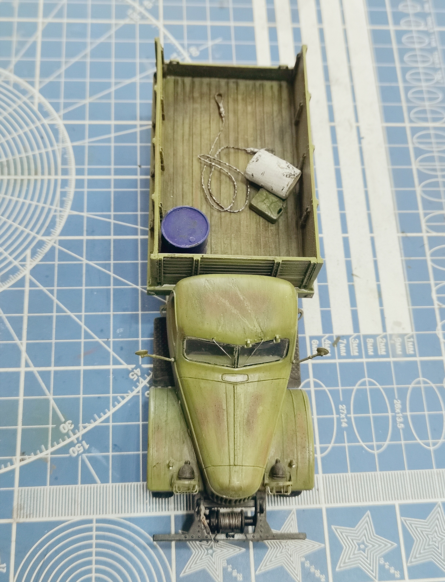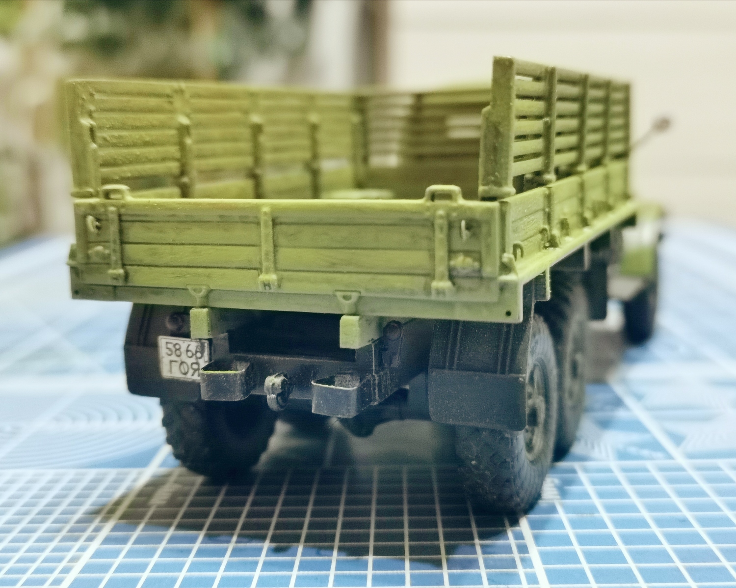За прошедшее время поставил смотрелки и гос номера. Навёл небольшой антураж в кузове ЗИЛка. Берёзовая чурка, может кому-то показаться несколько великоватой и этот кто-то не ошибётся. По задумке она предназначена не для дров, а для хозяйства. К примеру рубки на ней мяса.
