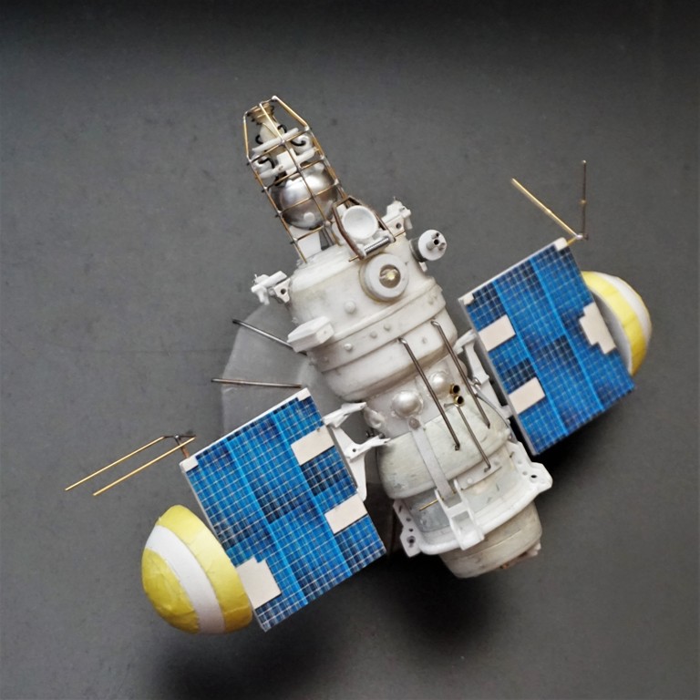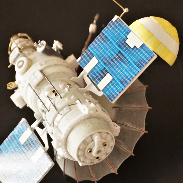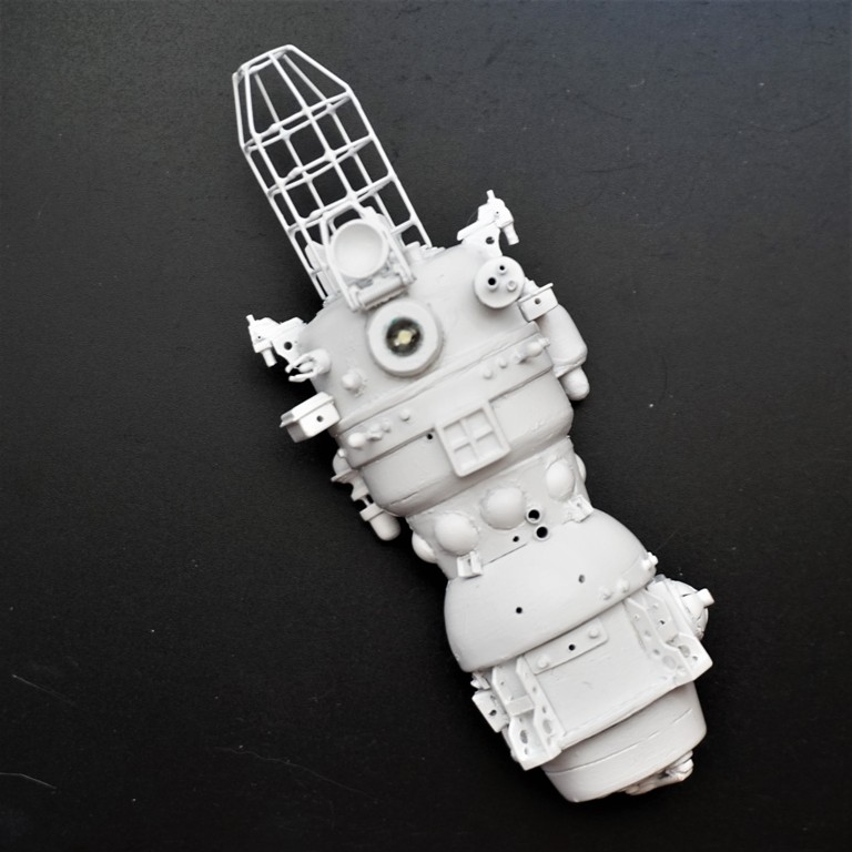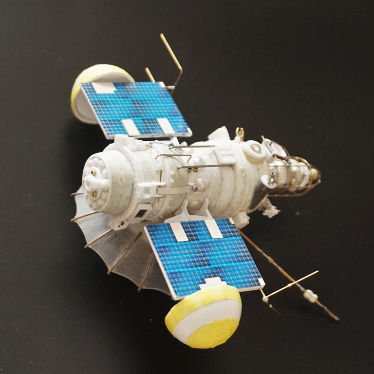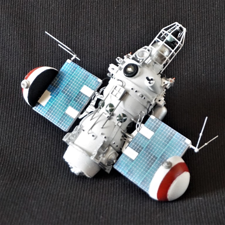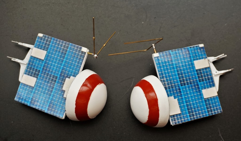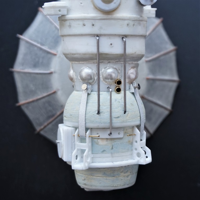 Произведена окраска корпуса станции, солнечных панелей и полусфер радиаторов. При помощи проволочного припоя на солнечных панелях уложены трубопроводы системы охлаждения, из литника и проволоки, латунной трубки изготовлены всенаправленные антенны, которые установлены на штатные места на полусферах радиаторов.