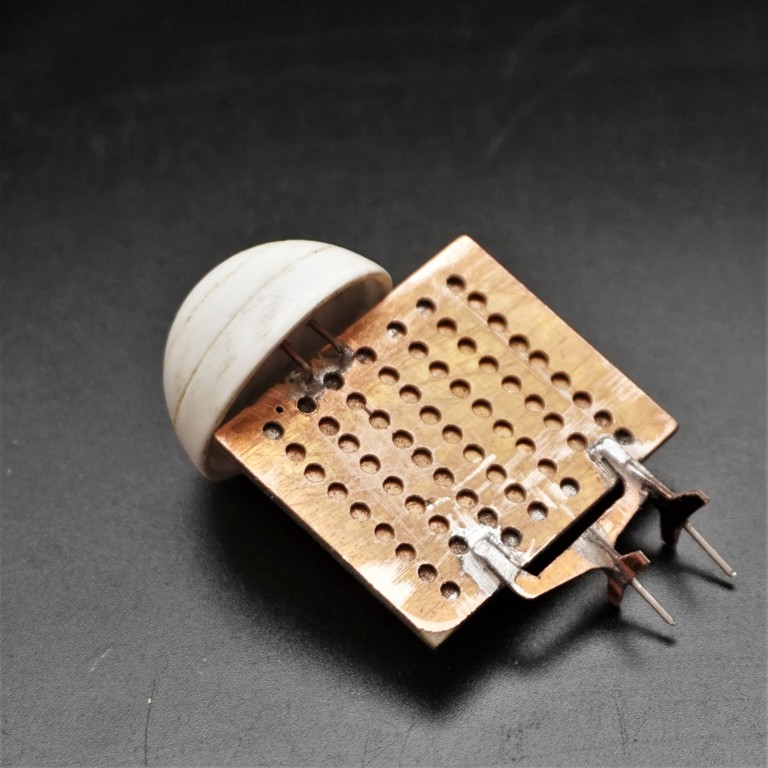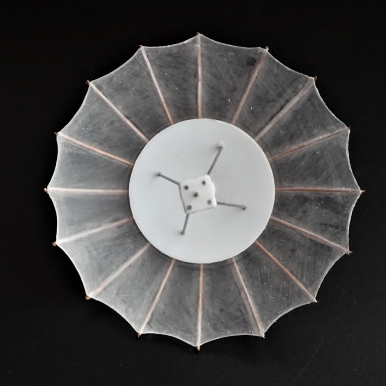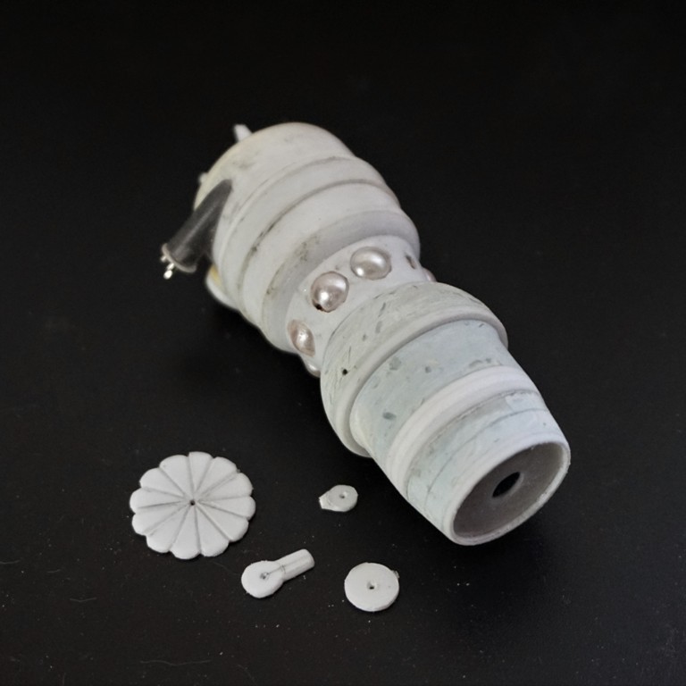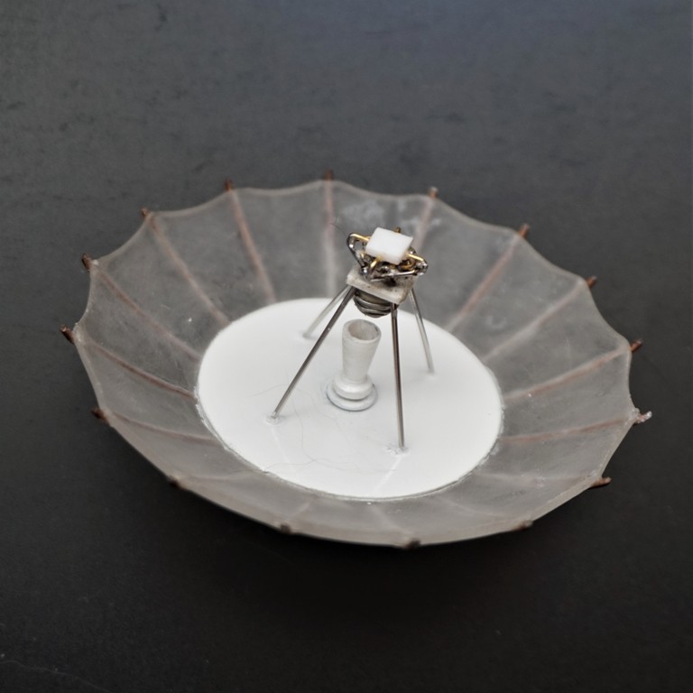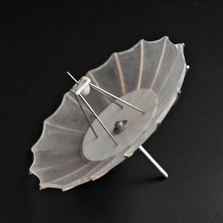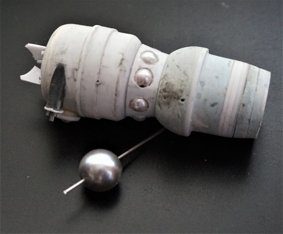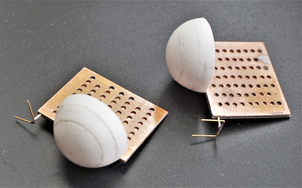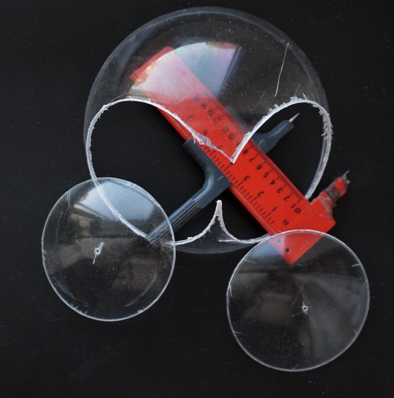 Следом пошло изготовление полусфер радиаторов системы терморегулирования станции. Здесь был использован метод термопластичного формования детали . Матрицей послужила крышка от шампуня, пуансоном шарик Ф25мм от дезодоранта. Пластинка листового пластика разогревалась над плиткой, после чего производилось термоформование. После обрезки лишнего материала и вклеивания днища получены два радиатора.
