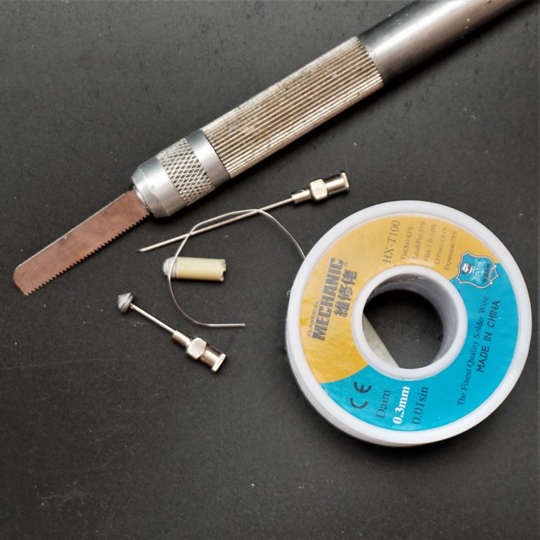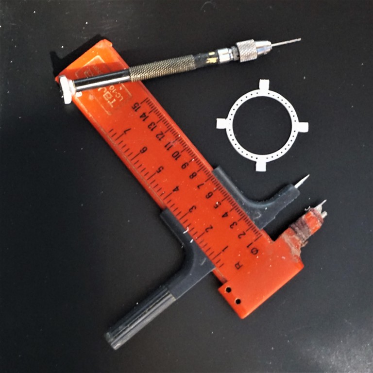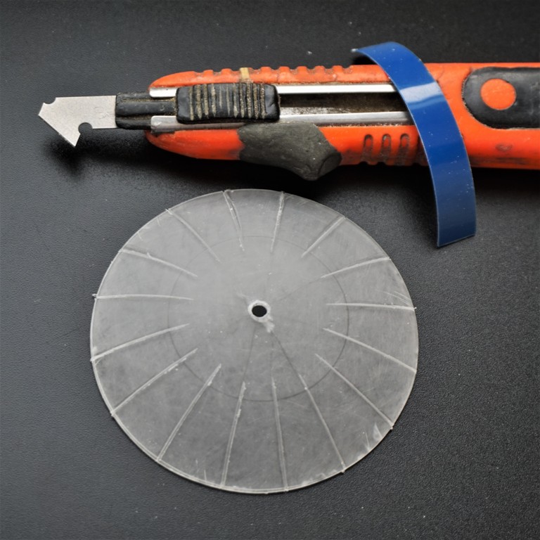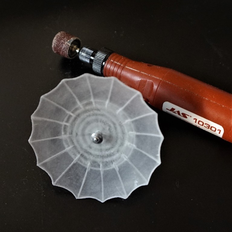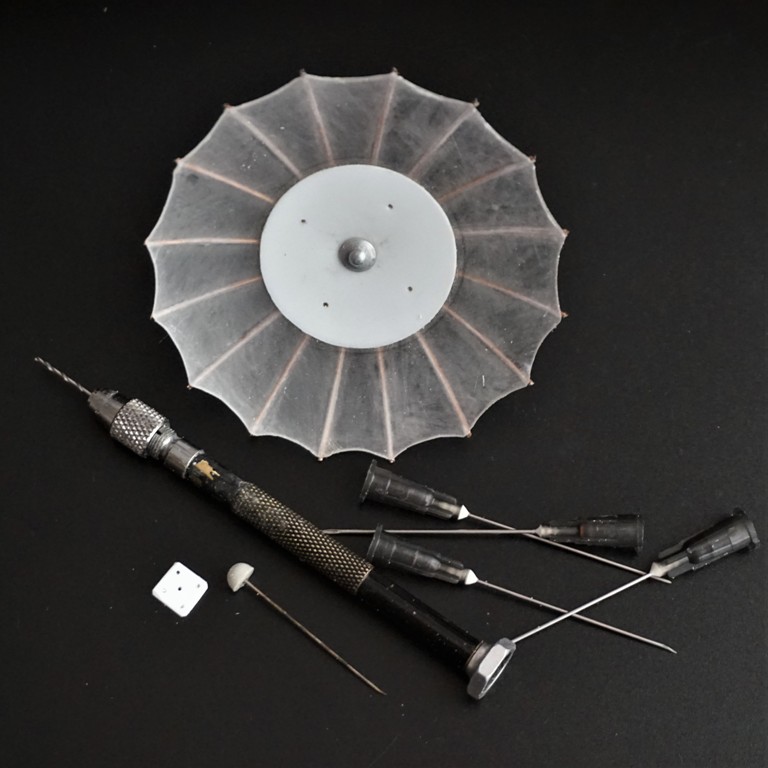 Далее идет изготовление зеркала остронаправленной параболической антенны. Зеркало вырезается при помощи циркульного ножа из пластикового поделочного шара Ф120мм, приобретенного в Леонардо, После вырезки при помощи шлифмашинки обрабатывается кромка зеркала, поверхность его матируется шкуркой, По прорисованной разметке скрайбером прорезаются канавки, в которые вклеиваются зонтичные спицы антенны. А далее из инъекционных игл, листового пластика и латунной трубки изготовлен излучатель антенны.