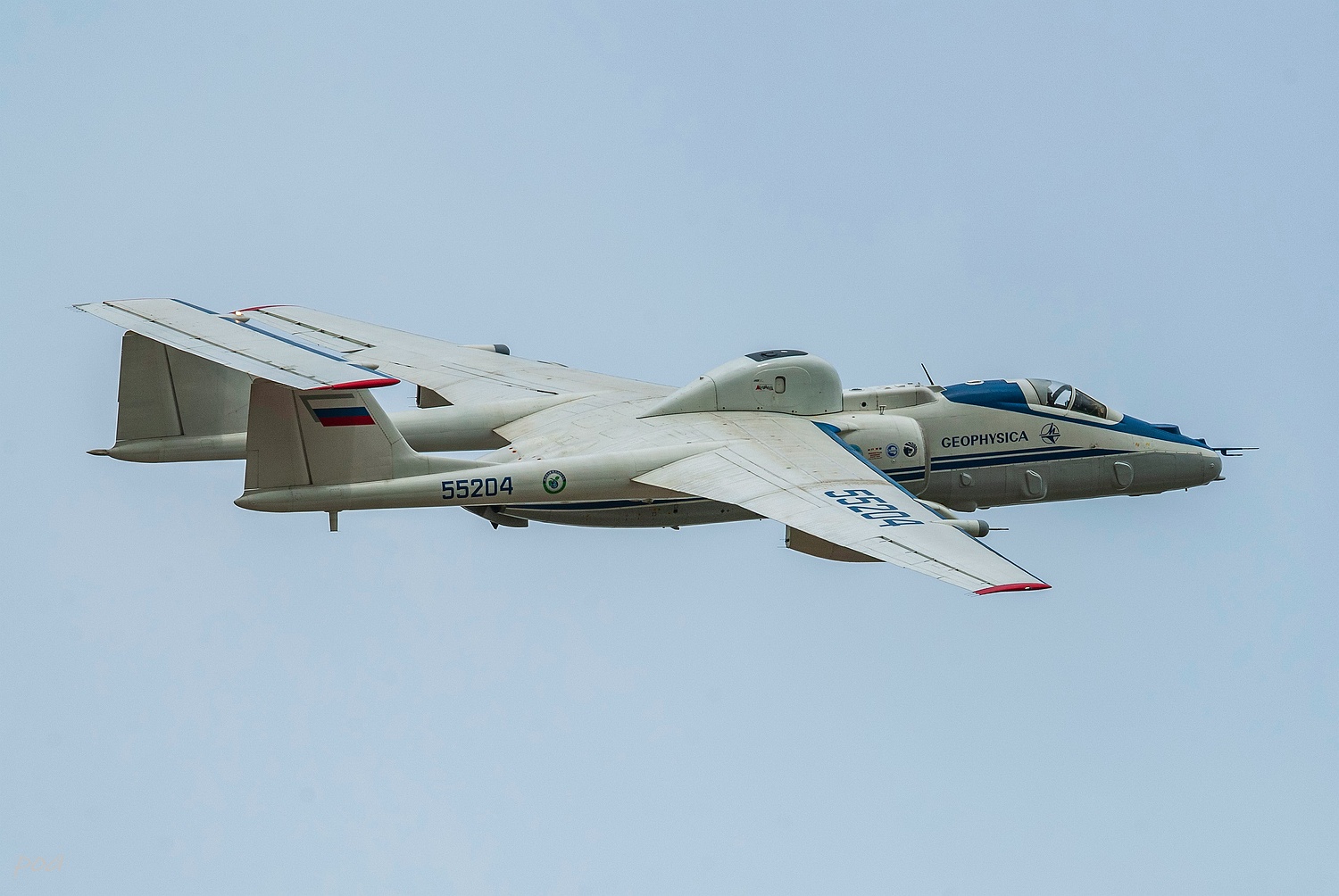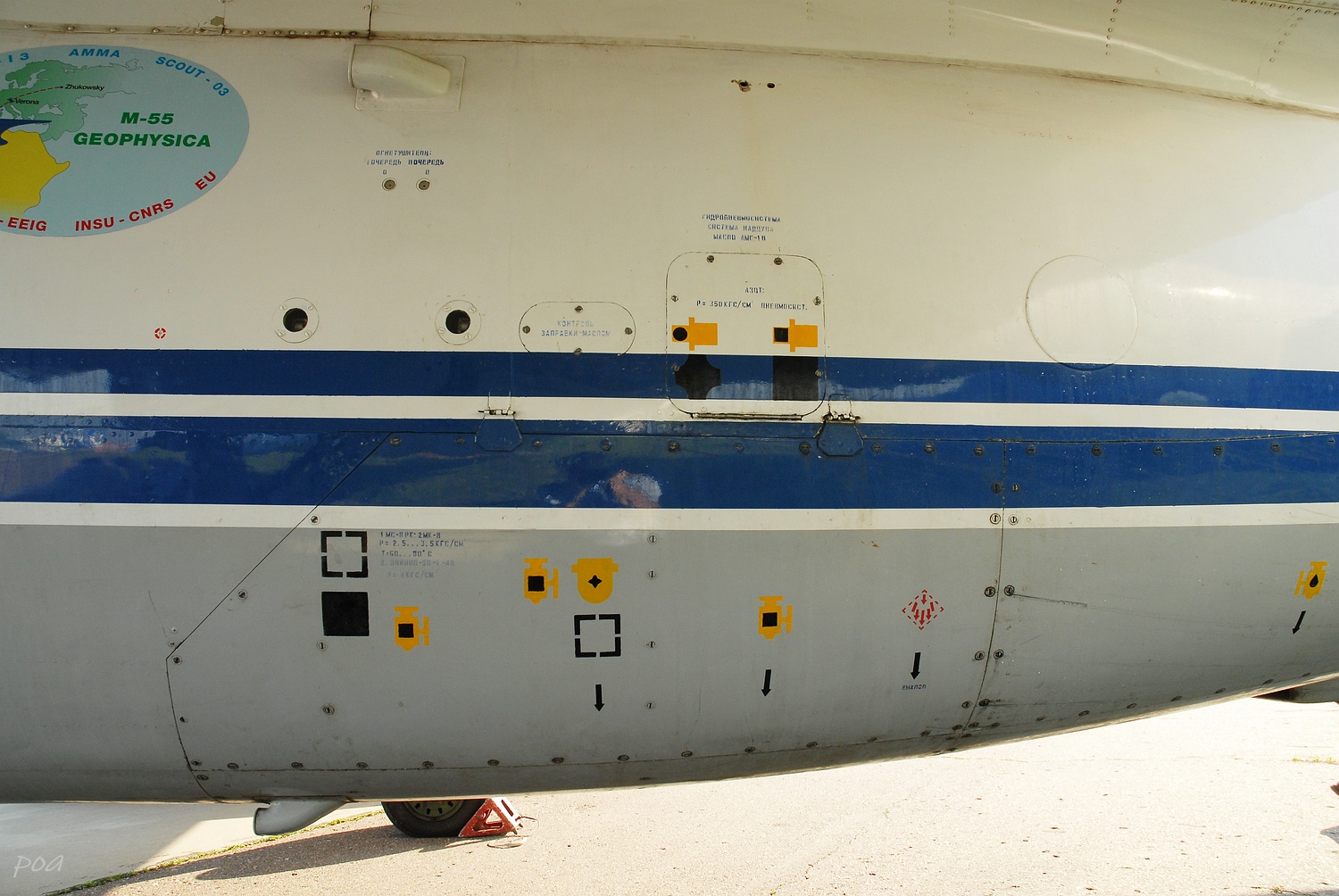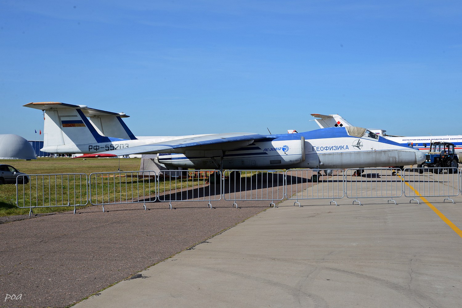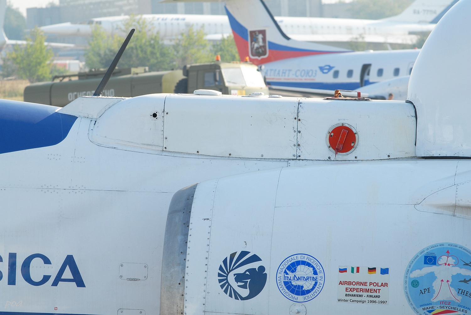 Борт РФ-55204 чтобы как-то выжить при отсутствии финансирования руководство КБ было вынуждено использовать в коммерческих целях. Самолет начал посещать международные аэрокосмические салоны и участвовать в исследованиях атмосферы земли в различных регионах мира. Когда самолет готовили к очередному зарубежному турне название на русском заменили на "Geophysica", а аббревиатуру РФ убрали оставив только 55204 т.к. особо дотошливые европейцы задались вопросом: "а почему у вас "РФ", а не "RA" как у гражданских воздушных судов Российйской Федерации? Это военный самолет?"